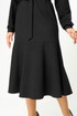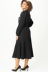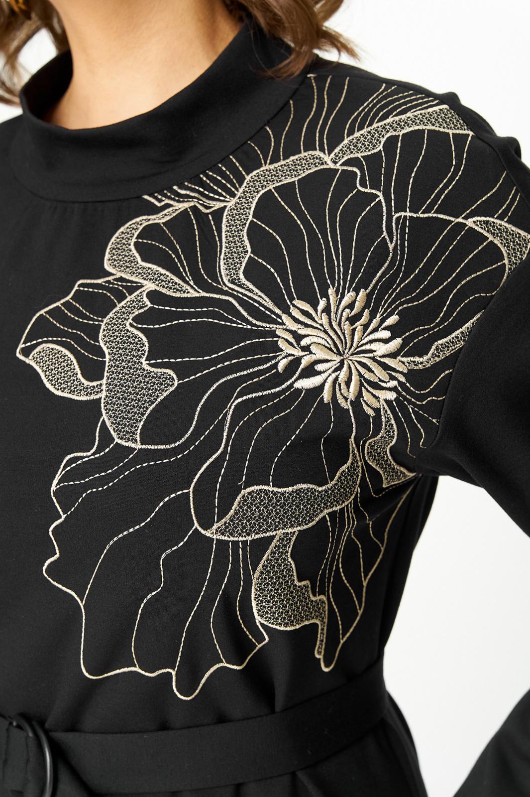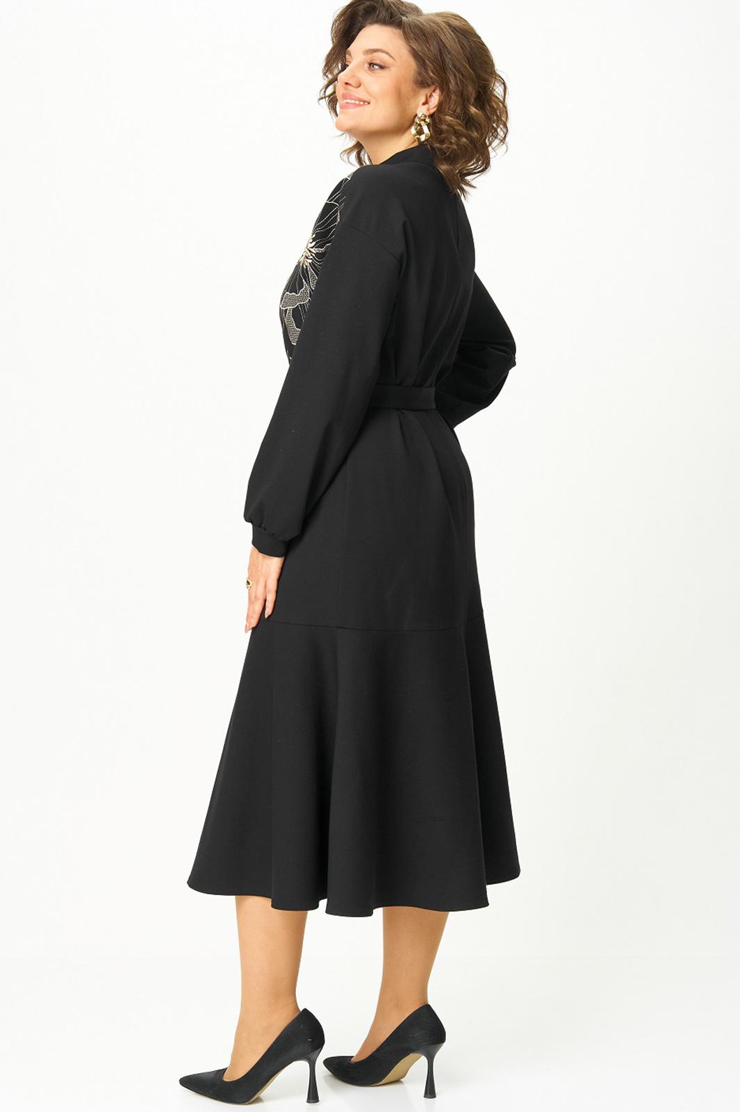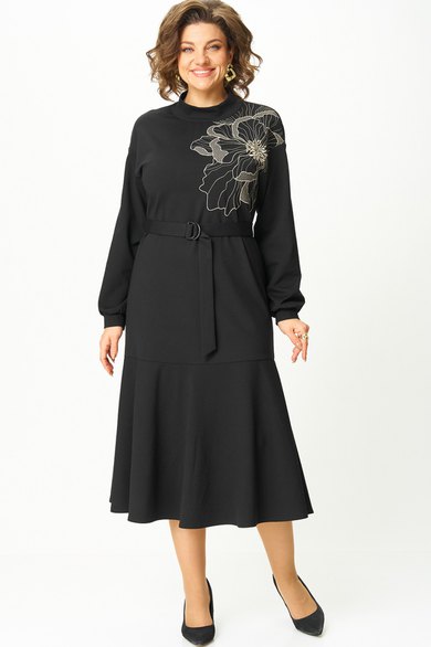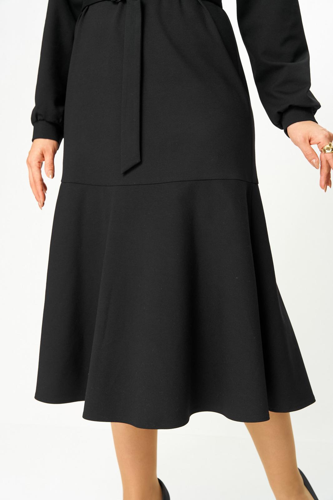 Платье из трикотажного полотна прямого силуэта со спущенной линией плеча, воланом по низу. Спинка со средним швом и застежкой на «молнию» в верхней части и по стойке. Рукав втачной одношовный на притачной манжете. Вырез горловины круглый. Воротник стойка. Есть съемный пояс из основной ткани с пряжкой.