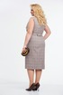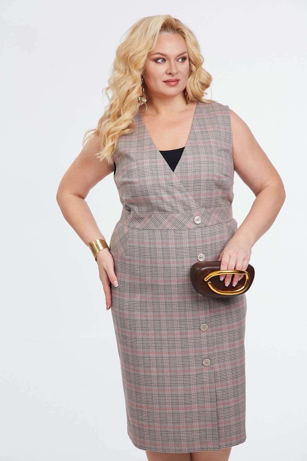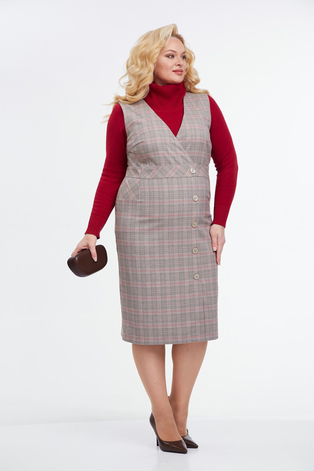 Сарафан из костюмной ткани полуприлегающего силуэта с имитацией запаха на переде и застежкой -«молнией» в среднем шве спинки. Перед с отрезным бочком, лифом, втачным поясом, имитацией застежки на пуговицы. Вырез горловины V-образный по переду и спинке. Притачные концы пояса закрепляются пряжкой на спинке.