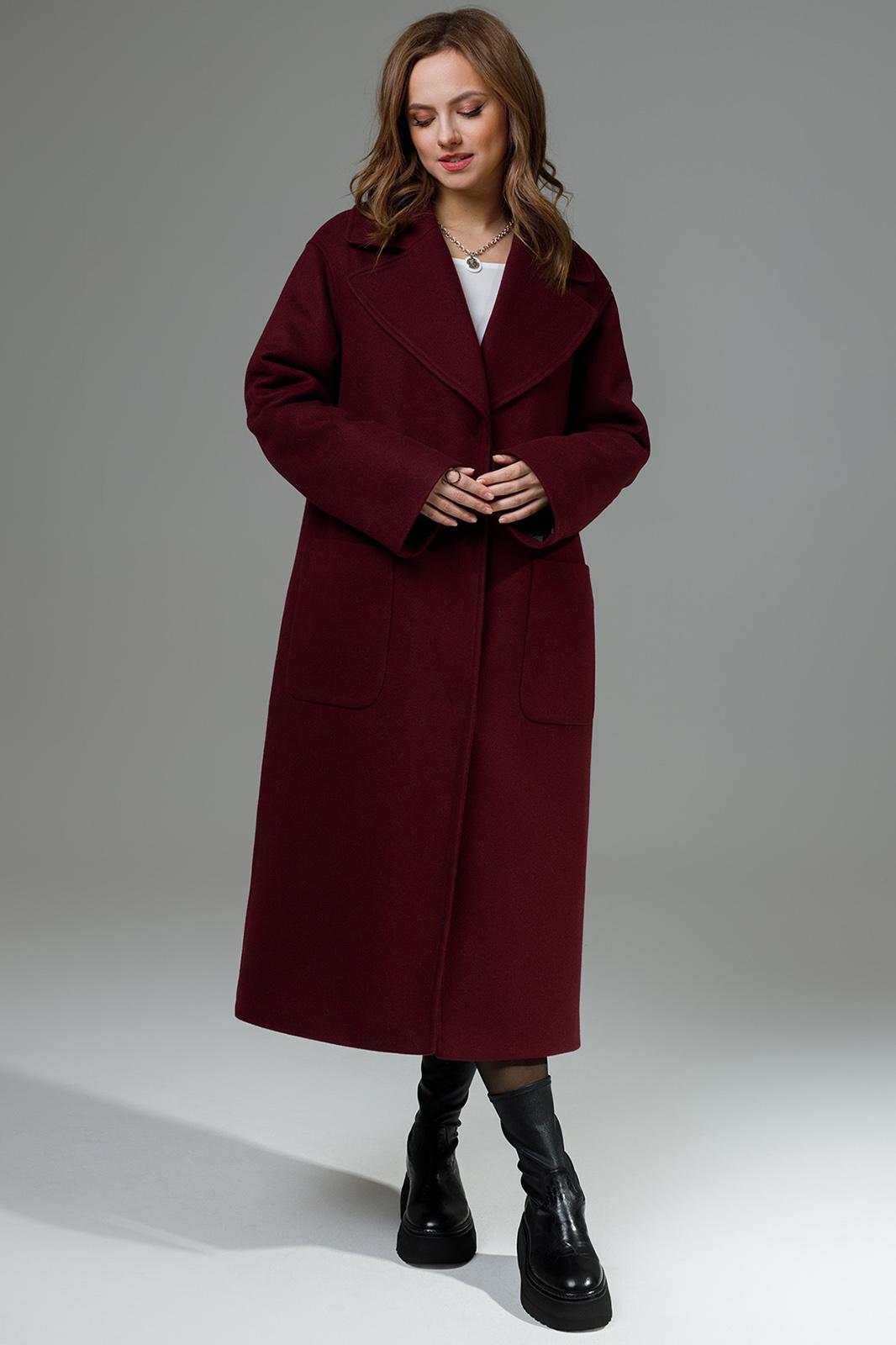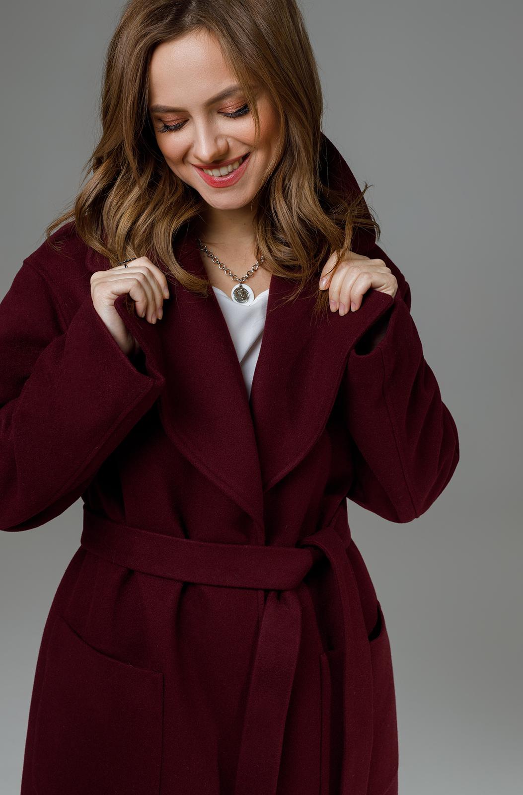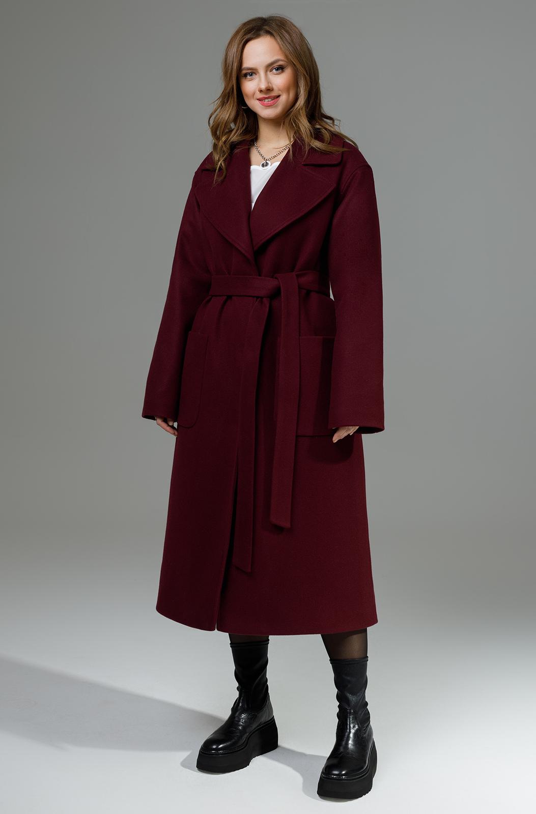 Пальто свободного силуэта с накладными карманами. Пиджачный воротник, втачной длинный рукав, центральная застежка на потайные кнопки. Спинка со средним швом со шлицей. Пояс в комплекте. Пальто на подкладке.