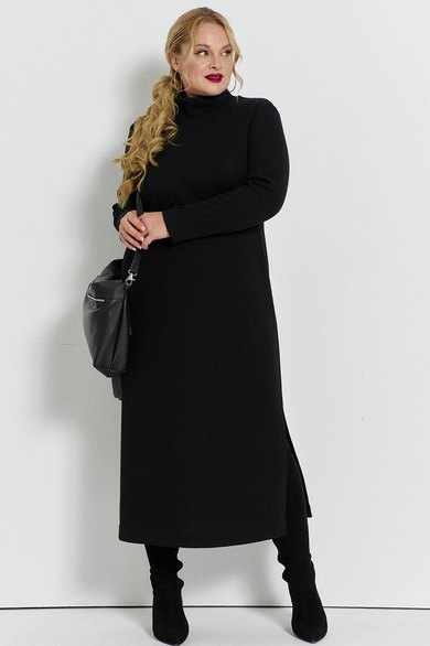 Трикотажное платье с воротником-стойкой. На деталях переда нагрудные вытачки, в боковых швах разрезы.