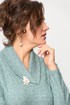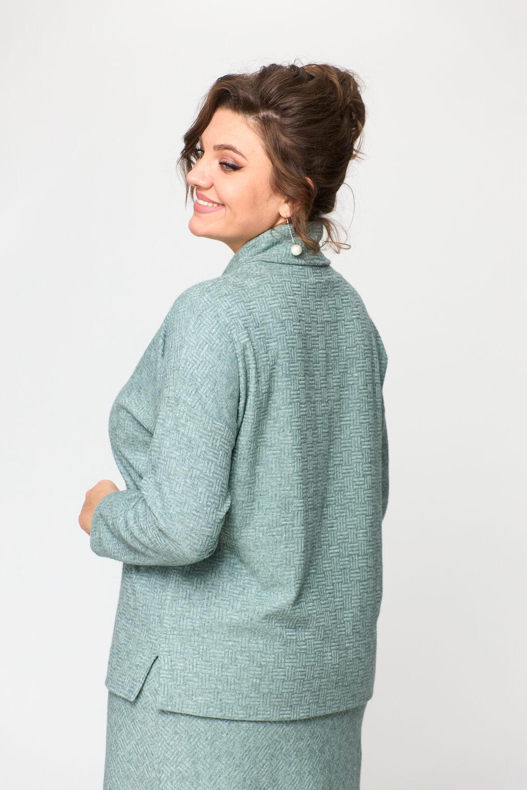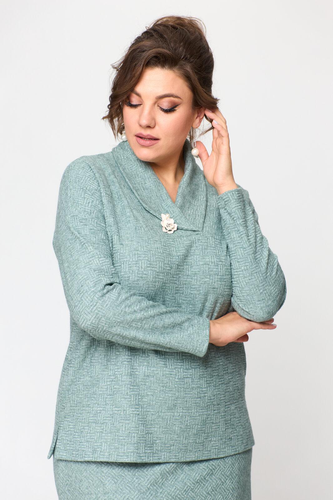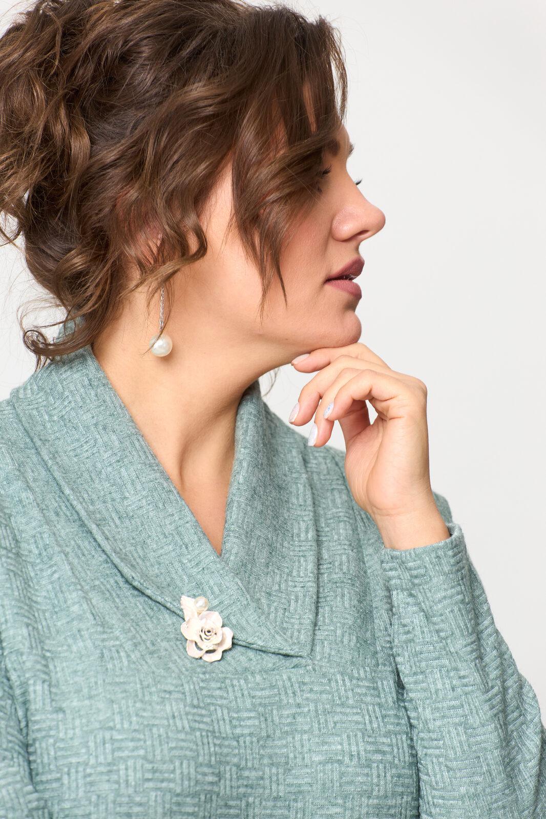 Уютный джемпер из мягкого «структурного» трикотажного полотна свободного силуэта. Воротник с глубоким запахом и складкой переходит в планку на груди. Рукав зауженный длинный. По бокам невысокие разрезы. На воротнике декоративная брошь.