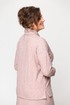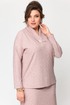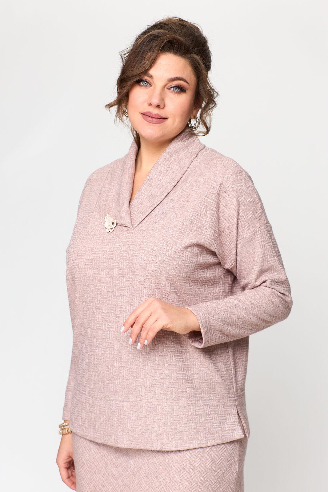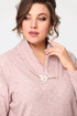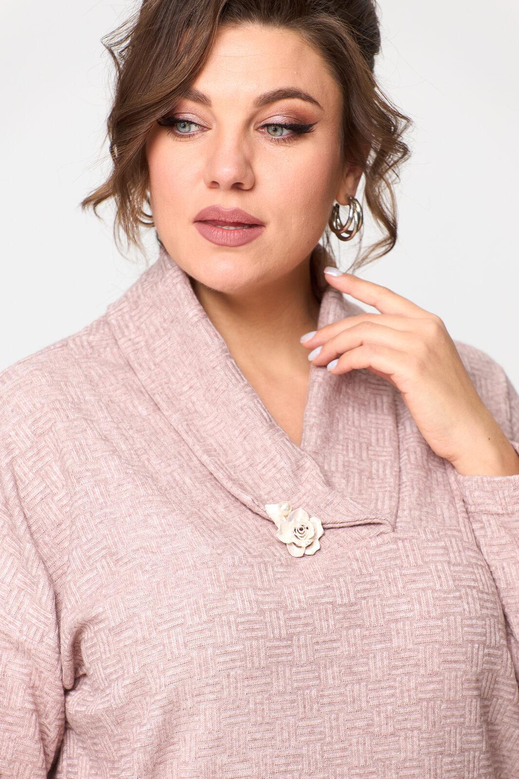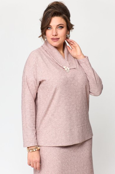 Уютный джемпер из мягкого «структурного» трикотажного полотна свободного силуэта. Воротник с глубоким запахом и складкой переходит в планку на груди. Рукав зауженный длинный. По бокам невысокие разрезы. На воротнике декоративная брошь.
