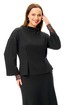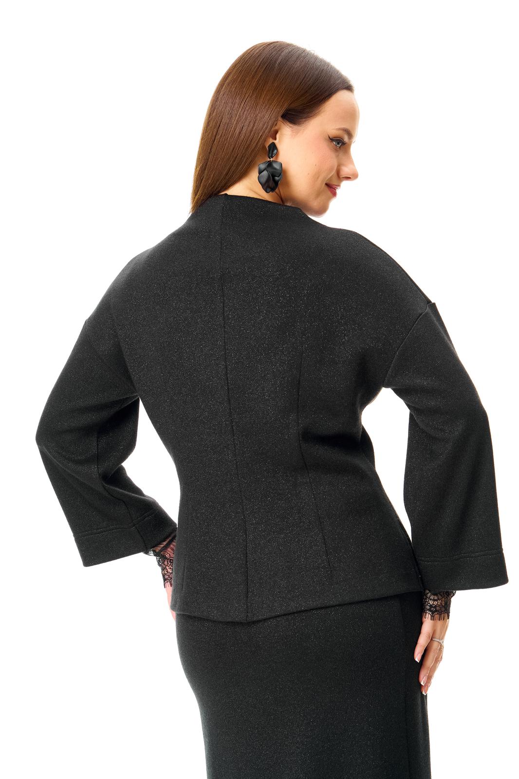 Джемпер свободного силуэта из однотонного трикотажного полотна с неярким блеском «люрекс». Горловина цельная «стойка». Плечо спущено. Рукав 3/4. По переду притален складками. Съемные кружевные манжеты добавляют страсти образу. Стильная булавка убережет от сглаза.