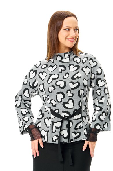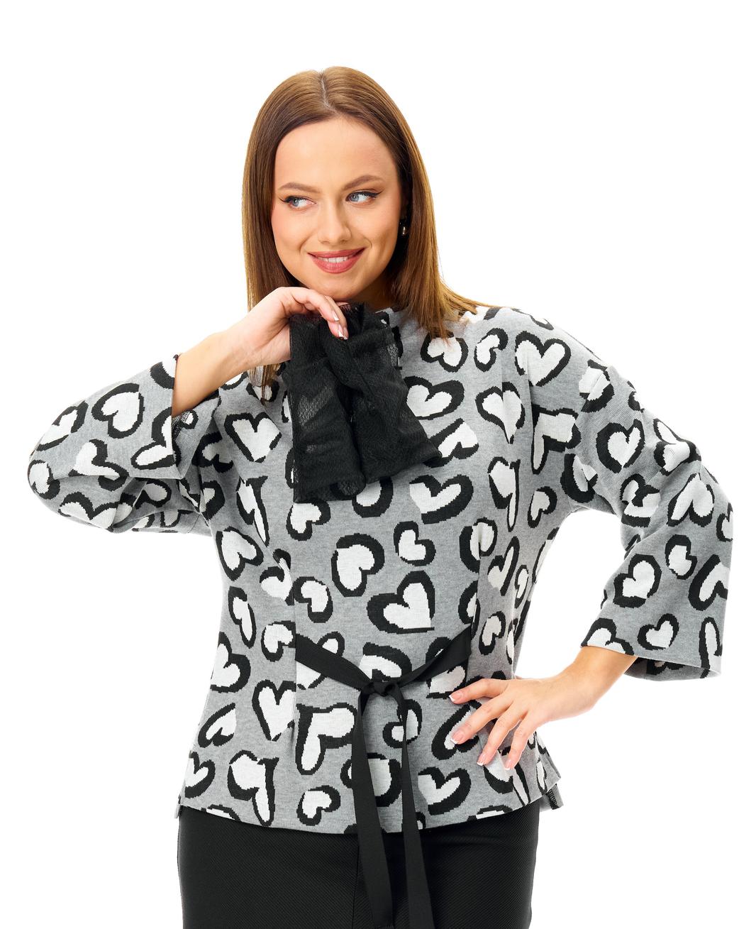 Джемпер полуприлегающего силуэта из качественного турецкого трикотажного полотна с актуальным дизайном «сердечки». Горловина цельная «стойка». Плечо спущено. Рукав 3/4. По переду притален складками, а так же есть возможность затянуть талию лентами, завязав их по переду. Низ джемпера разноуровневый: спинка длиннее переда. Съемные манжеты из «сетки».