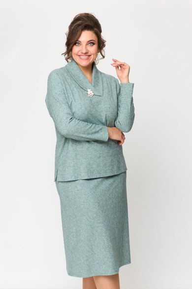 Уютный джемпер свободного силуэта. Воротник с глубоким запахом и складкой переходит в планку на груди. Рукав зауженный длинный. По бокам невысокие разрезы. На воротнике декоративная брошь.