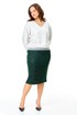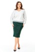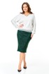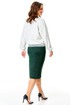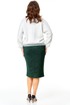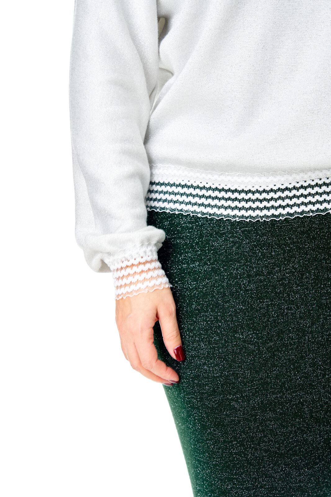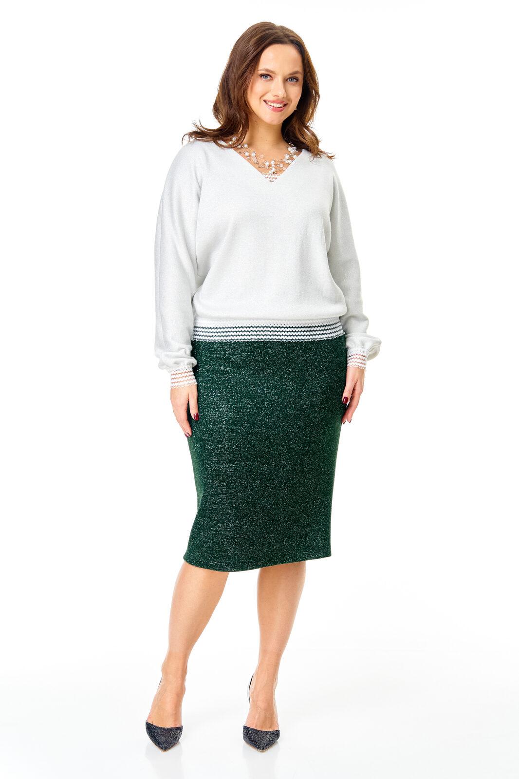 Трикотажный комплект в сочетании белого и изумрудного цвета с серебристой люрексовой нитью: зауженная юбка и свободный джемпер с декоративными кружевными манжетами и планкой.
