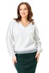 Мягкий уютный джемпер из трикотажа с блеском свободного силуэта, не приталенный. Горловина V-образная с ажурной вставочкой. Рукав длинный цельнокроеный, зауженный к низу, собран на кружевную манжетку. По низу джемпера эластичная кружевная тесьма-планка.