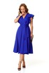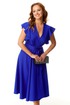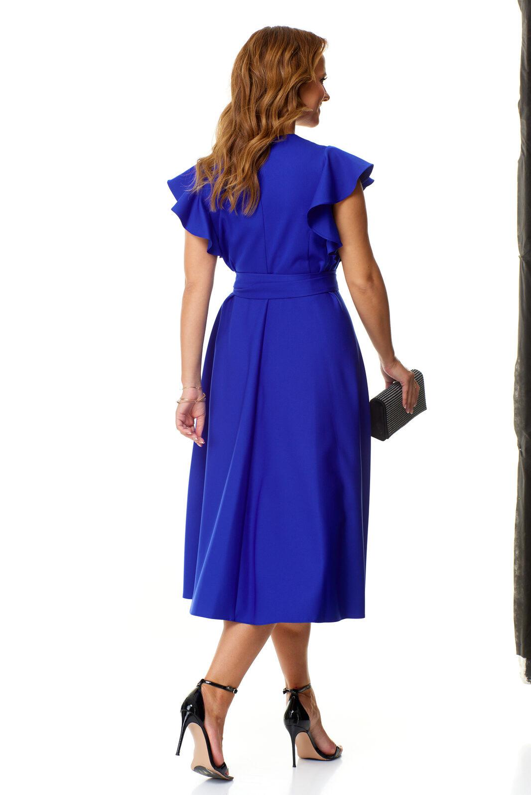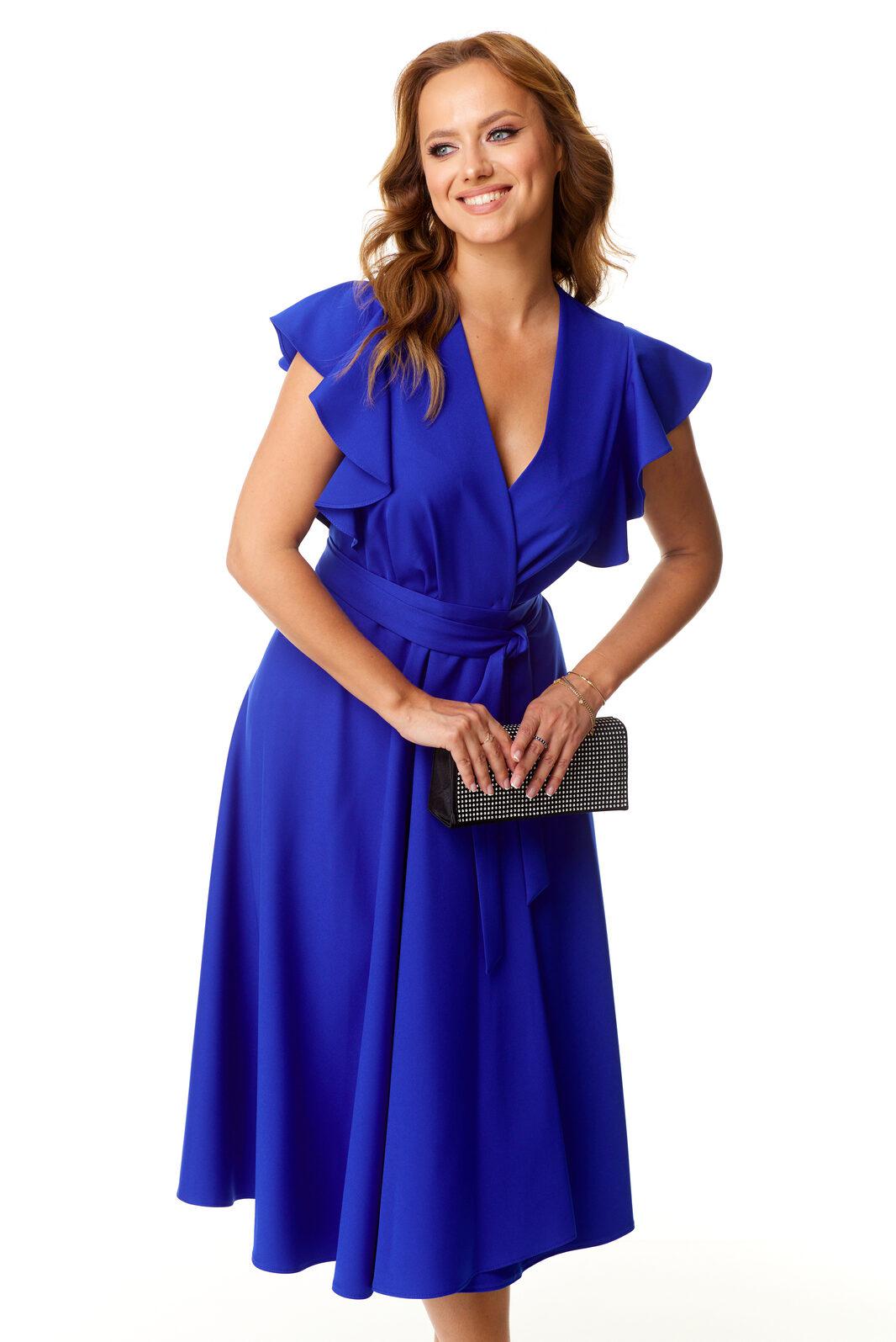 Элегантное соблазнительное платье из плотной непрозрачной ткани, отрезное по талии. Застегивается на две потайные кнопки с глубоким запахом. По спинке средний шов. Плечо прикрывает волан. Юбка «полусолнце» распахивается по переду. Пояс съемный длинный.