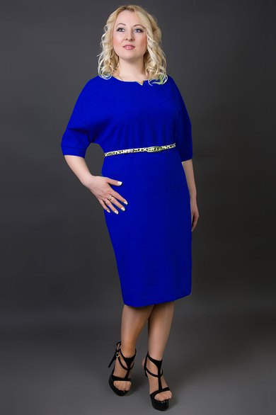 Платье женское прямого силуэта, длиной 108 см, с цельнокроеными рукавами длиной от горловины 40 см. и съемным поясом из искусственной кожи. Горловина платья округлой формы с «V» - образным вырезом спереди по центру, украшена пришивной фурнитурой. По низу рукавов – манжеты.