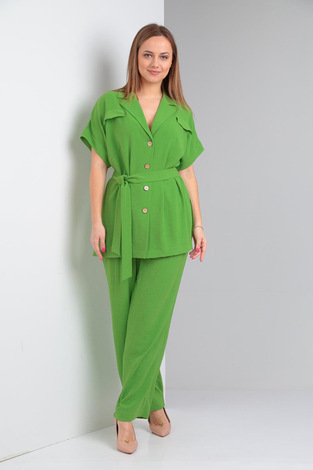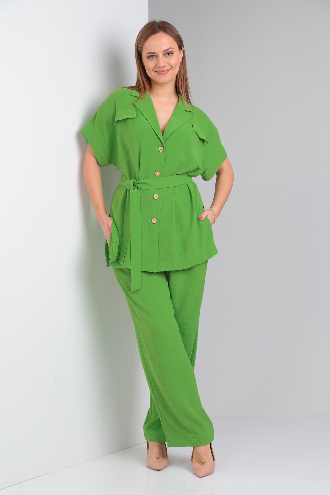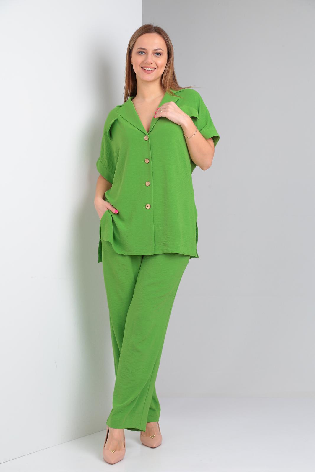 Комплект состоит из блузона-рубашки и брюк. Блузон прямого силуэта с застежкой по центру на петли-пуговицы. Воротник отложной с бортами. На груди декоративные клапаны. В боковых швах глубокие разрезы. Линия плеча спущена с притачным манжетом. Жакет с мягким поясом. По центру спинки декоративная вставка-пата, через которую продевается пояс. Брюки прямые, на поясе. Задняя часть пояса фиксируется эластичной тесьмой. Застежка на молнии. В боковых швах карманы.