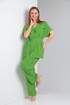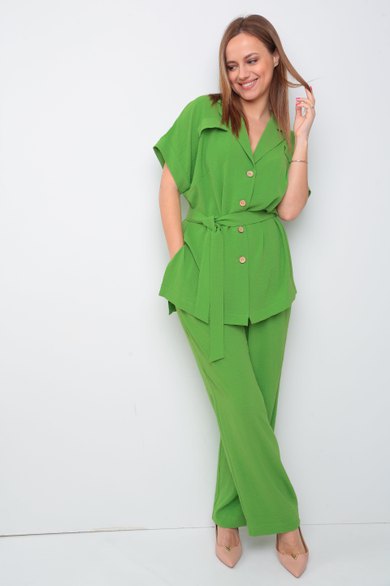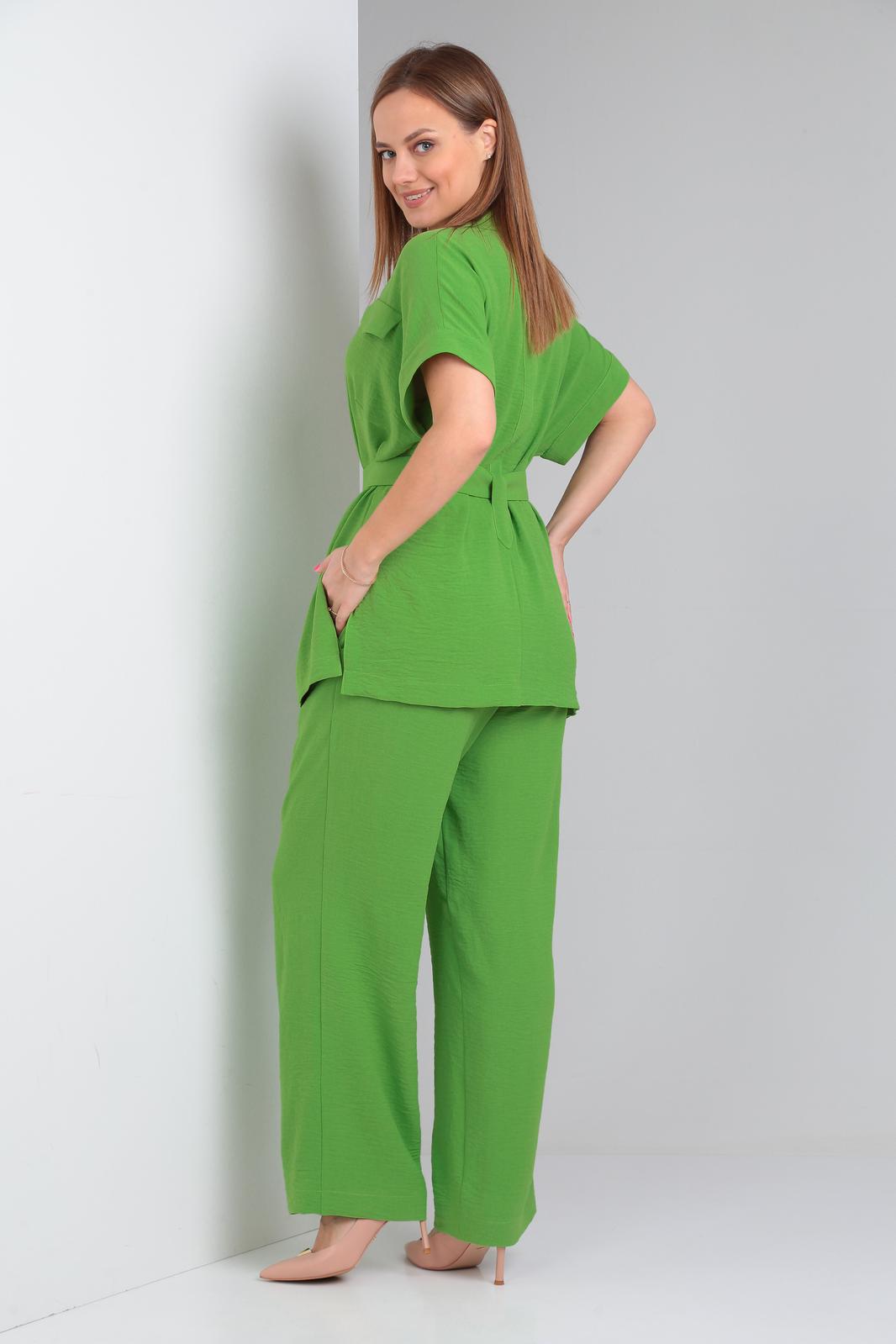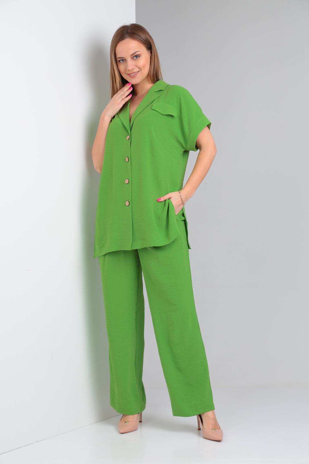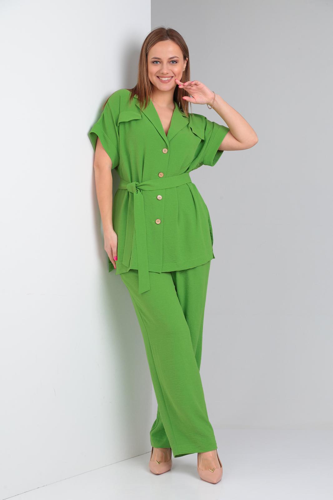 Комплект состоит из блузона-рубашки и брюк. Блузон прямого силуэта с застежкой по центру на петли-пуговицы. Воротник отложной с бортами. На груди декоративные клапаны. В боковых швах глубокие разрезы. Линия плеча спущена с притачным манжетом. Жакет с мягким поясом. По центру спинки декоративная вставка-пата, через которую продевается пояс. Брюки прямые, на поясе. Задняя часть пояса фиксируется эластичной тесьмой. Застежка на молнии. В боковых швах карманы.