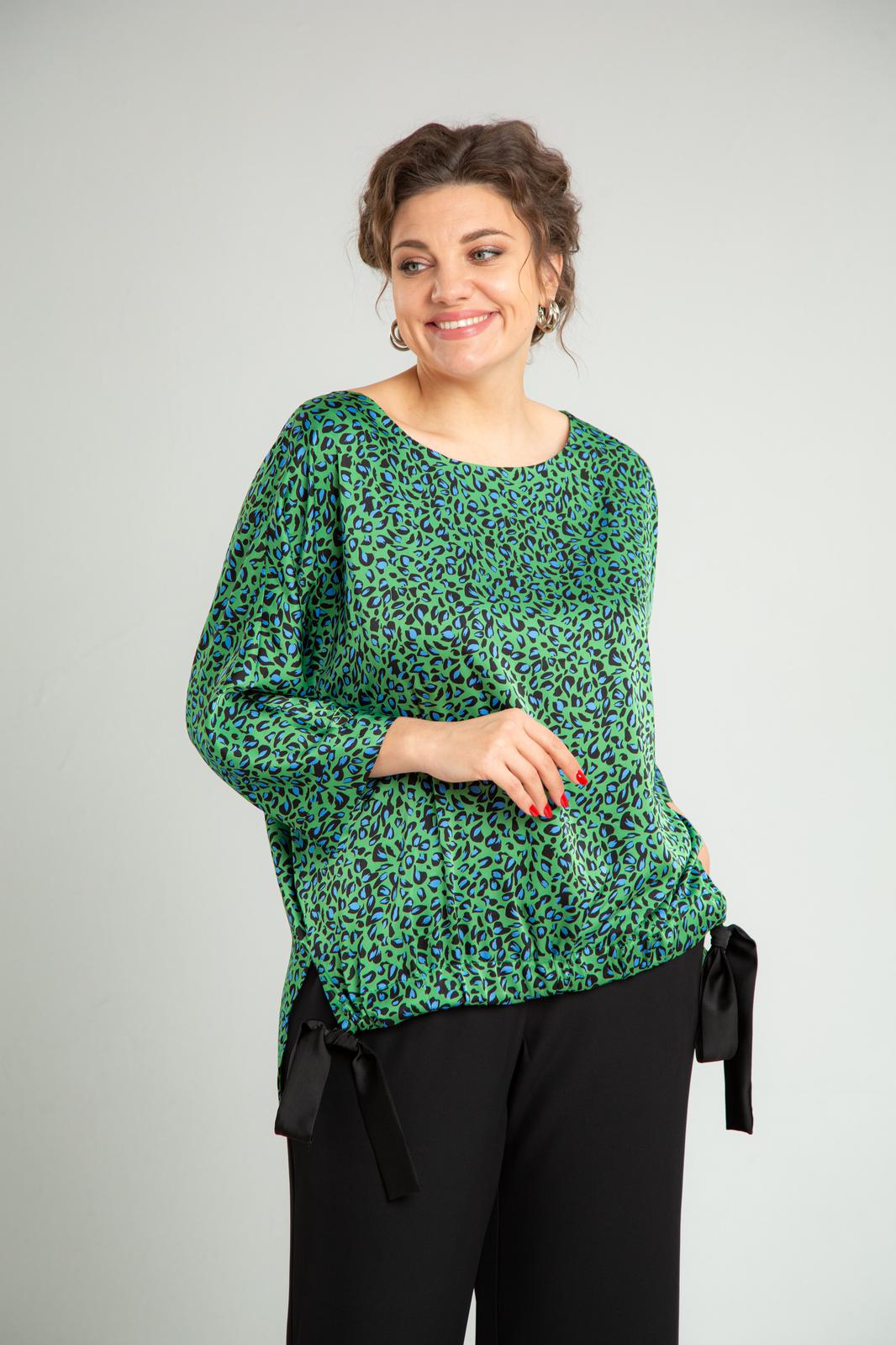Комплект женский нарядный двойка, состоит из блузона свободного покроя и брюк. Блузон из плательно-костюмной ткани типа атлас с принтом. По спинке средний шов, перед цельный, горловина округлой формы обработана обтачкой. В боковых швах разрезы, линия низа переда и спинки ассиметричны. Низ переда стягивается отделочным поясом. Рукав 3/4 типа летучая мышь, по низу манжета. Брюки свободного покроя, прямые к низу, с поясом на резинке, в боковых швах функциональные карманы.