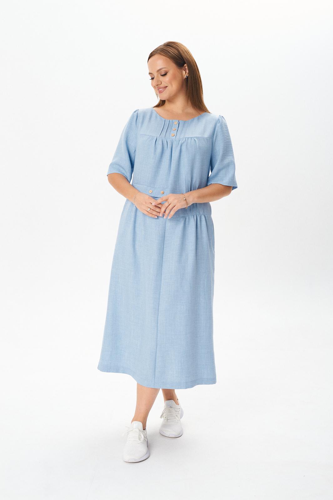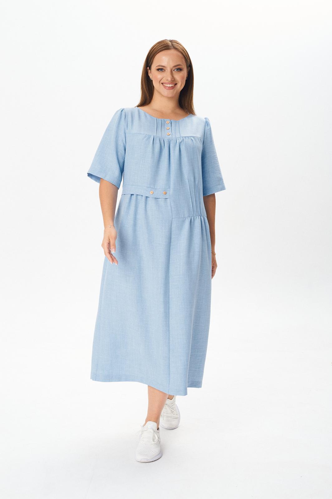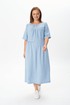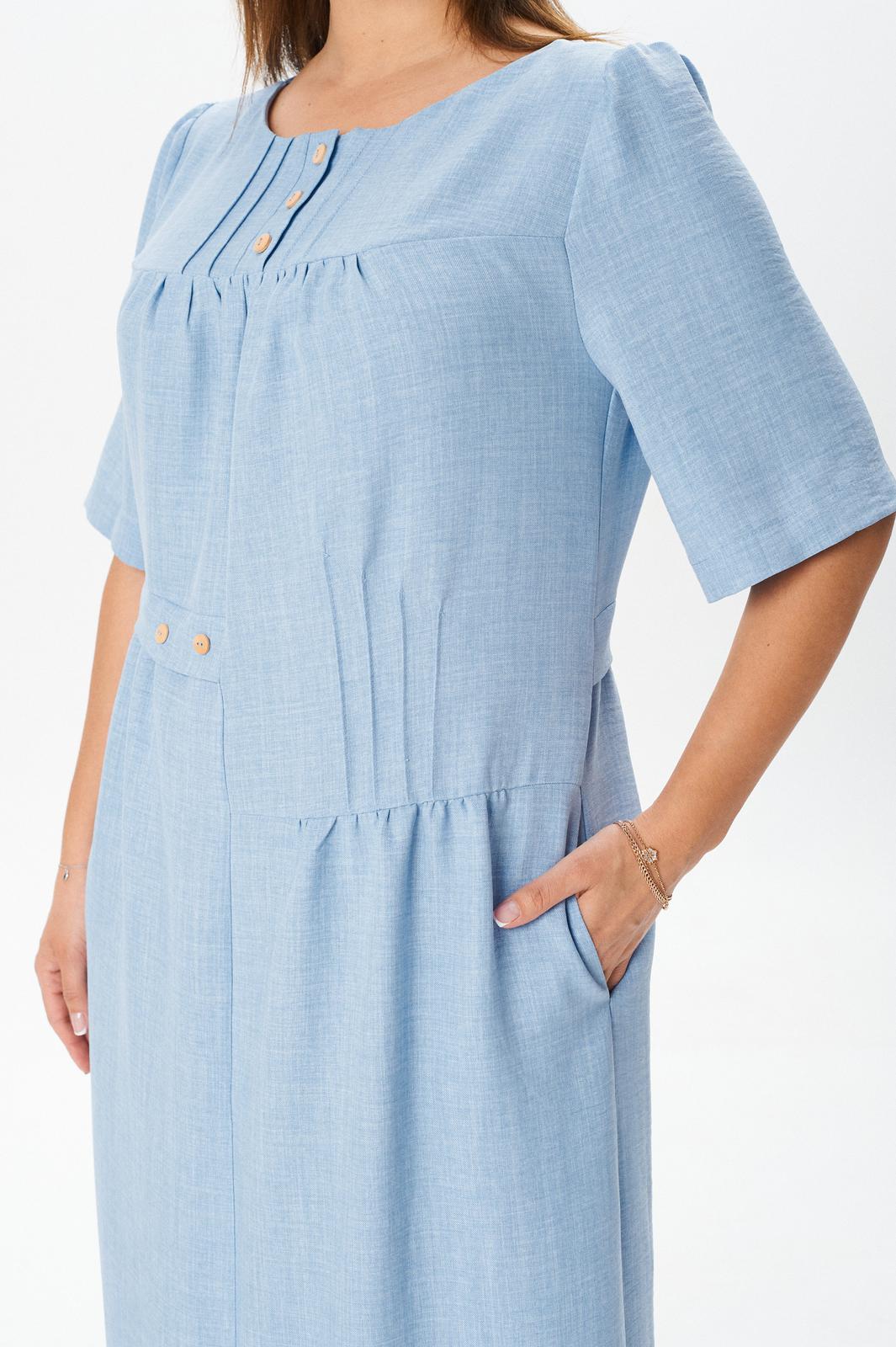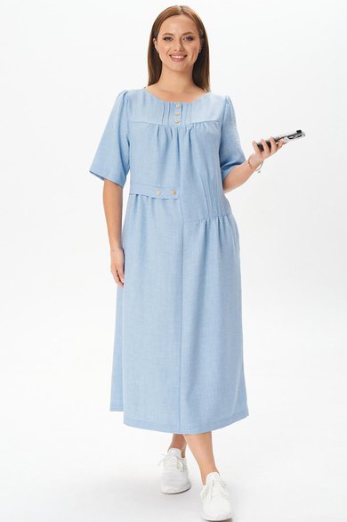 Платье женское свободного покроя из облегчённой плательной ткани(меланж) в стиле бохо. Стильное летнее платье, длина ниже колена. По переду: центральная застёжка в виде планки на петли и пуговицы на кокетке и отделочными защипами вдоль планки; по линии притачивания кокетки сборка; средний шов делит перед на 2 асимметричные детали; по правой стороне отрезная линия с отделочной планкой и сборкой по линии притачивания; по левой стороне отделочные защипы и сборка по линии притачивания. По спинке отрезная линия с планкой чуть выше линии талии; сборка лифа и низа по линии притачивания; средний шов в нижней части спинки. Рукав короткий прямой, втачной, одношовный, по окату сборка. Горловина округлой формы.