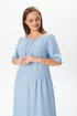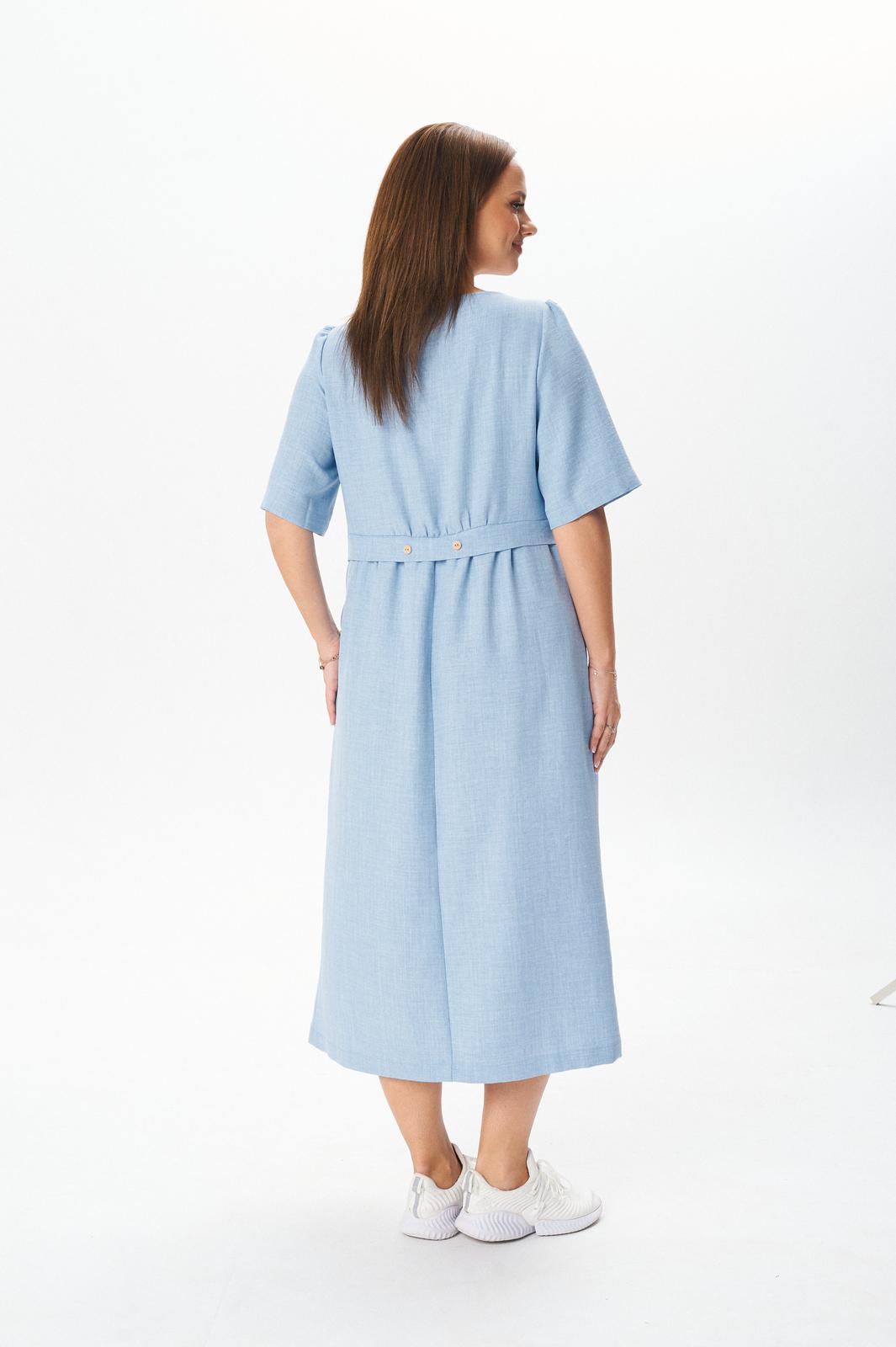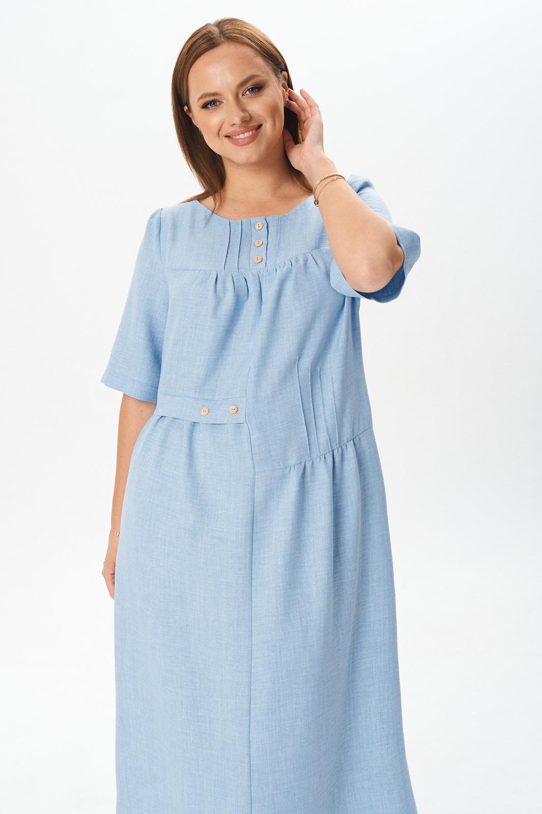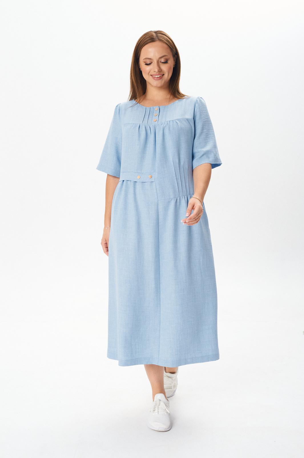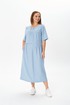 Платье женское свободного покроя из облегчённой плательной ткани(меланж) в стиле бохо. Стильное летнее платье, длина ниже колена. По переду: центральная застёжка в виде планки на петли и пуговицы на кокетке и отделочными защипами вдоль планки; по линии притачивания кокетки сборка; средний шов делит перед на 2 асимметричные детали; по правой стороне отрезная линия с отделочной планкой и сборкой по линии притачивания; по левой стороне отделочные защипы и сборка по линии притачивания. По спинке отрезная линия с планкой чуть выше линии талии; сборка лифа и низа по линии притачивания; средний шов в нижней части спинки. Рукав короткий прямой, втачной, одношовный, по окату сборка. Горловина округлой формы.