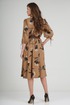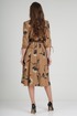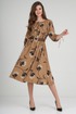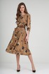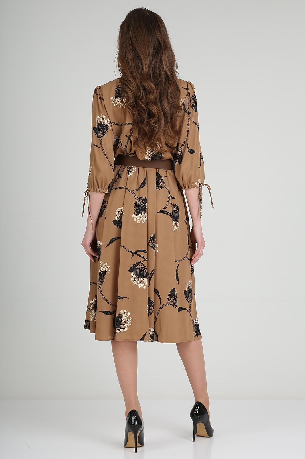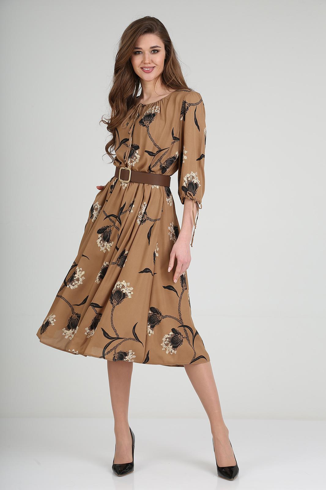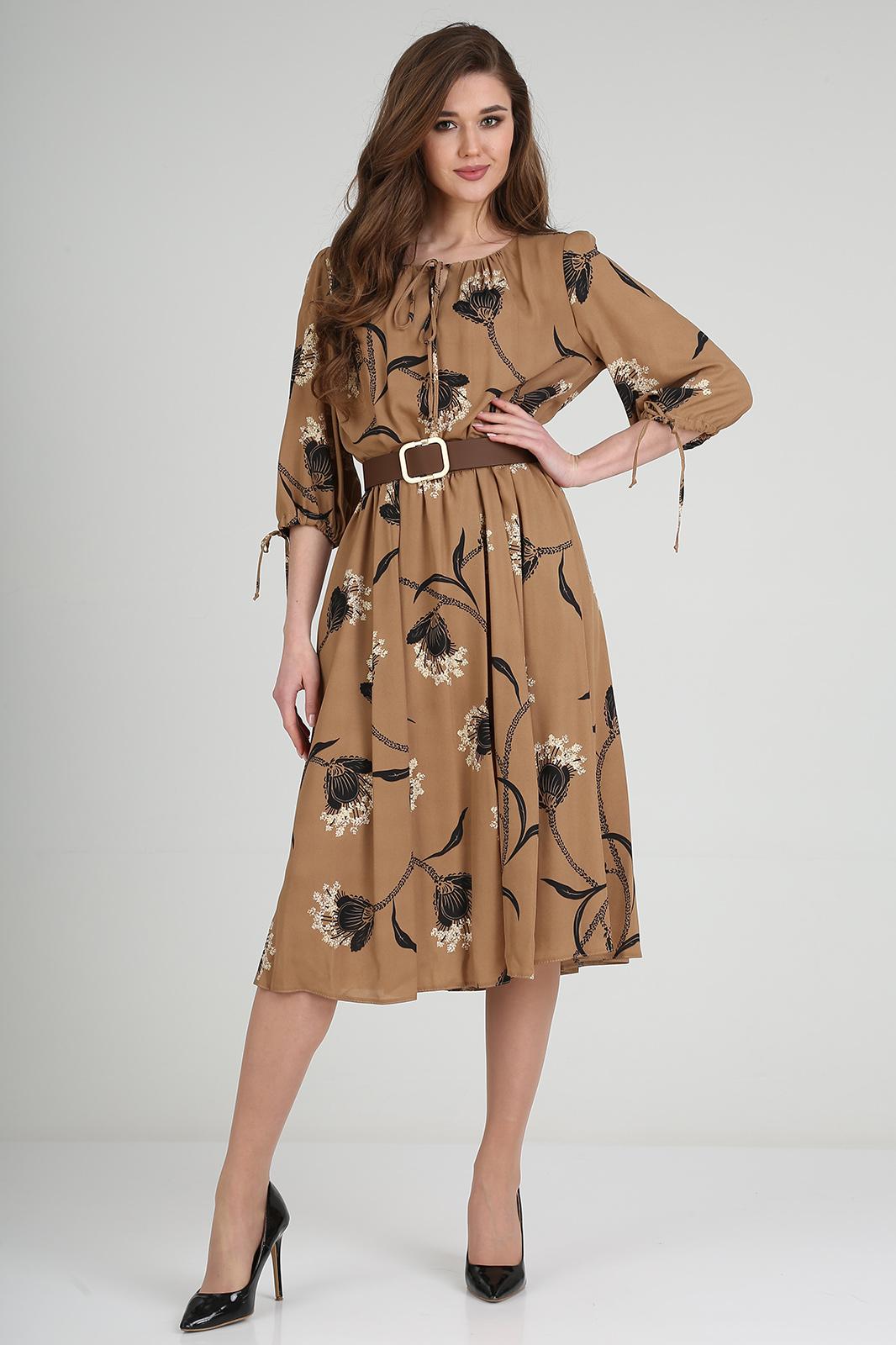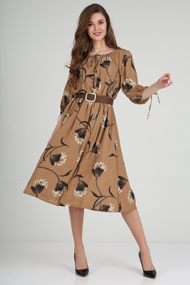 Платье женское из плательной ткани, отрезное по линии талии(собрано на эластичную тесьму), юбка клешёная. По лифу переда: нагрудная вытачка перенесена в сборку по горловине. Горловина округлой формы, на завязках, по переду и спинке присборена; обработана обтачкой. Рукав ¾ втачной одношовный, со сборкой по окату; по низу рукава петли на завязках. Карманы со входом из боковых швов. В комплект входит съёмный пояс.