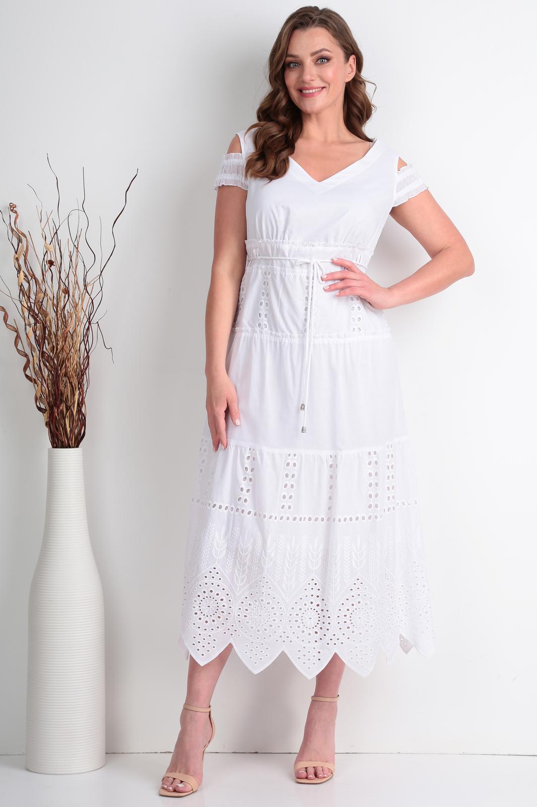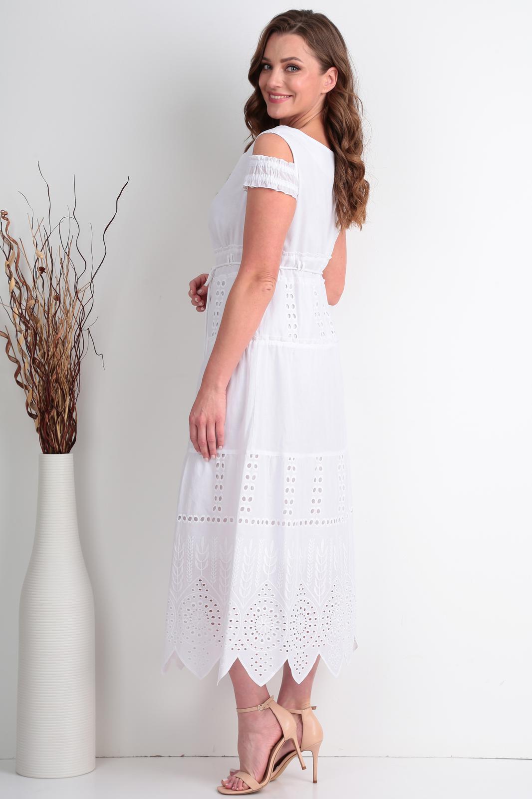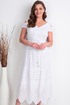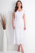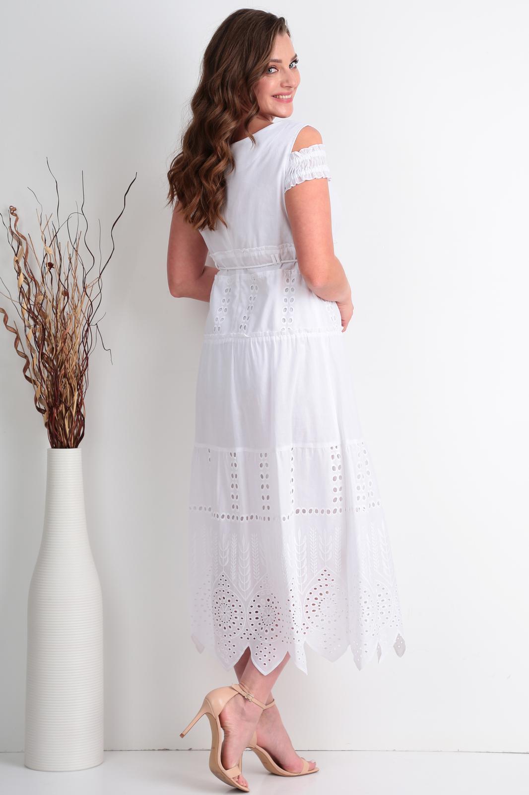 Платье полуприлегающего силуэта, под линией груди отрезной пояс. Открытые рукава со сборкой. Широкий V-образный вырез горловины. Застежка в среднем шве спинки на потайную молнию. Платье выполнено из хлопковой ткани с вышивкой. С подкладкой по низу.