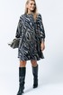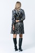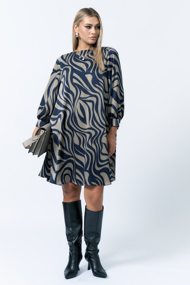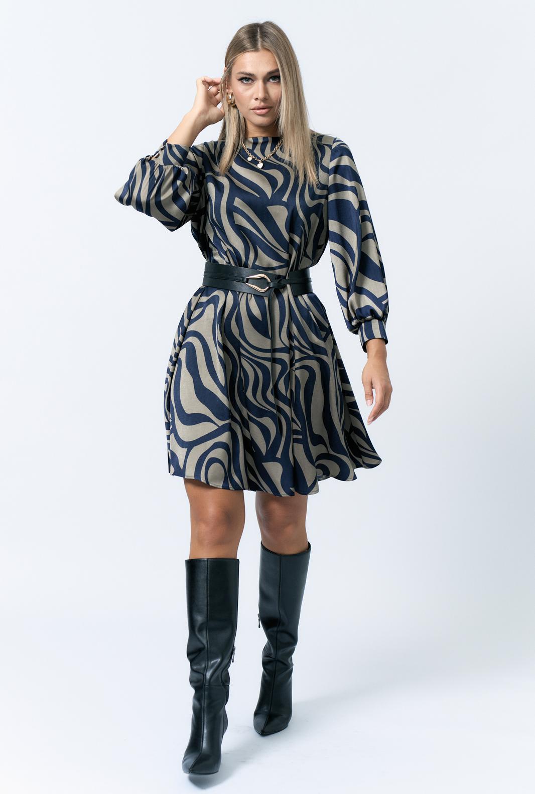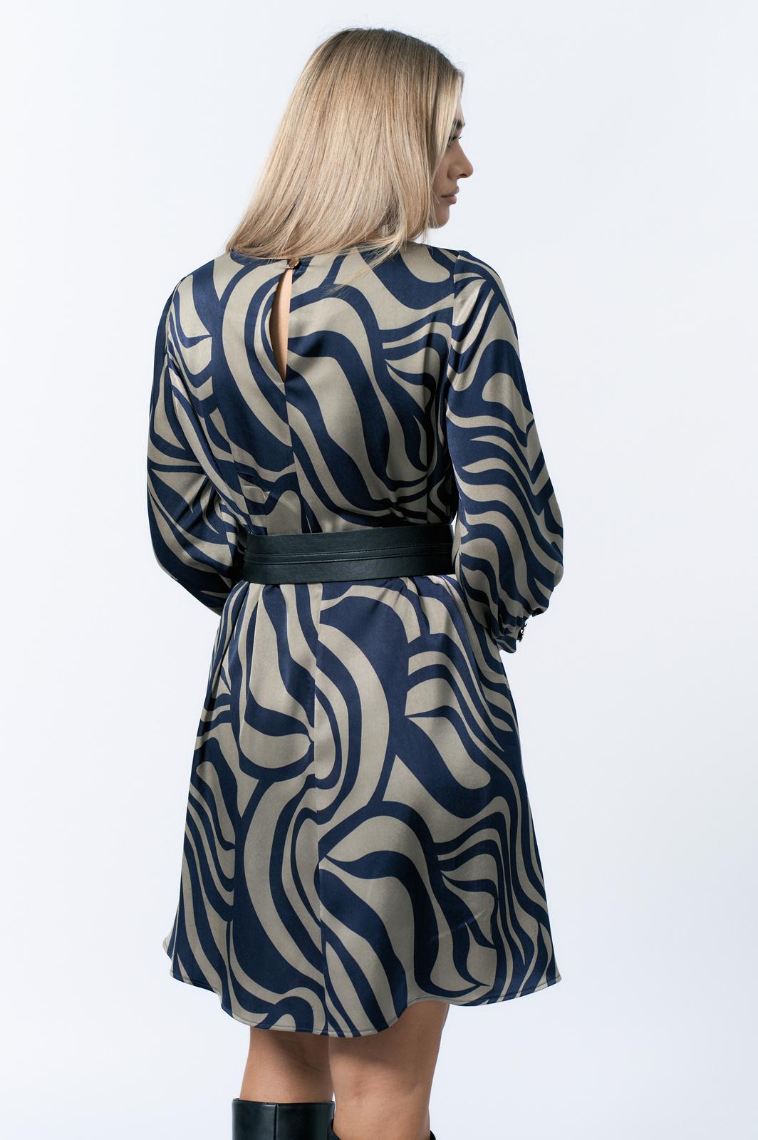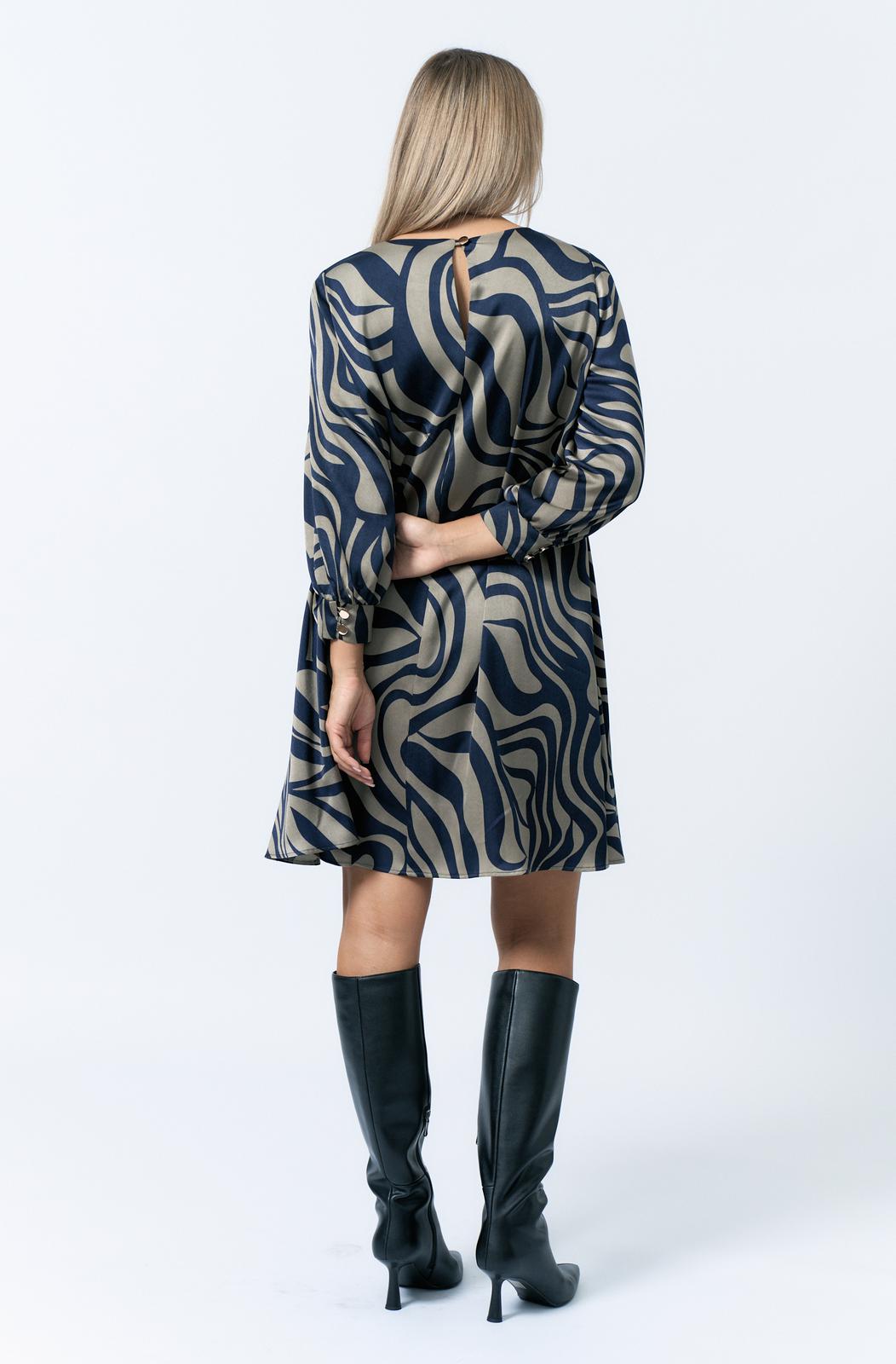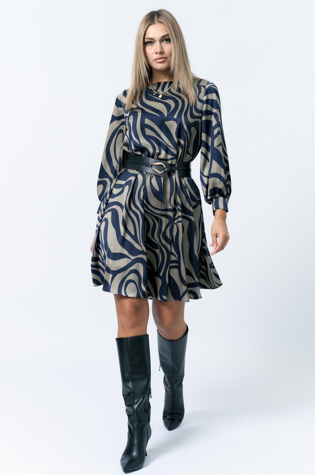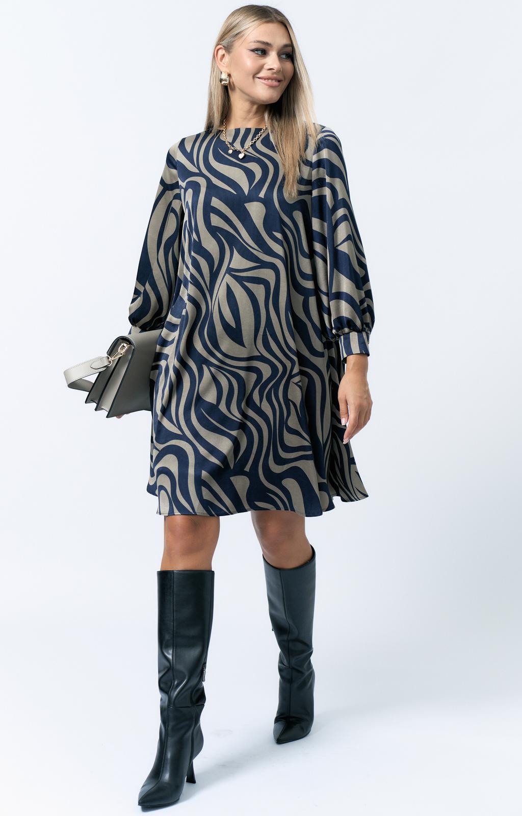 Платье женское А-образного силуэта. Горловина округлой формы. Рукав втачной.По низу рукава манжет застегивается на 2 петли пуговицы. Спинка со средним швом. По спинке вырез с застежкой на петлю пуговицу.