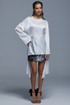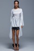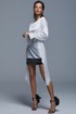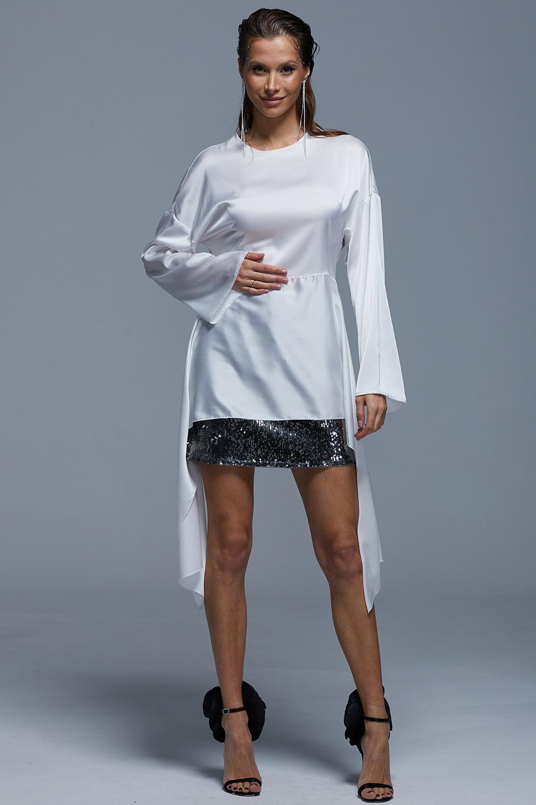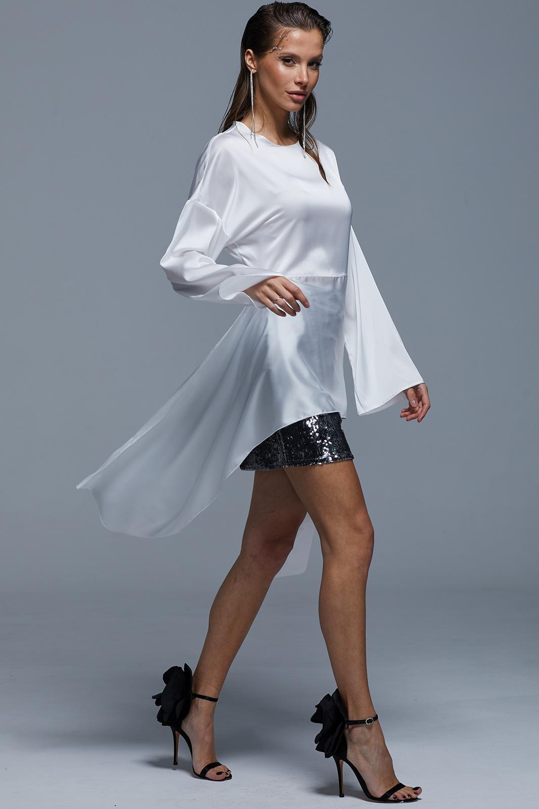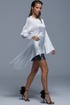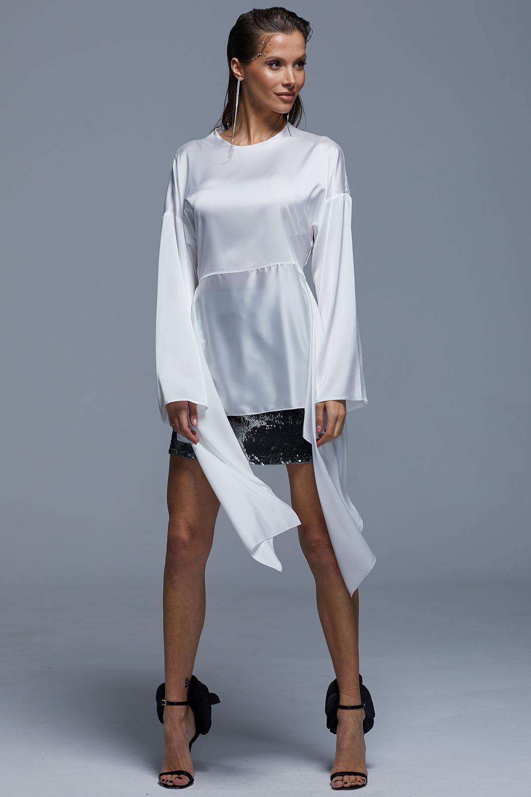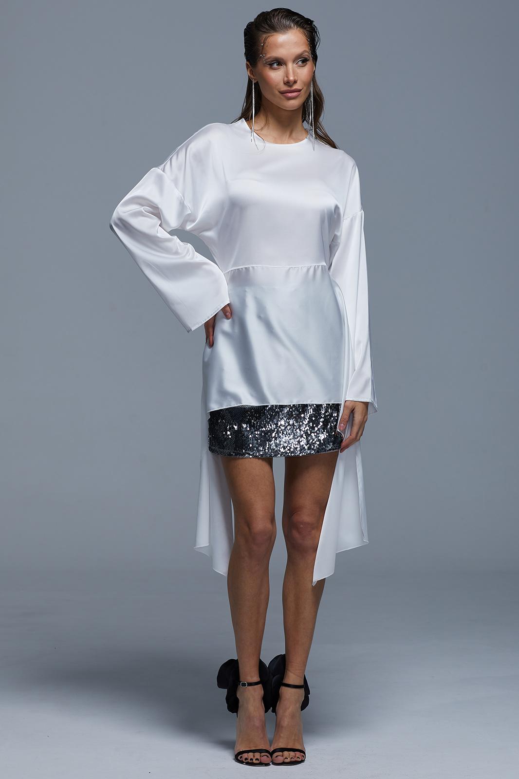 Блузка выполнена из блузочной нарядной ткани, свободного силуэта. Спущенная линия плеча, рукав длинный прямой. Широкий пояс-завязка. По спинке разрез, сверху- петля и пуговица, по низу –завязки. Длина блузки По спинке - 41 см. По переду (от горловины) - 68 см. Длина рукава 76 см. (от горловины).