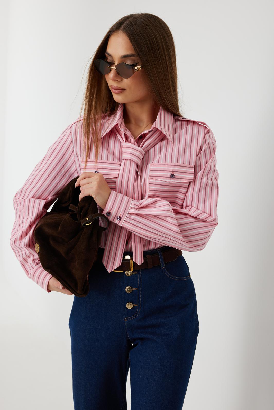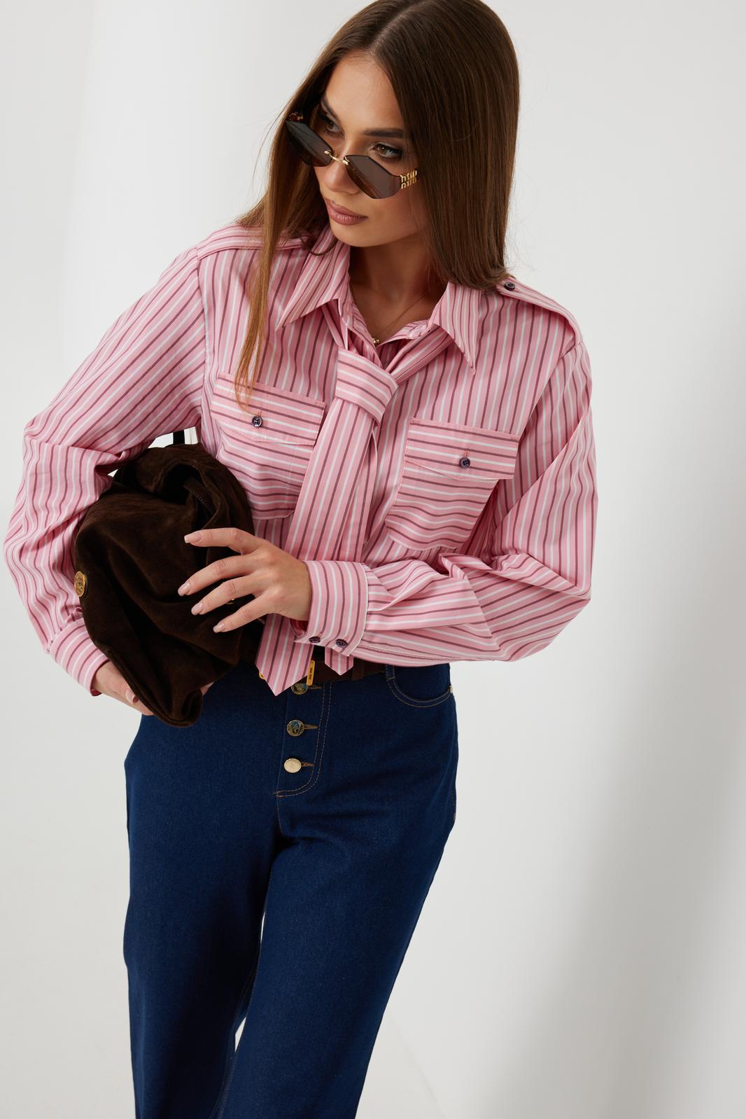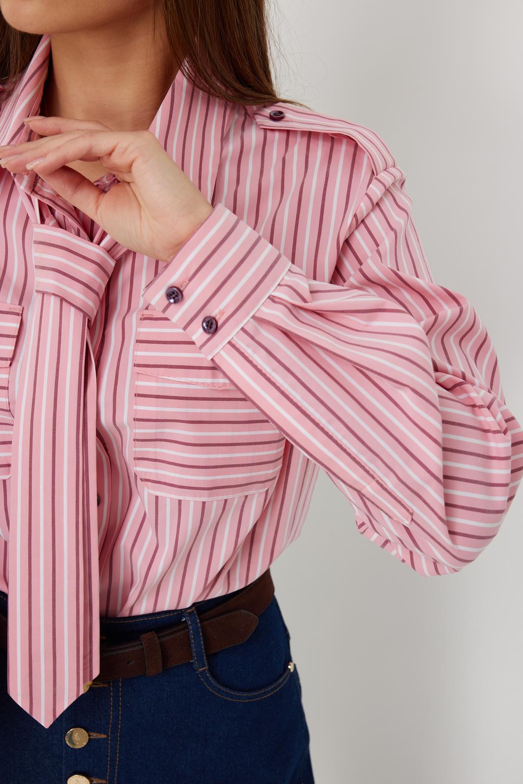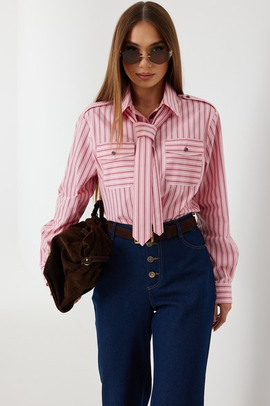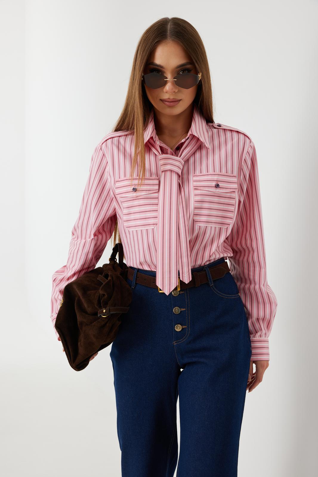Блузка женская свободного силуэта, из рубашечной ткани в полоску. Спинка с кокеткой. Застежка на петли и пуговицы, по переду накладные карманы с клапанами, по плечевым швам погоны, фиксирующиеся пуговицей, рукав свободный, по низу манжета с пуговицами. В комплекте с блузкой декоративная деталь, завязывающаяся в виде галстука. Воротник рубашечный со стойкой.