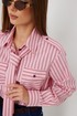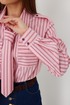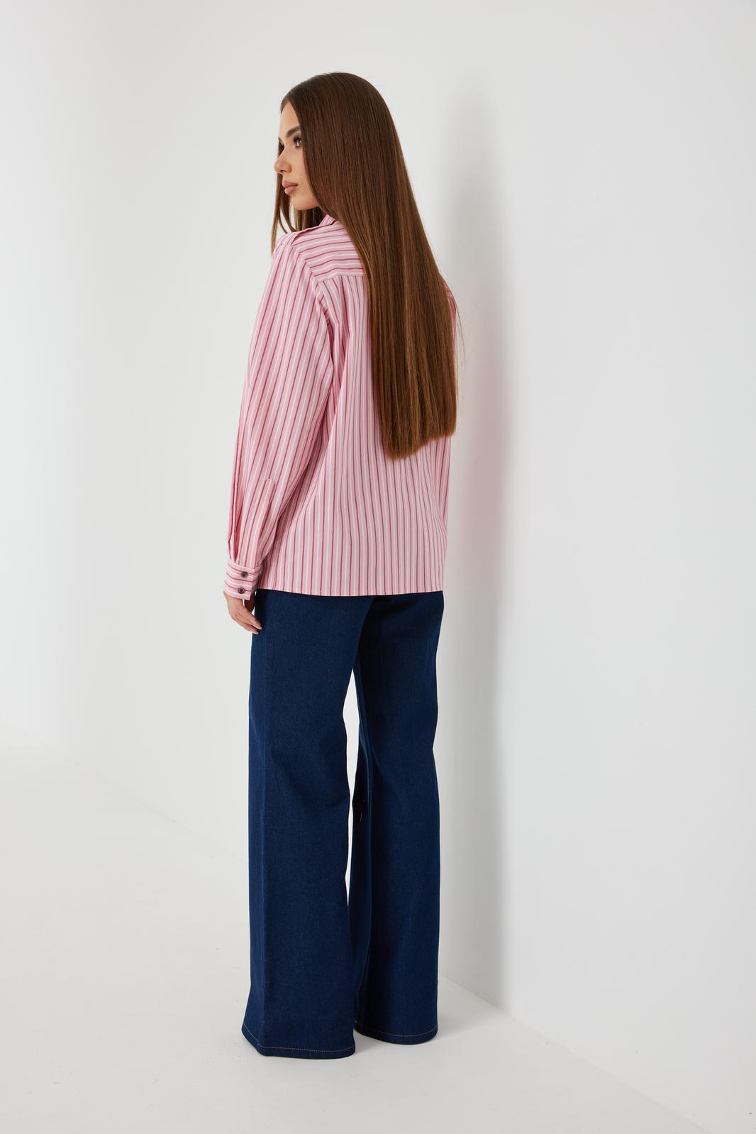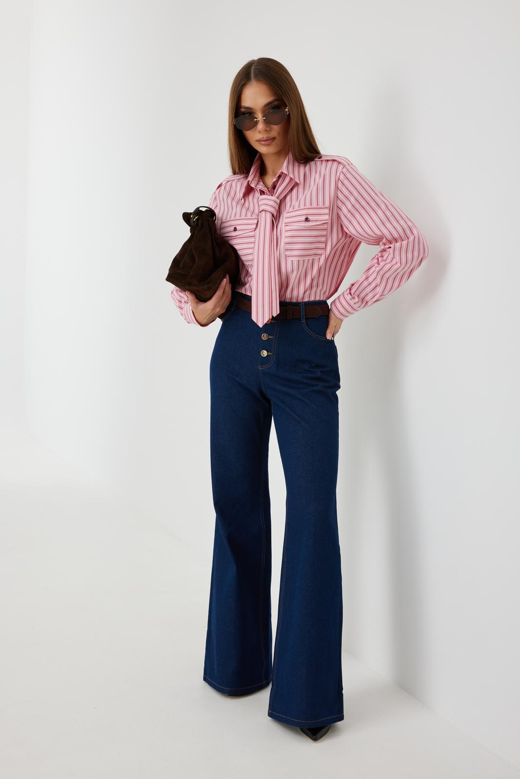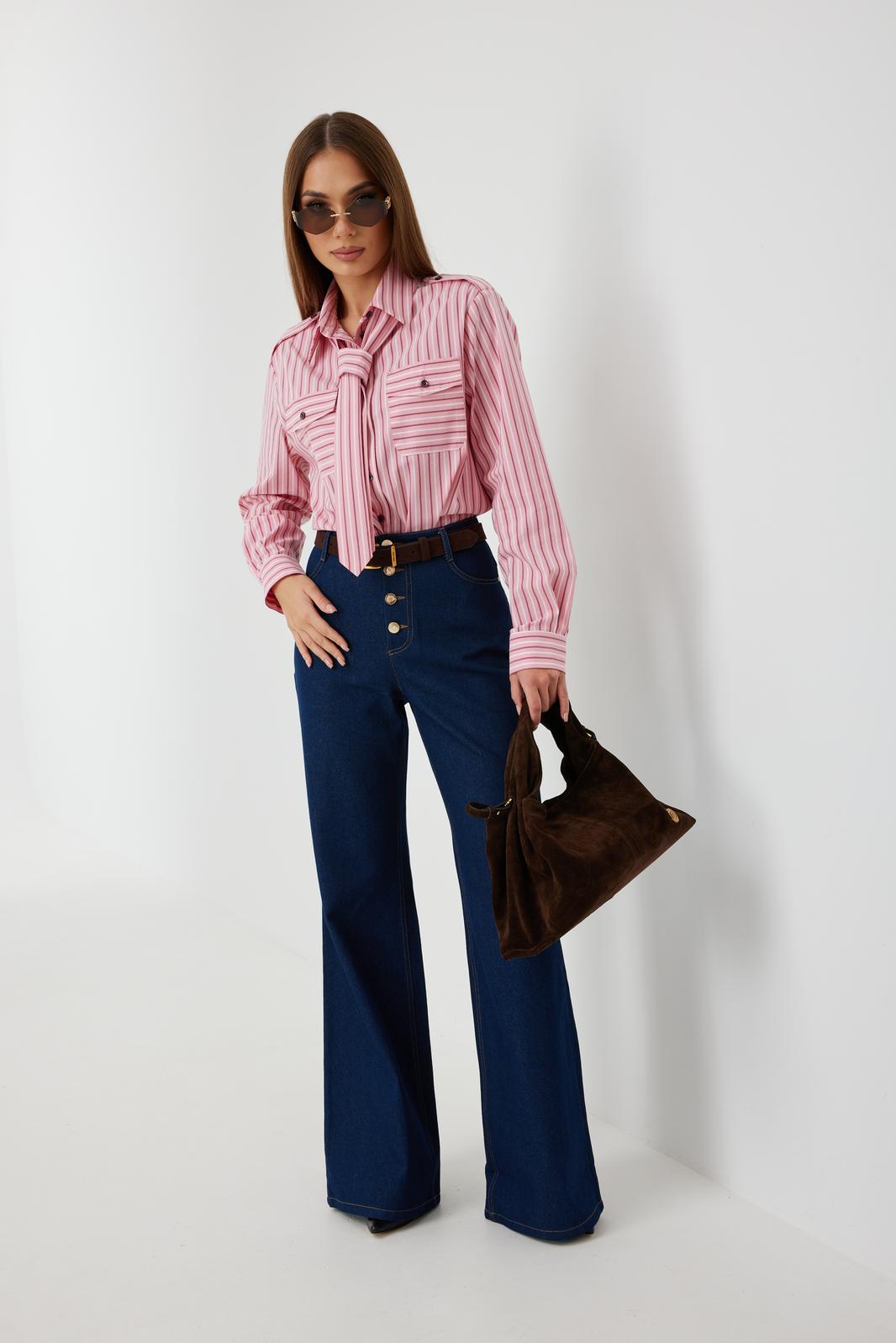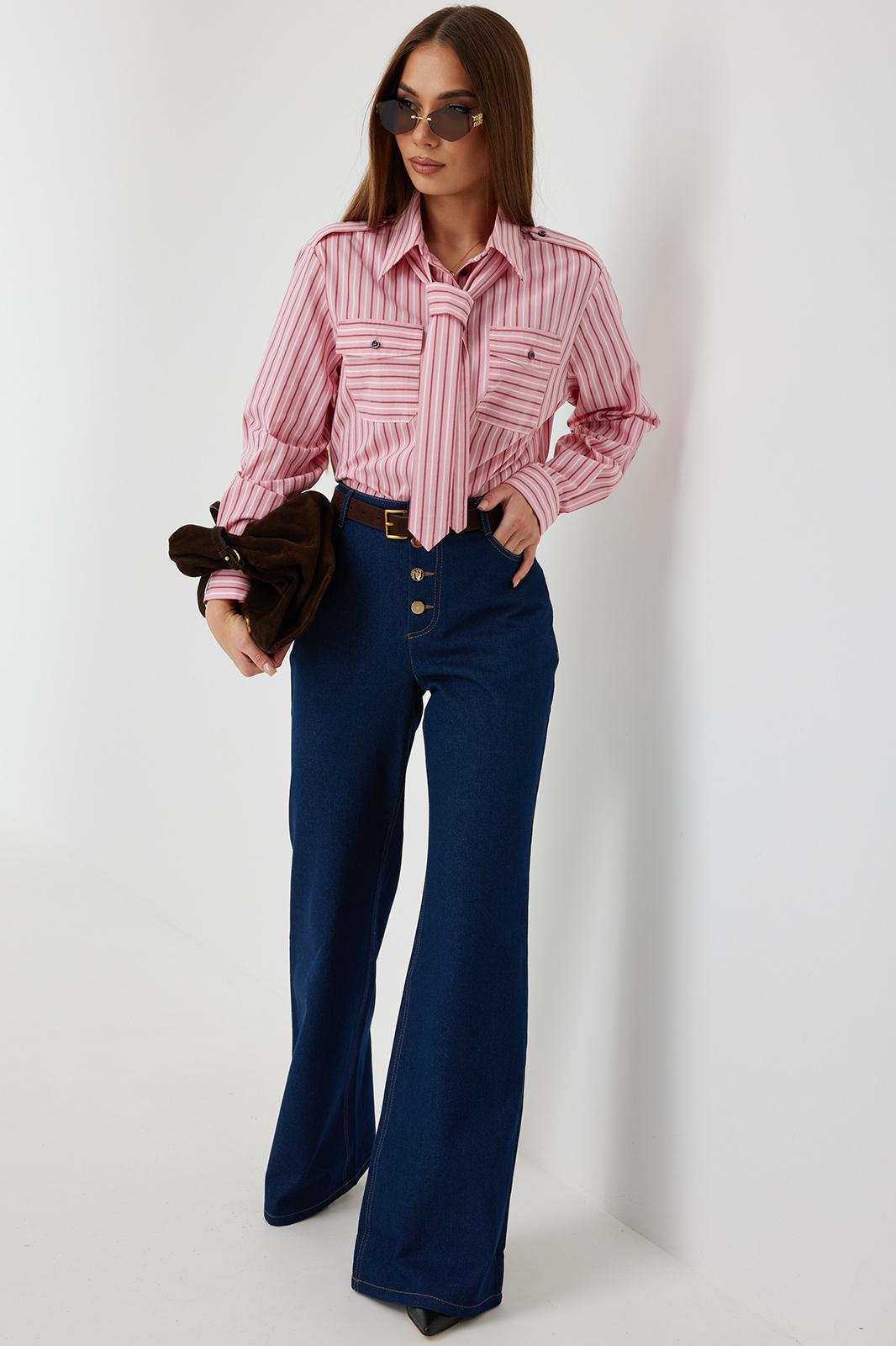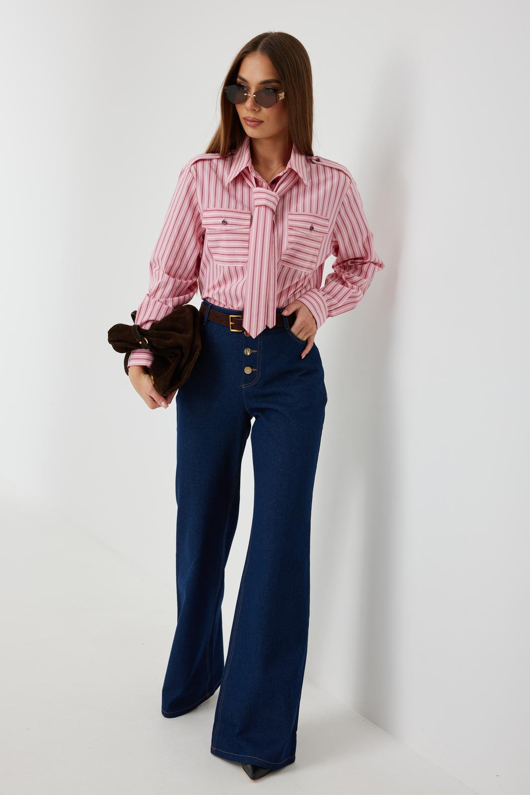 Блузка женская свободного силуэта, из рубашечной ткани в полоску. Спинка с кокеткой. Застежка на петли и пуговицы, по переду накладные карманы с клапанами, по плечевым швам погоны, фиксирующиеся пуговицей, рукав свободный, по низу манжета с пуговицами. В комплекте с блузкой декоративная деталь, завязывающаяся в виде галстука. Воротник рубашечный со стойкой.