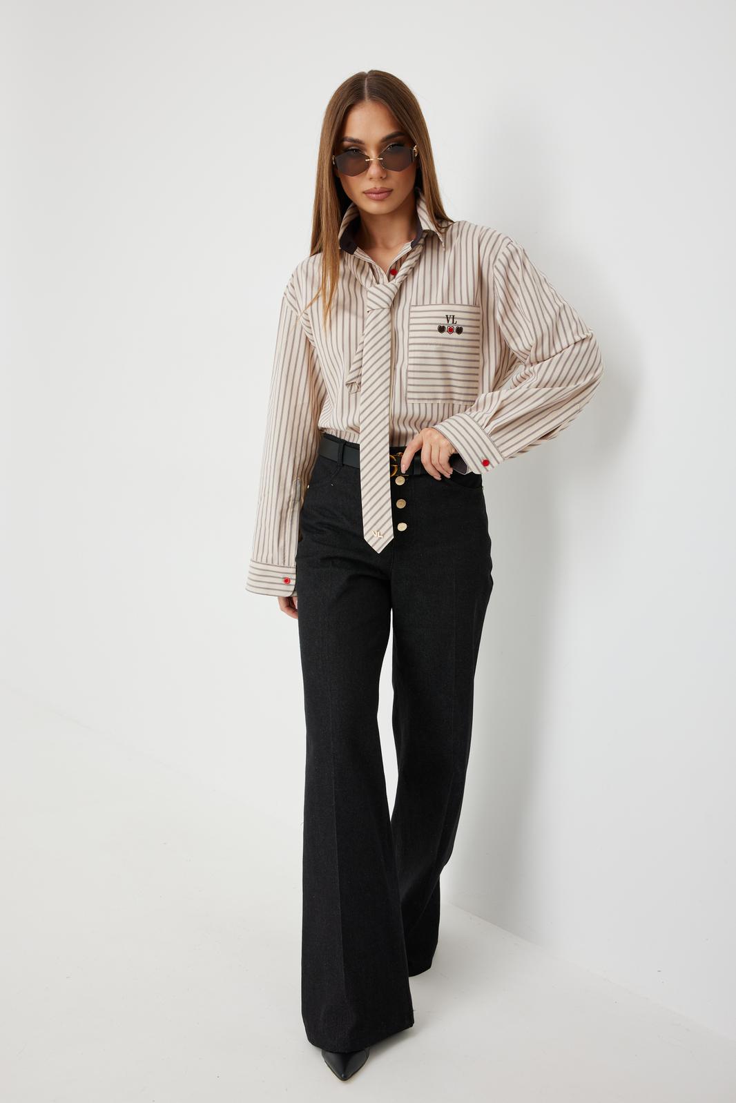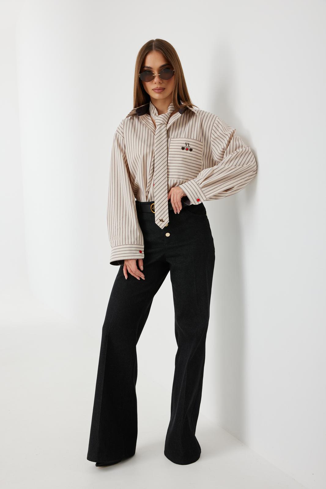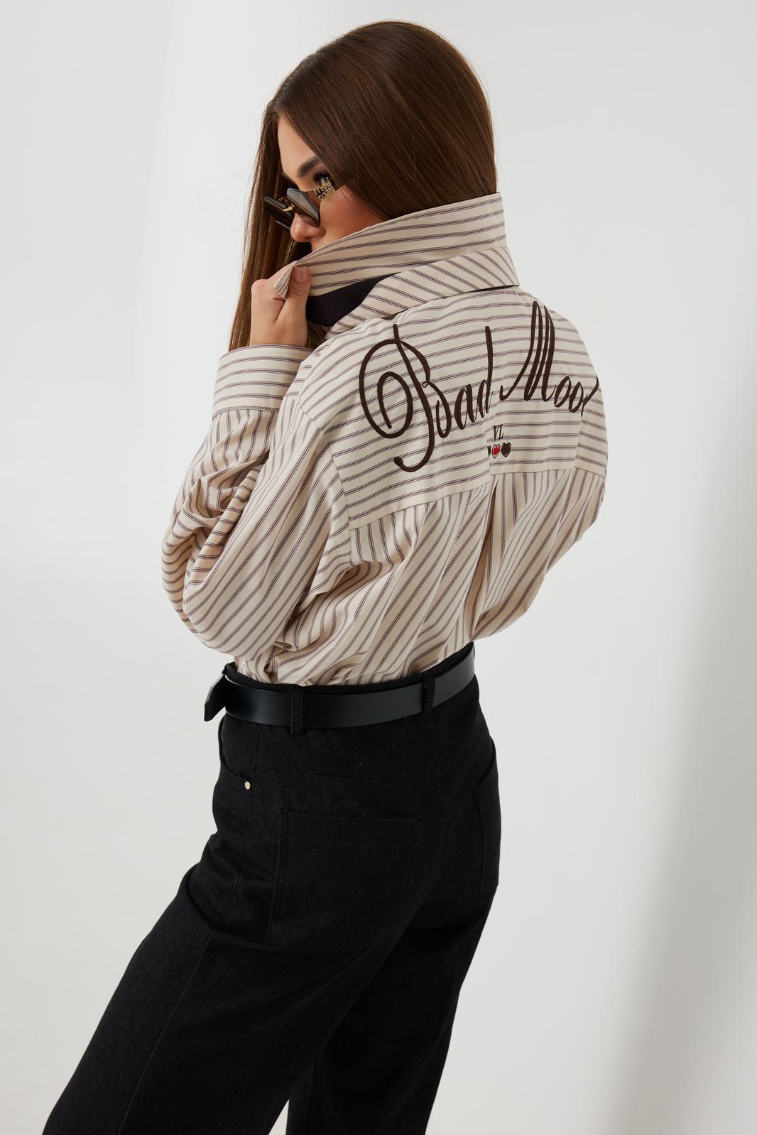 Блузка женская «oversize» силуэта, из рубашечной ткани в полоску. На спинке кокетка с оригинальной вышивкой. Застежка на петли и пуговицы, по переду карман с вышивкой, рукав свободный, по низу манжета, состоящая из двух частей, с помощью данного элемента возможно сделать рукав более или менее объёмным внизу. В комплекте с блузкой декоративная деталь, завязывающаяся в виде галстука. Воротник рубашечный со стойкой.
