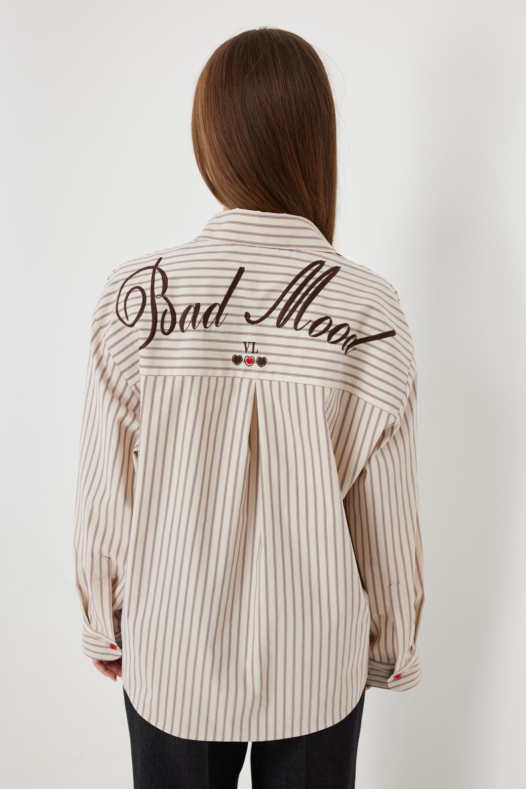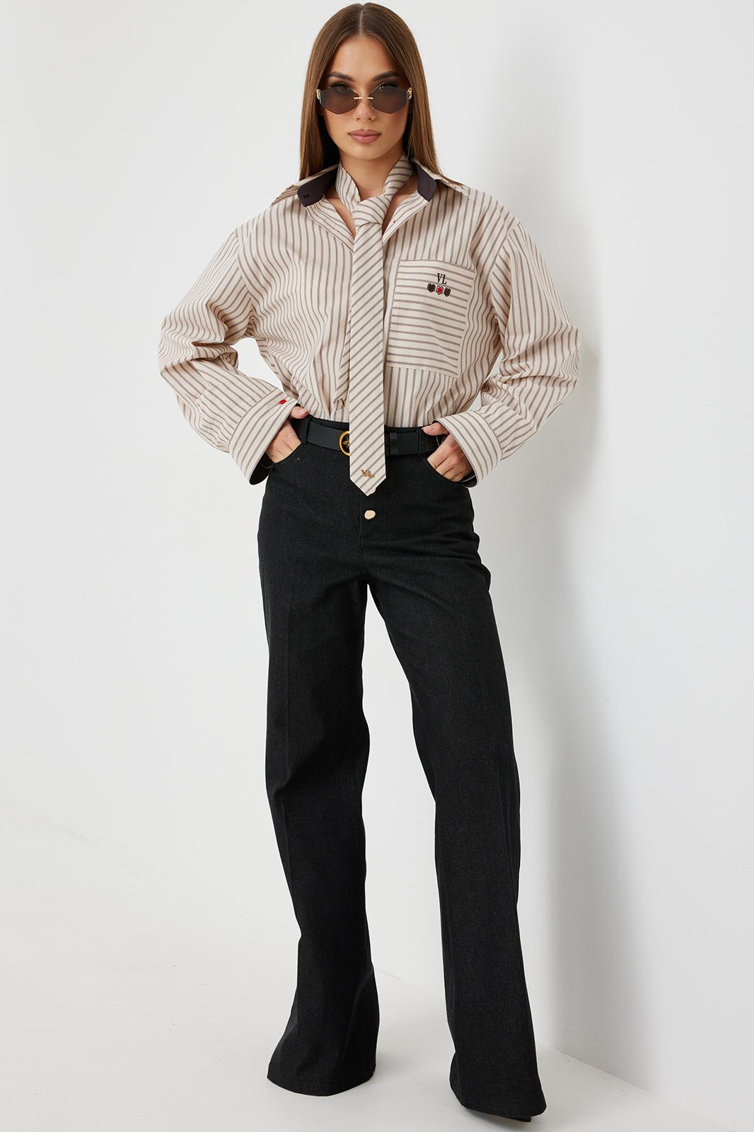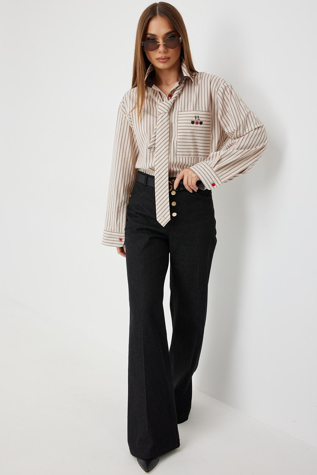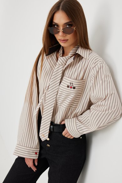 Блузка женская «oversize» силуэта, из рубашечной ткани в полоску. На спинке кокетка с оригинальной вышивкой. Застежка на петли и пуговицы, по переду карман с вышивкой, рукав свободный, по низу манжета, состоящая из двух частей, с помощью данного элемента возможно сделать рукав более или менее объёмным внизу. В комплекте с блузкой декоративная деталь, завязывающаяся в виде галстука. Воротник рубашечный со стойкой.