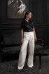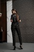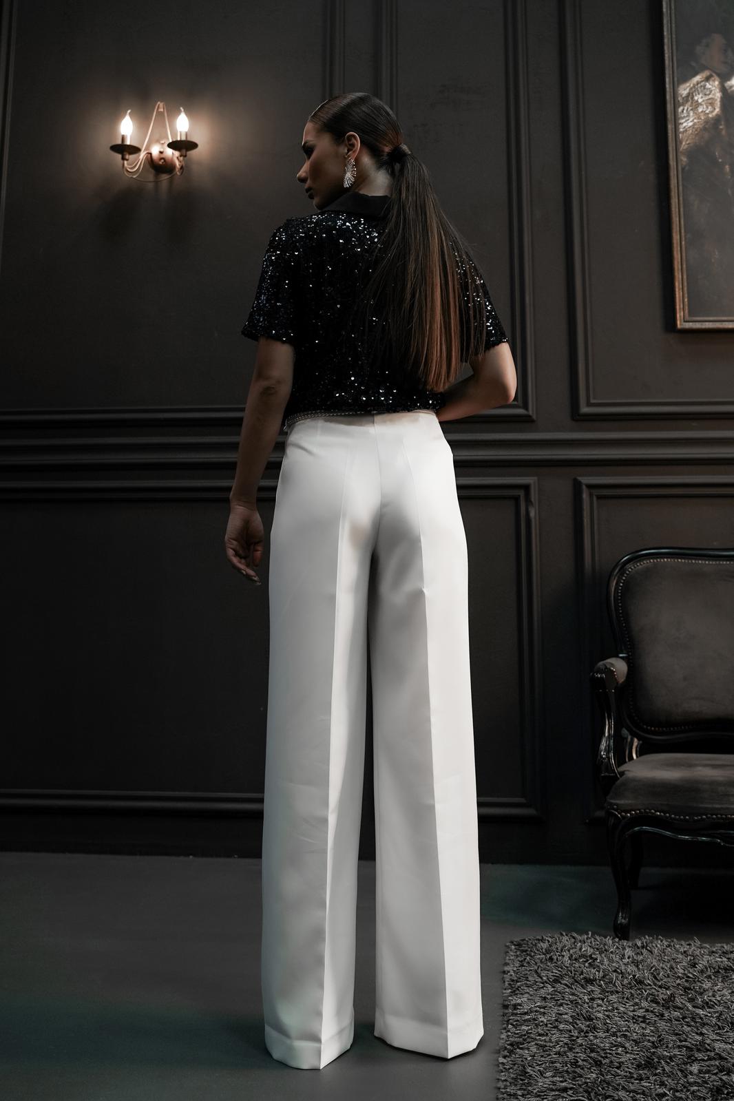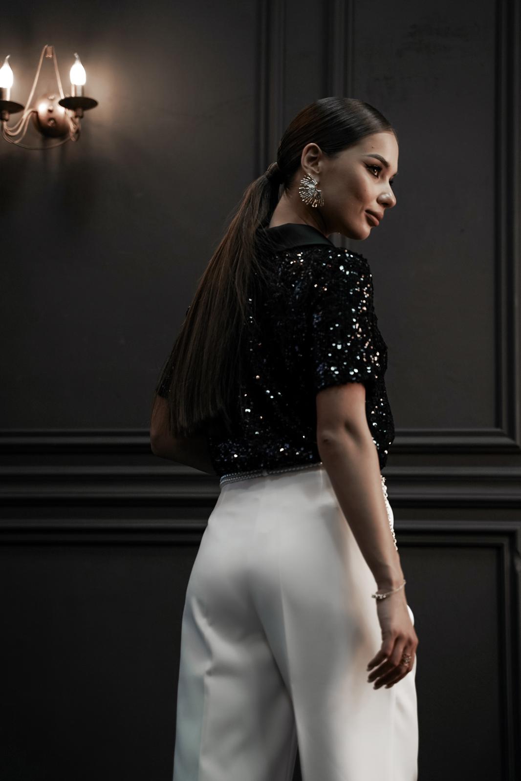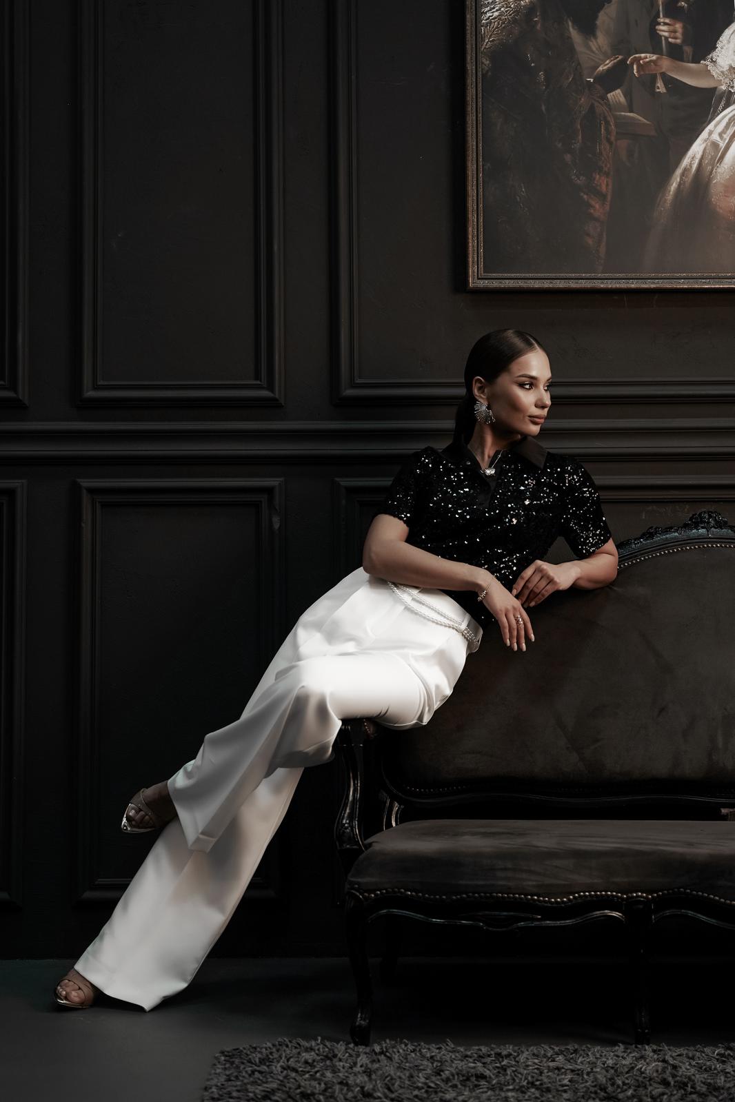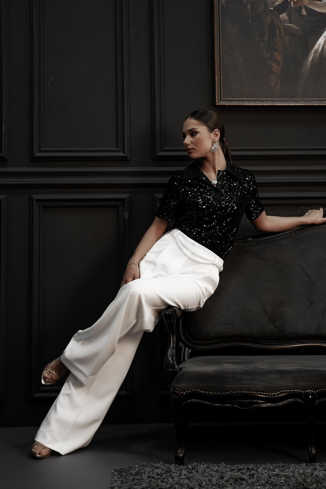 Блузка женская из трикотажного полотна в пайетки, прямого силуэта, перед джемпера с застежкой на планку с четырьмя кнопками, рукав короткий, воротник стояче-отложной. Блузка на подкладке.