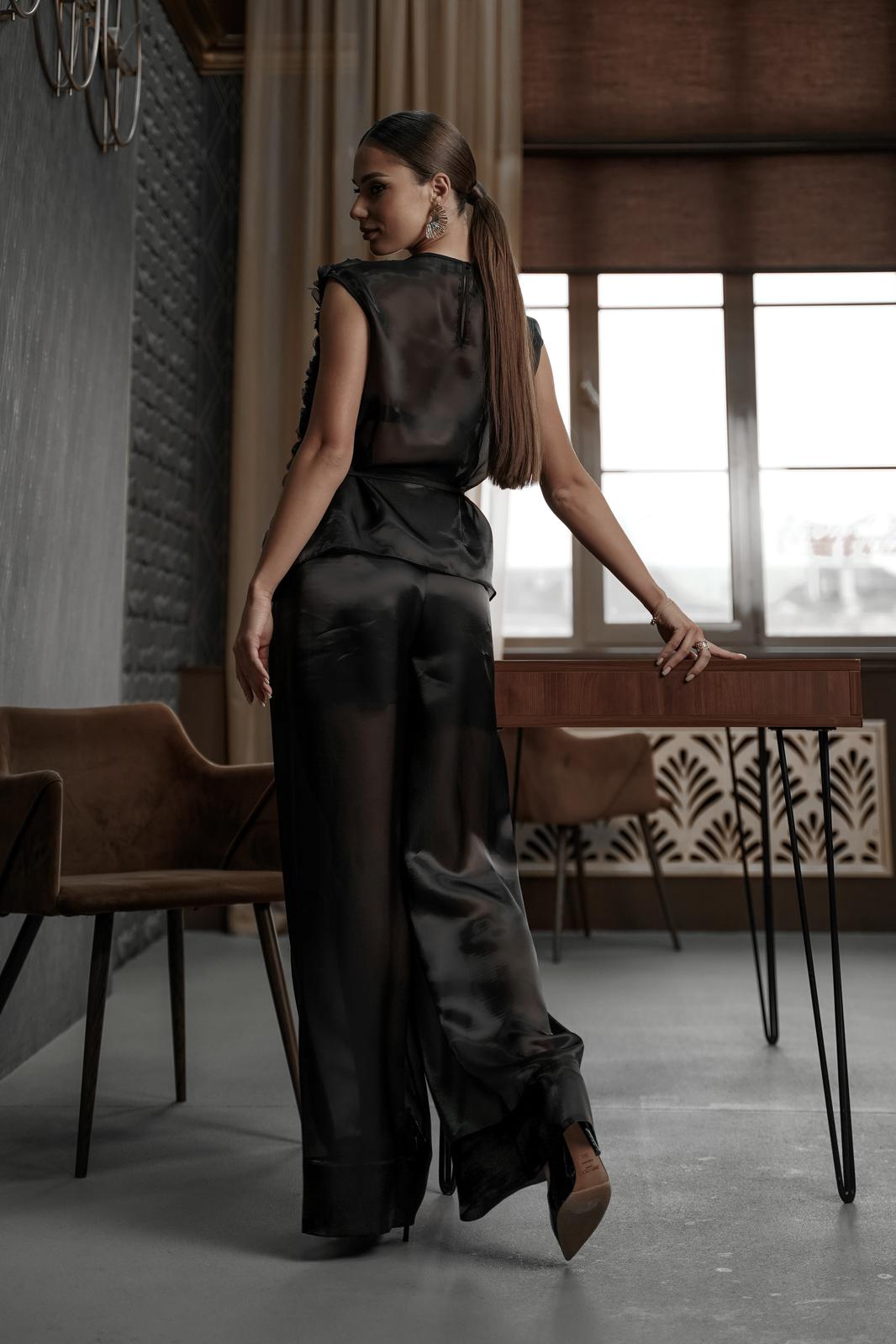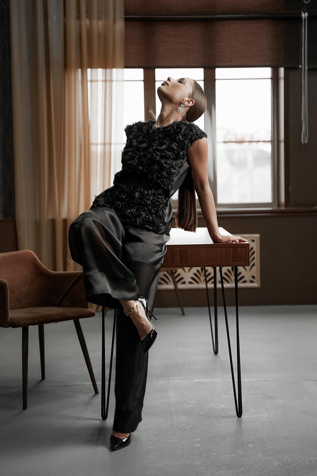 Блузка прямого силуэта со спущенным плечом. Перед из фактурной ткани «розы на сетке», спинка из полупрозрачной ткани «органза». Горловина округлой формы, по спинке застежка на навесную петлю и пуговицу. Перед на атласной подкладке.