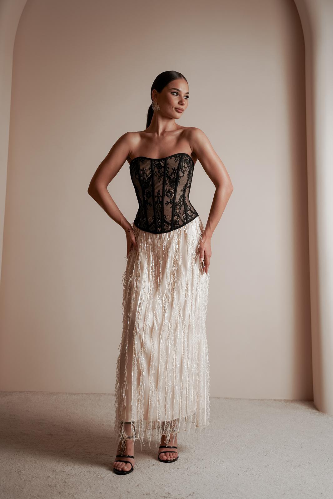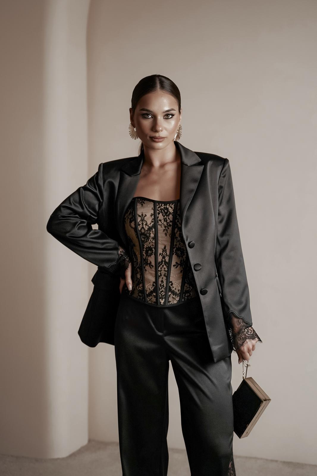 Укороченная блузка из кружева с сатиновой подкладкой, прилегающего силуэта. По спинке шнуровка. По переду и спинке по три рельефных шва. Блузка отлично подойдет для коктейльных и вечерних выходов, ее можно использовать, как самостоятельный предмет одежды или надевать вторым слоем поверх рубашек или платьев.