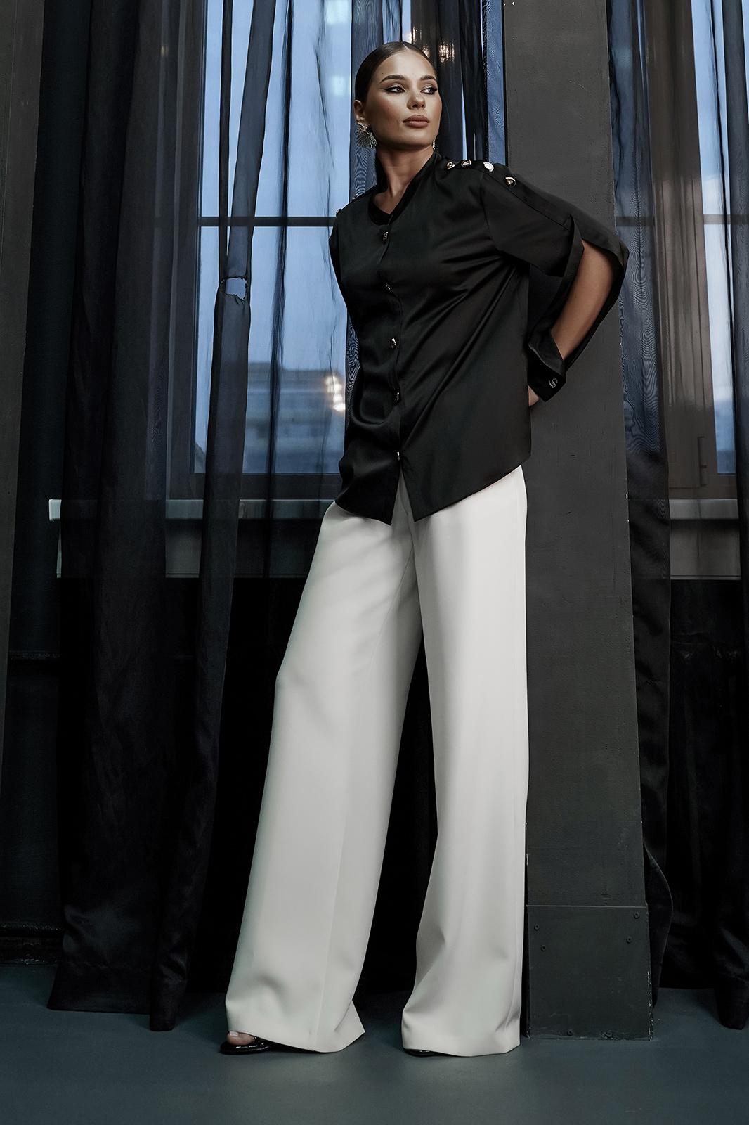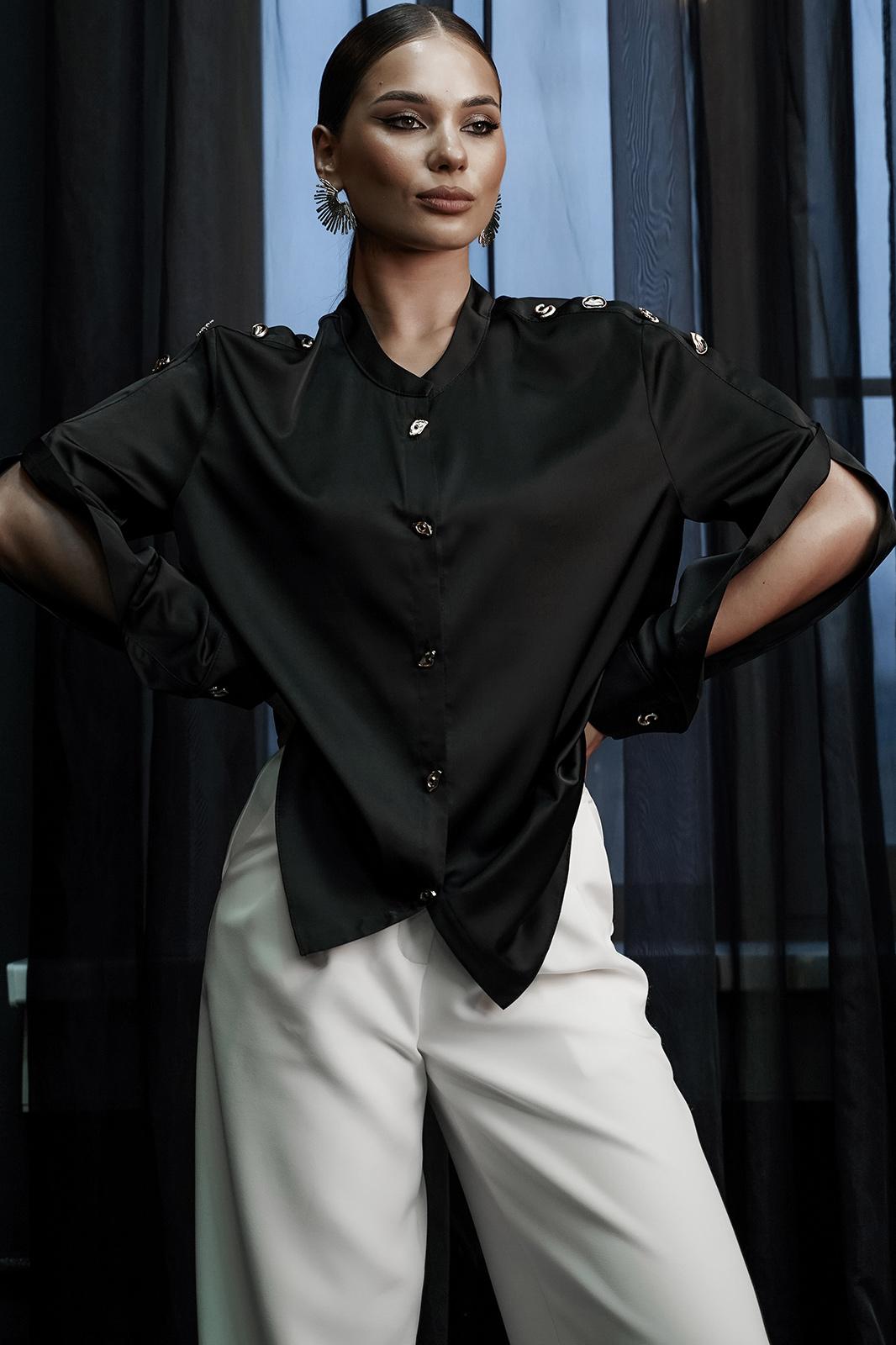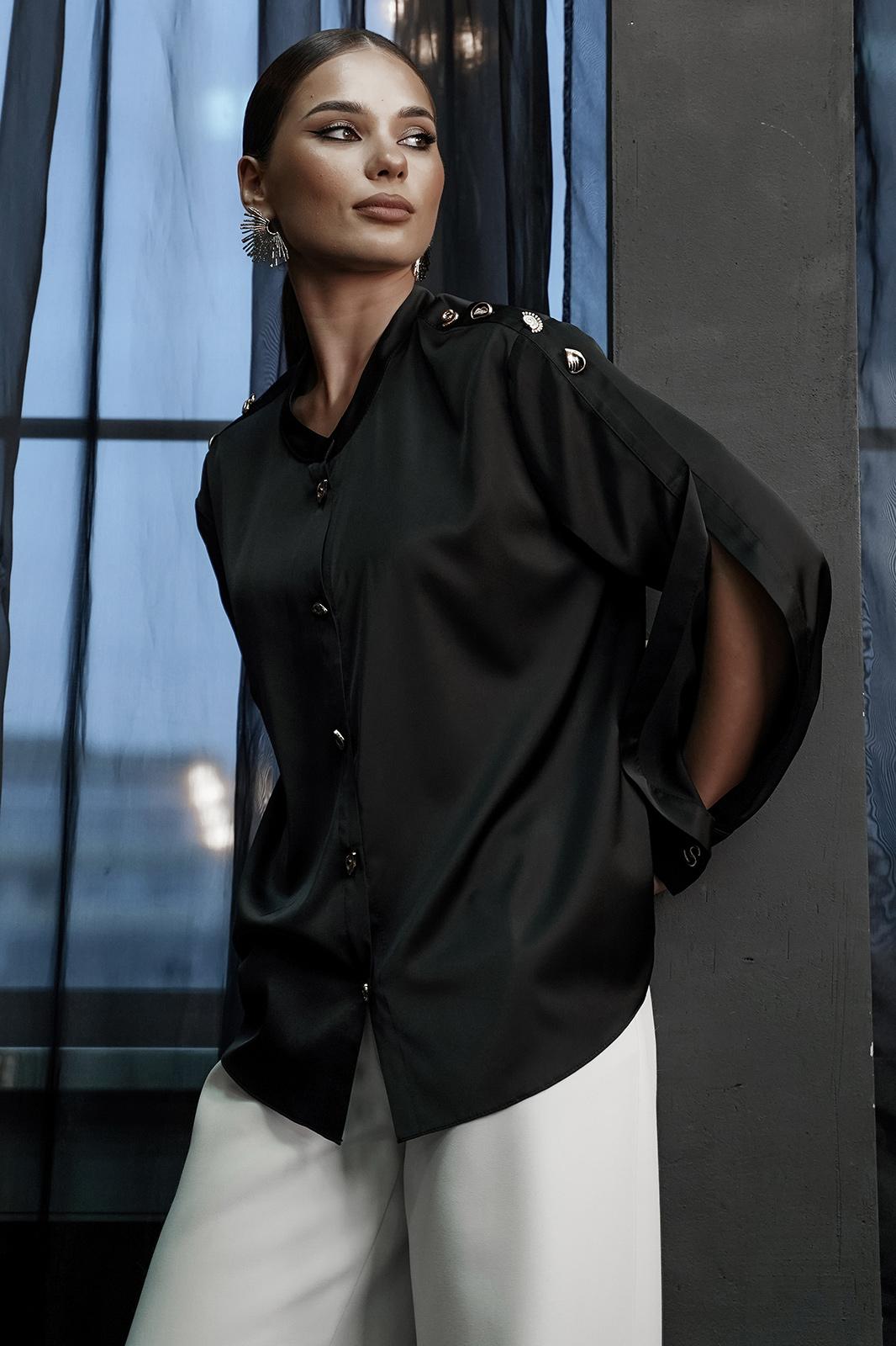 Блузка женская из блузочной ткани с деликатным блеском, свободного силуэта, с застежкой по переду сверху до низа блузки на пять петель и пуговиц. Рукава длинные со складкой внизу, низ рукава на манжете, манжет застегивается на петлю и пуговицу. По плечевым швам и рукаву имитация застежки на планку по всей длине. По планке в верхней части четыре петли и декоративные пуговицы, снизу рукав с «распахивающимися» планками. Воротник - невысокая стойка, прилегающий к шее. Блузка декорирована эффектными пуговицами в стиле «скиапарелли».