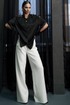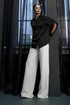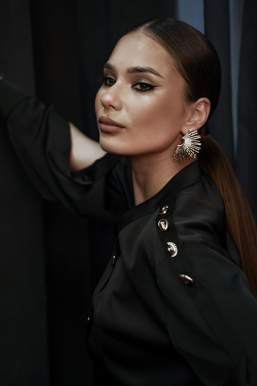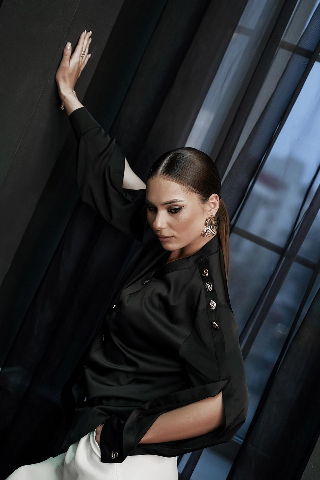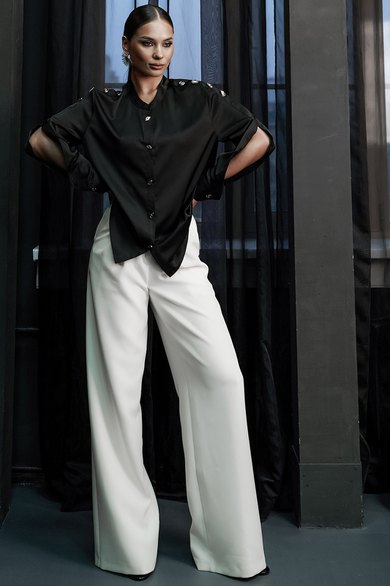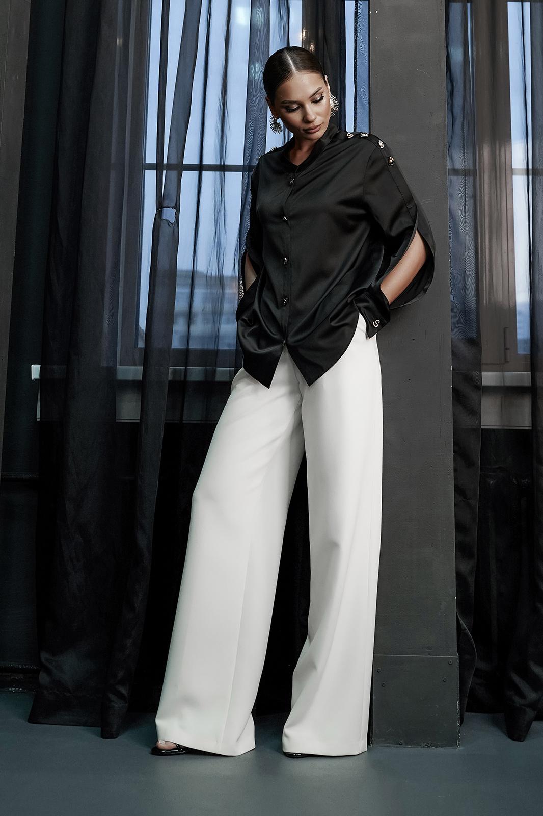 Блузка женская из блузочной ткани с деликатным блеском, свободного силуэта, с застежкой по переду сверху до низа блузки на пять петель и пуговиц. Рукава длинные со складкой внизу, низ рукава на манжете, манжет застегивается на петлю и пуговицу. По плечевым швам и рукаву имитация застежки на планку по всей длине. По планке в верхней части четыре петли и декоративные пуговицы, снизу рукав с «распахивающимися» планками. Воротник - невысокая стойка, прилегающий к шее. Блузка декорирована эффектными пуговицами в стиле «скиапарелли».