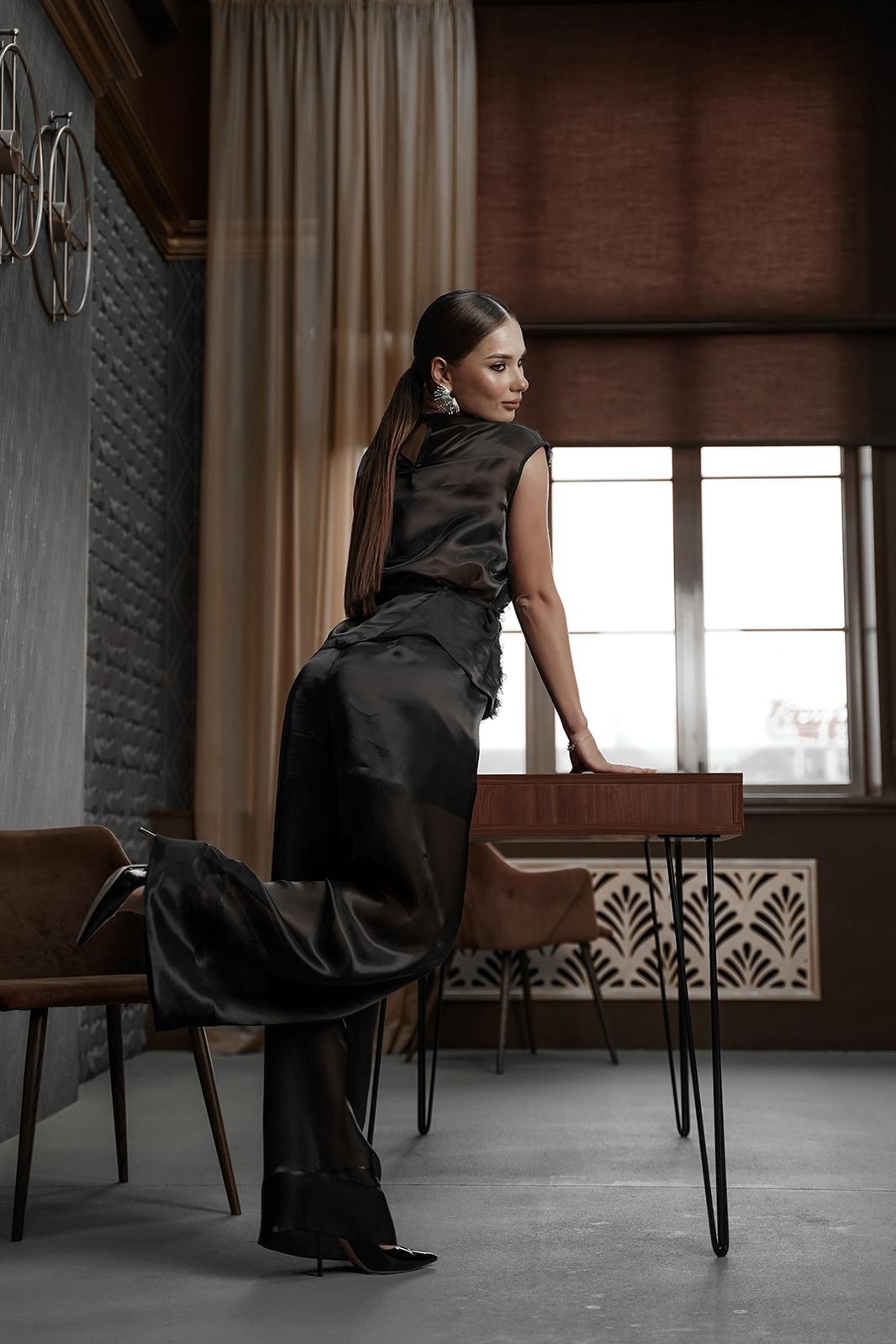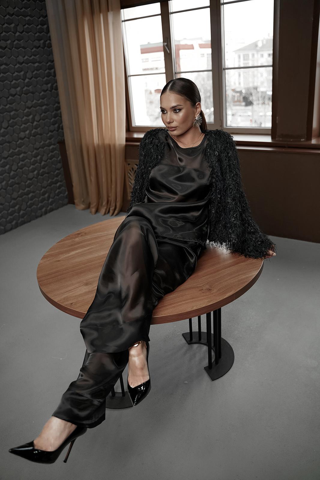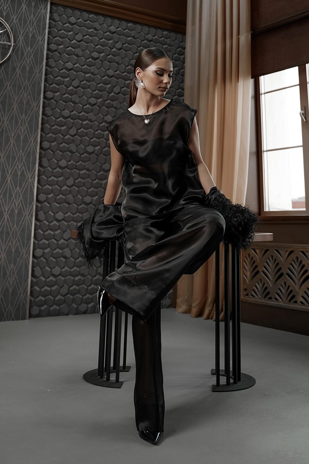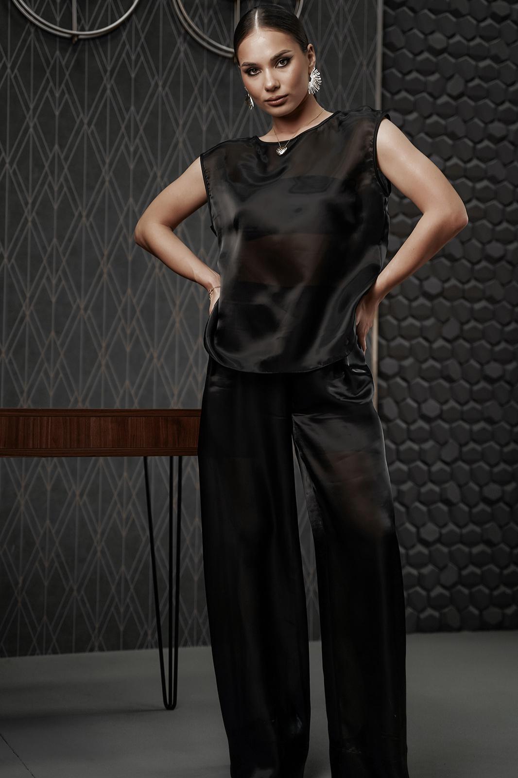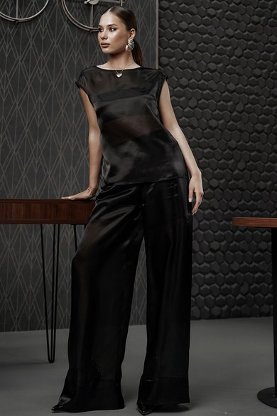 Блузка прямого силуэта со спущенным плечом из полупрозрачной ткани «органза». Горловина округлой формы.