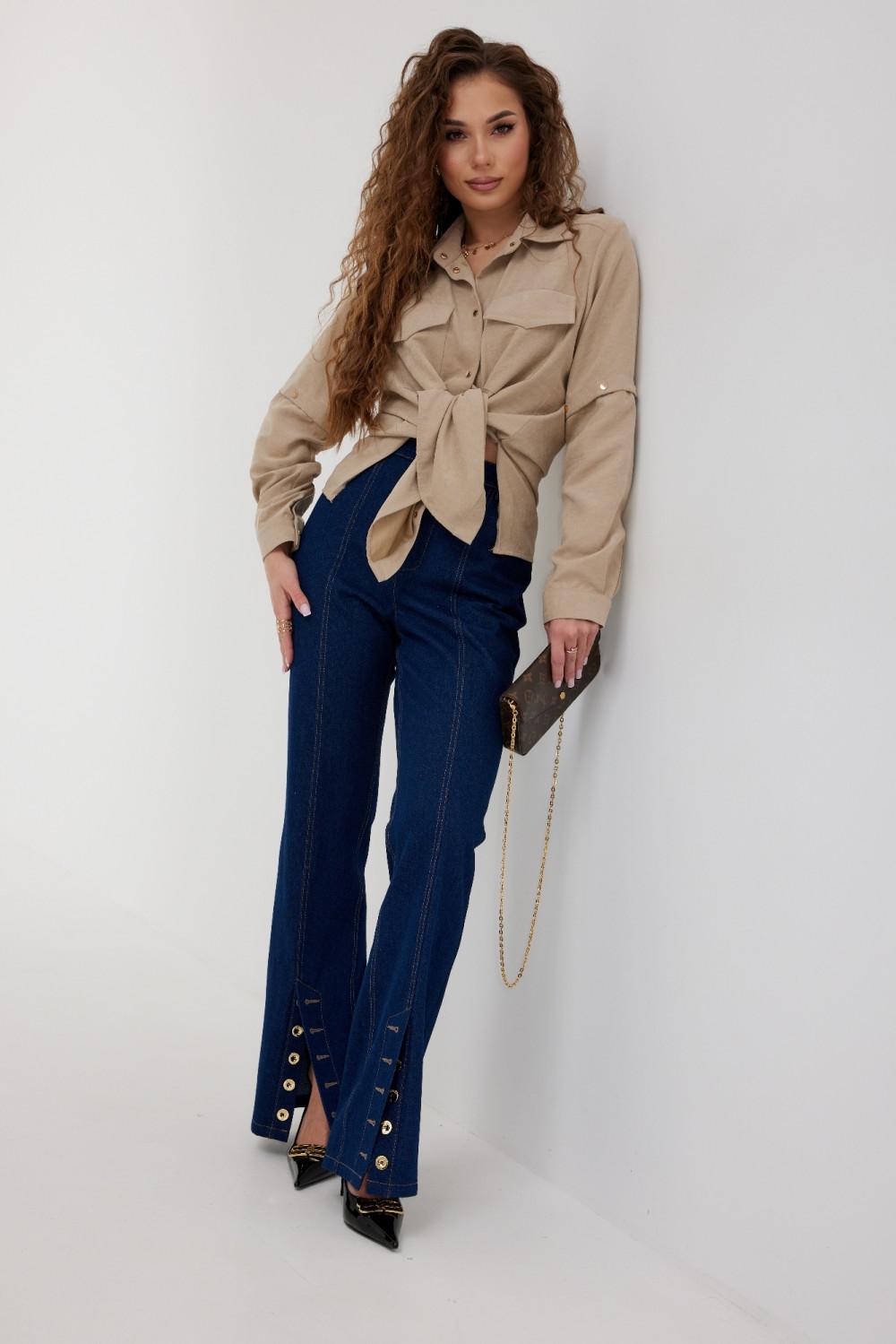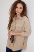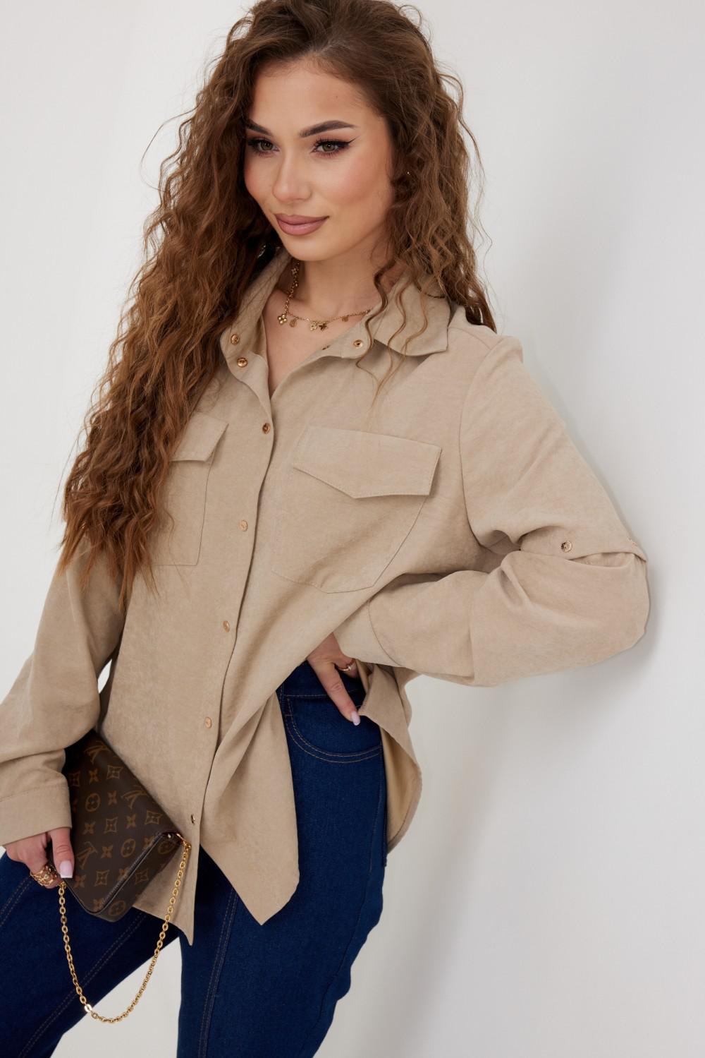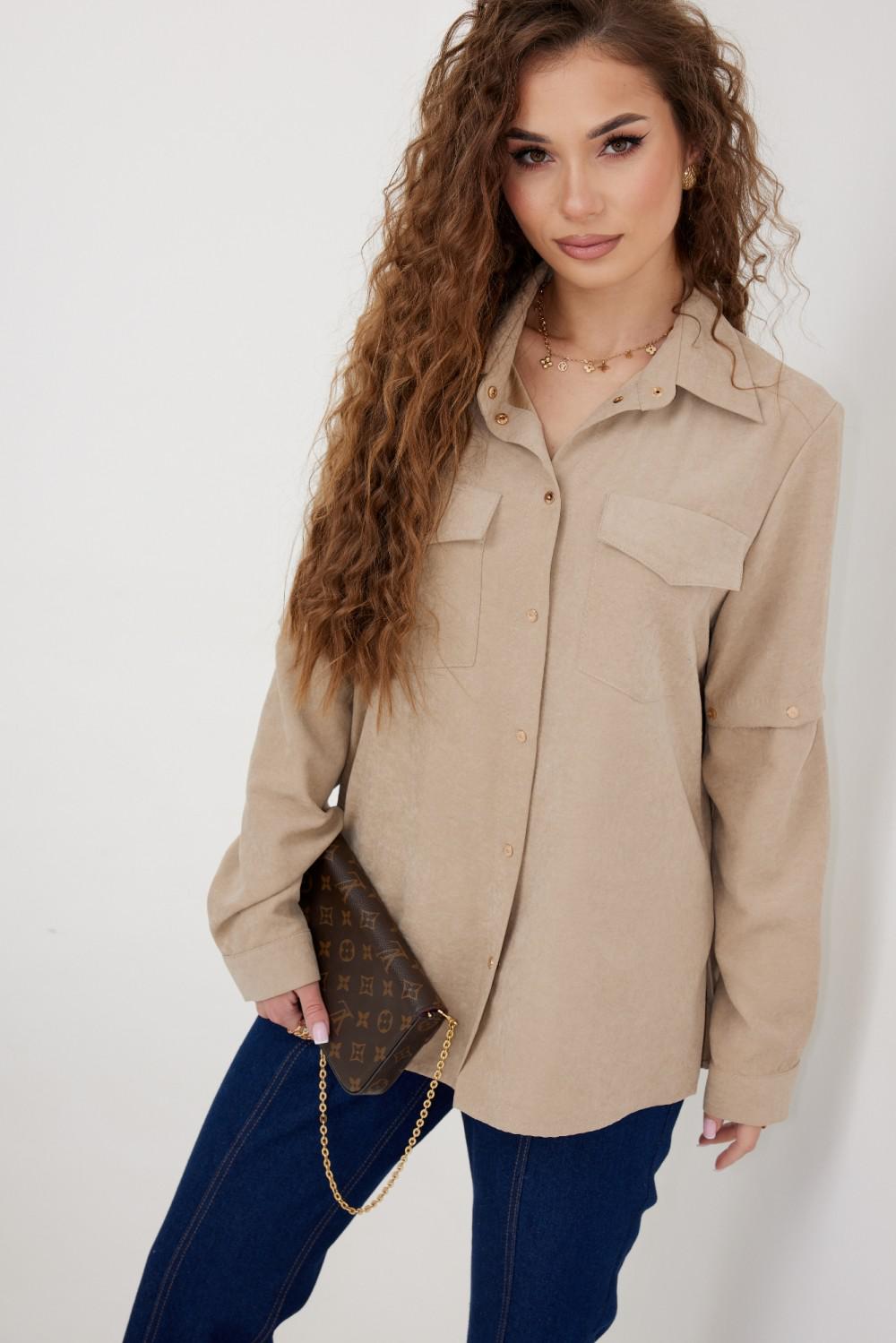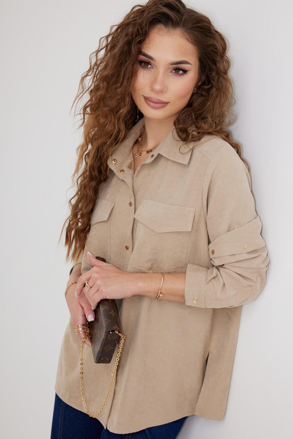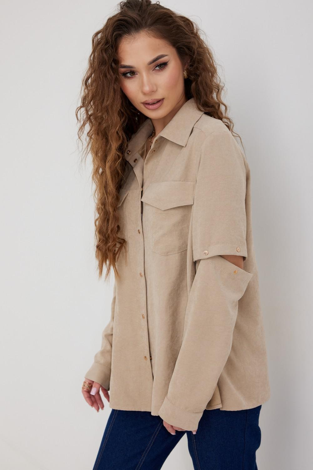 Блузка из плательно - блузочной ткани свободного силуэта. Спинка с кокеткой и встречной складкой. По переду центральная застежка на кнопки, сверху накладные карманы с клапанами. Втачной рукав с отстегивающейся нижней частью. По низу рукава манжет с кнопкой. Воротник рубашечный со стойкой.