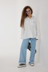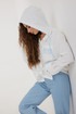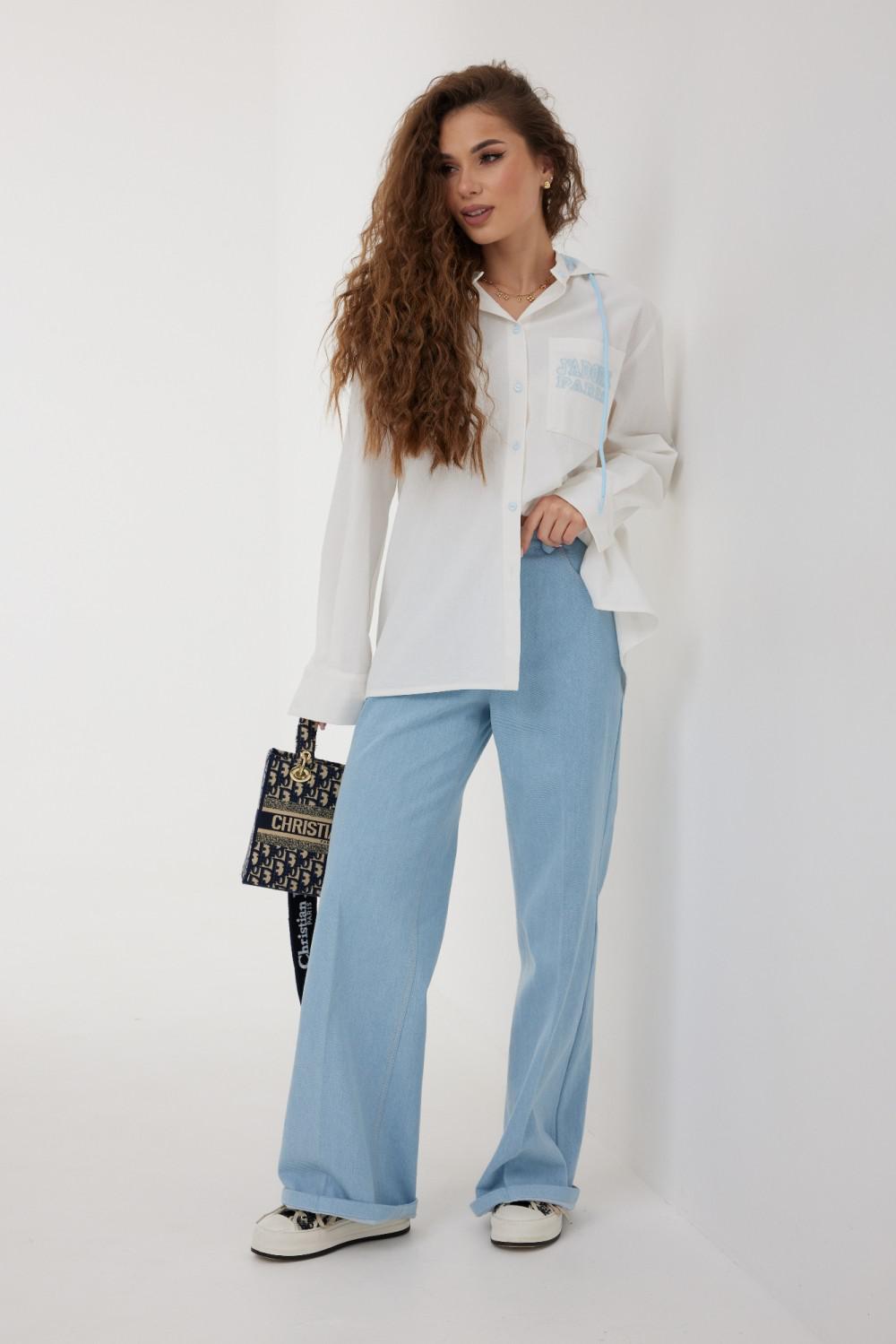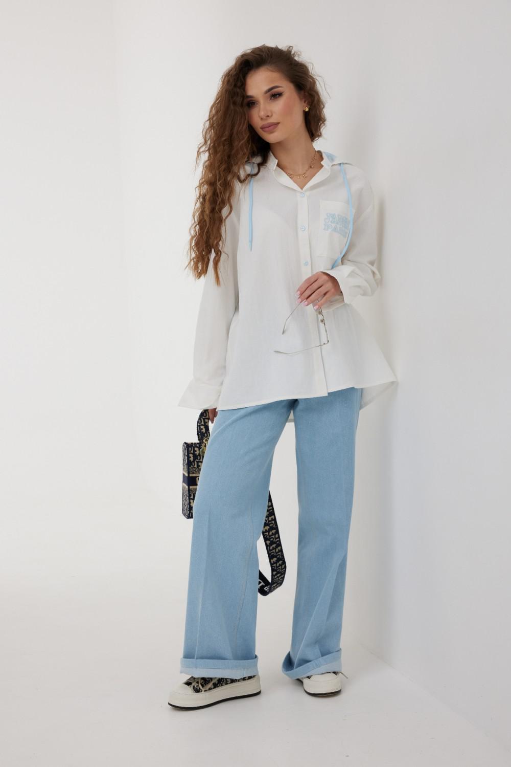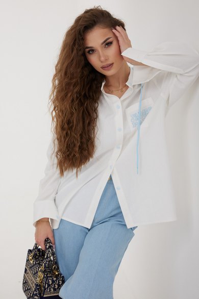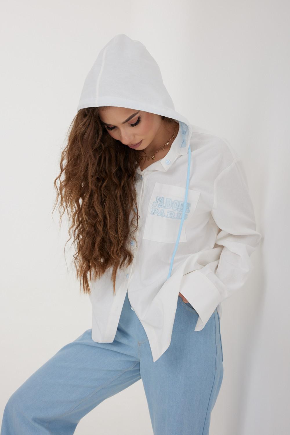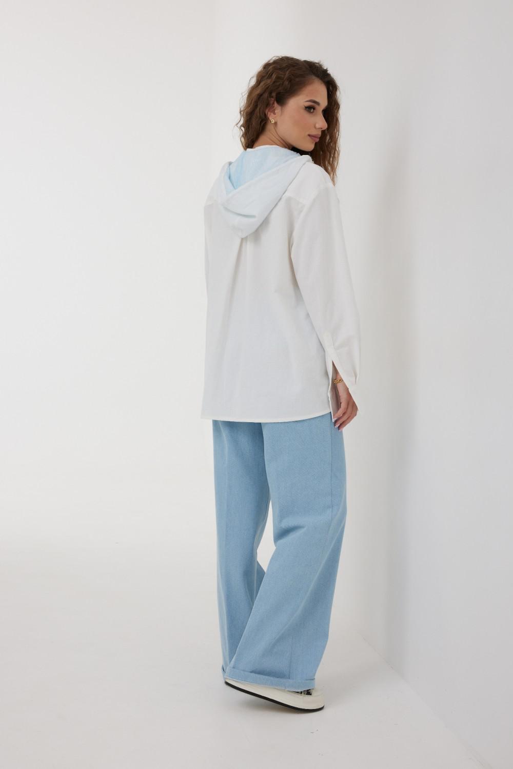 Блузка женская свободного силуэта со слегка спущенной линией плеча, с капюшоном. Застежка на планку с петлями и пуговицами. Воротник – невысокая стойка. Рукав свободный длинный, по низу на манжете, застегивающейся на две пуговицы. По переду слева накладной карман, декорированный вышивкой. Спинка удлиненная, с кокеткой и встречной складкой по центру. Внутренняя часть капюшона из кружева в тон вышивки и фурнитуры. По краю капюшона кулиса с втянутым шнуром.