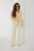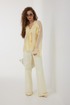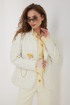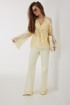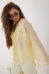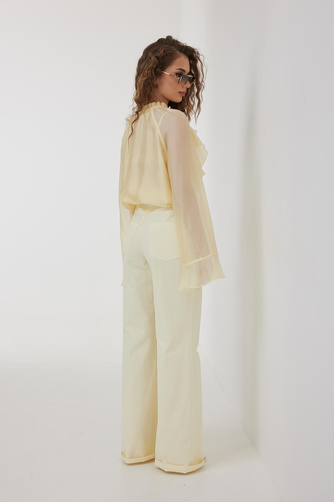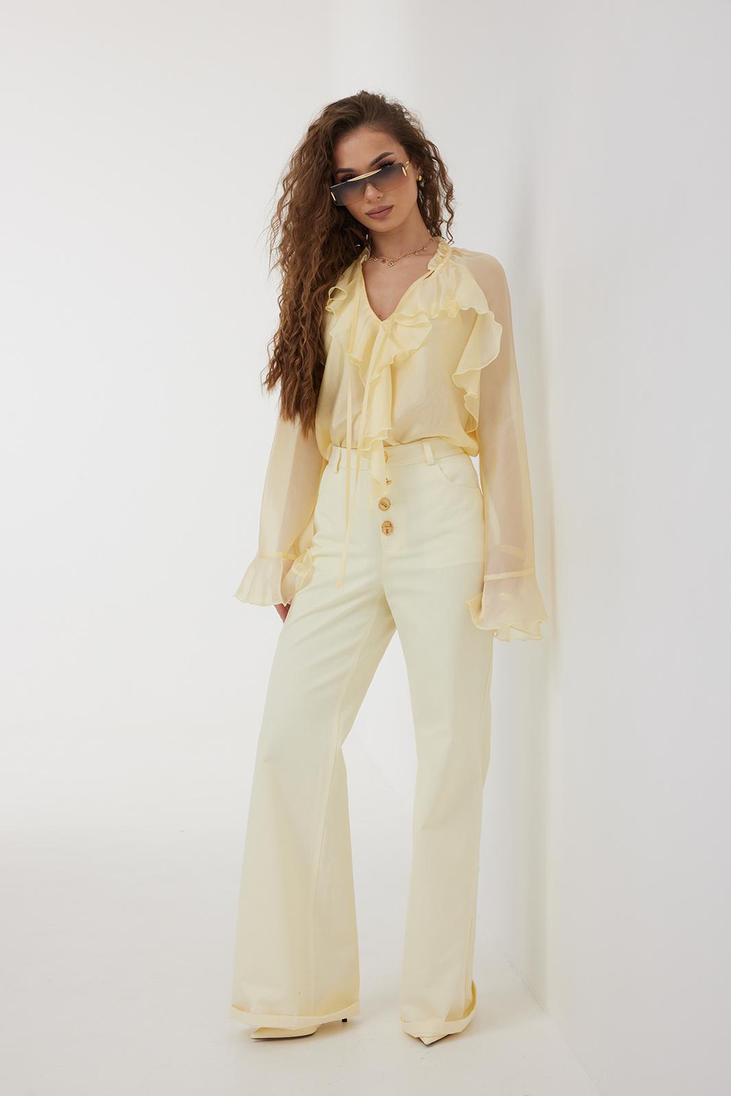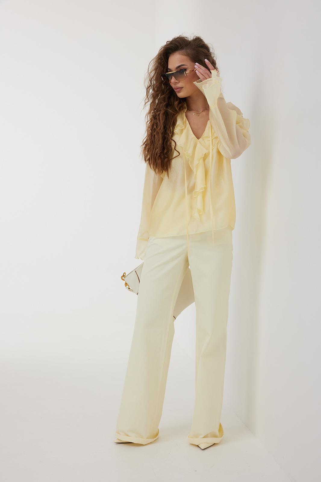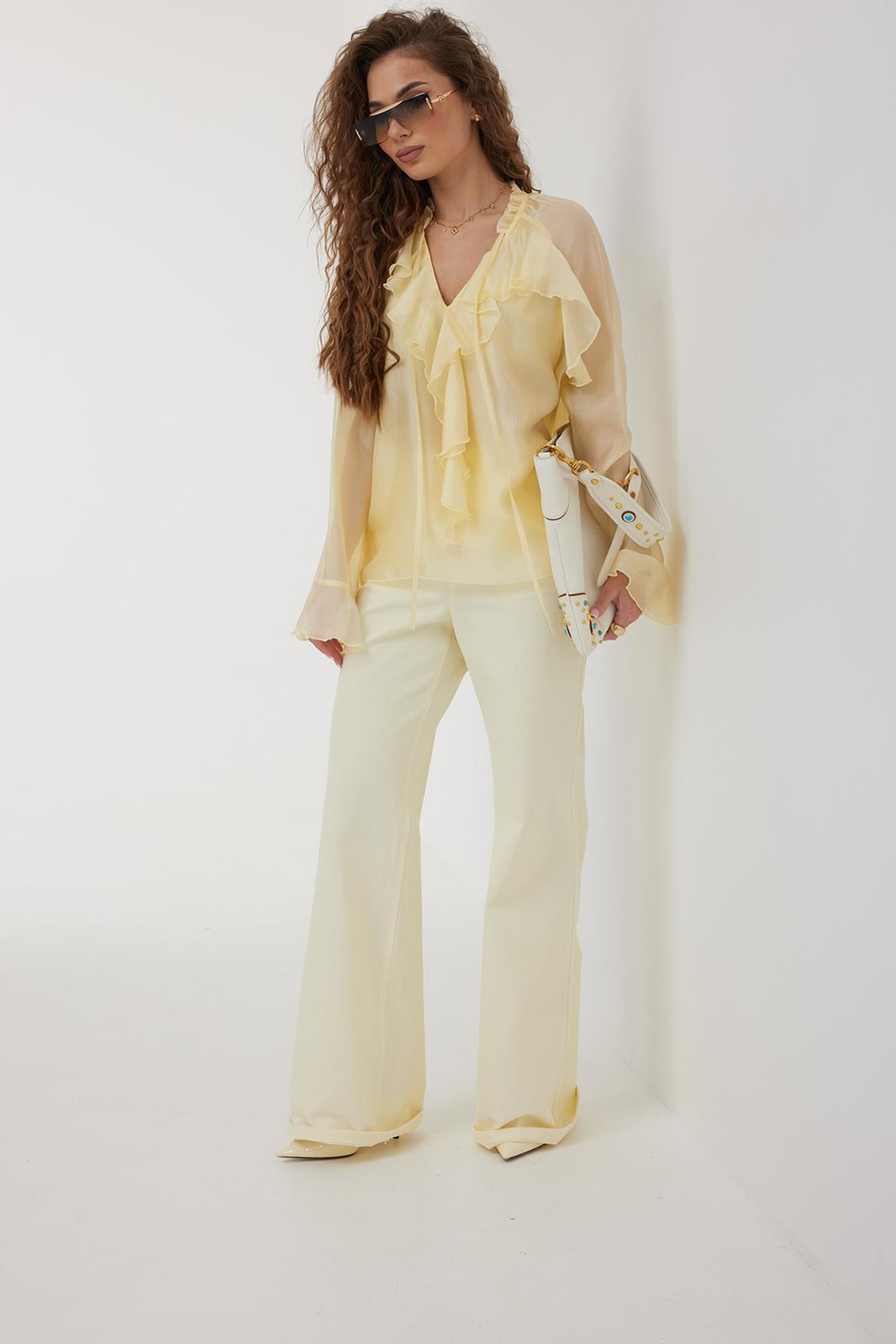 Блузка прямого силуэта из полупрозрачной ткани «органза». Рукав реглан расширенный, по низу волан. По переду горловина V-образной формы с рюшей и завязками. Перед с декоративным воланом. Перед и спинка двойные.
