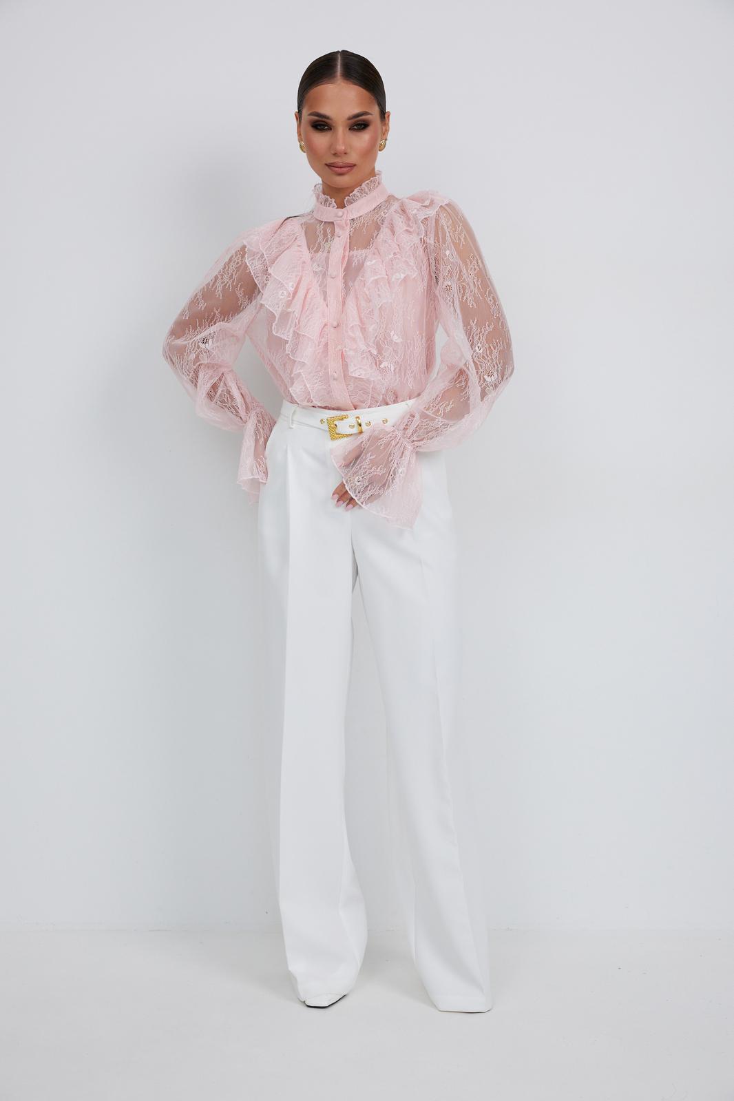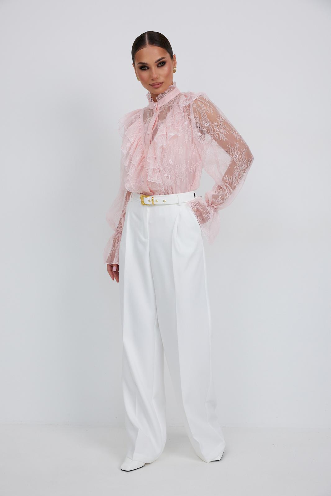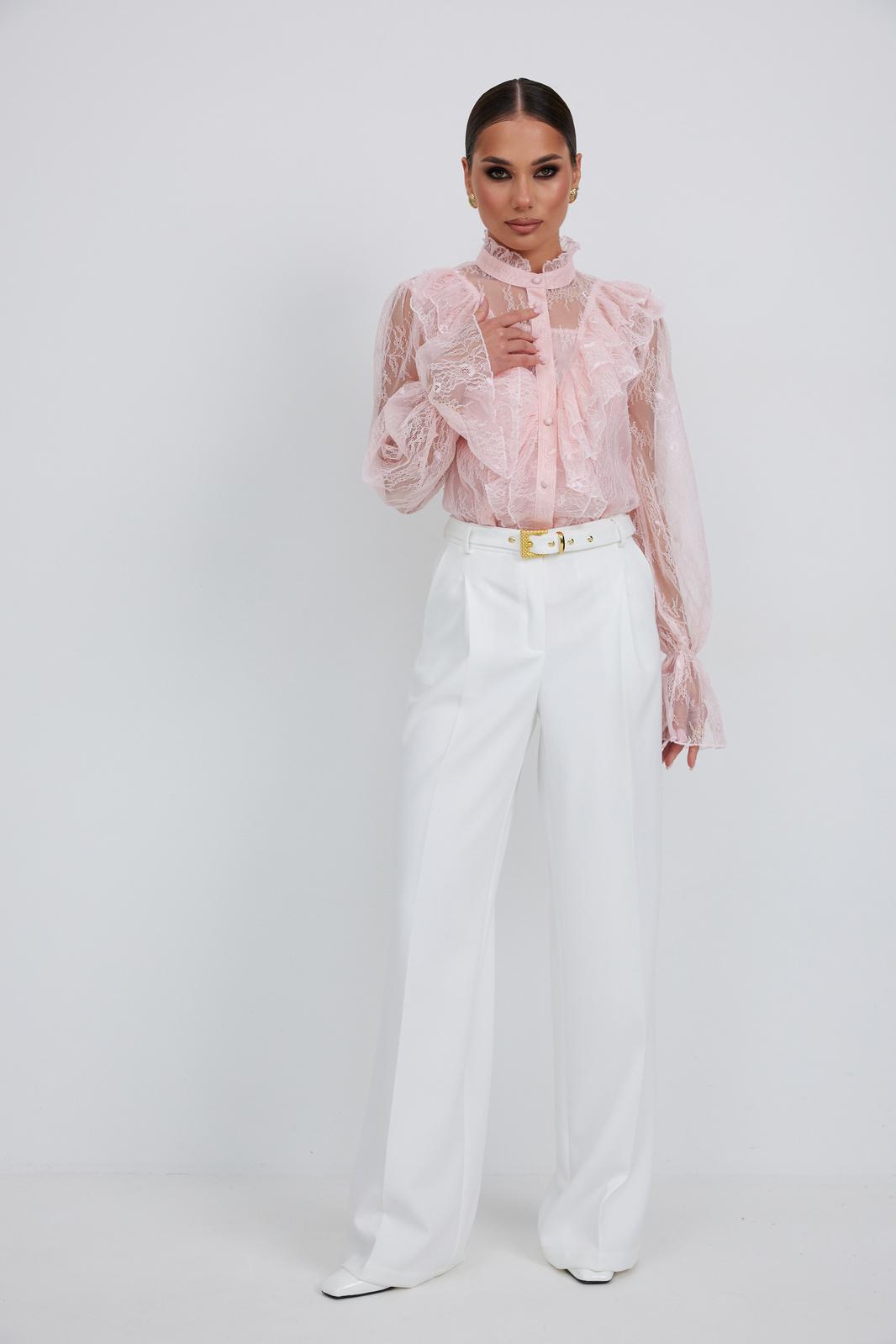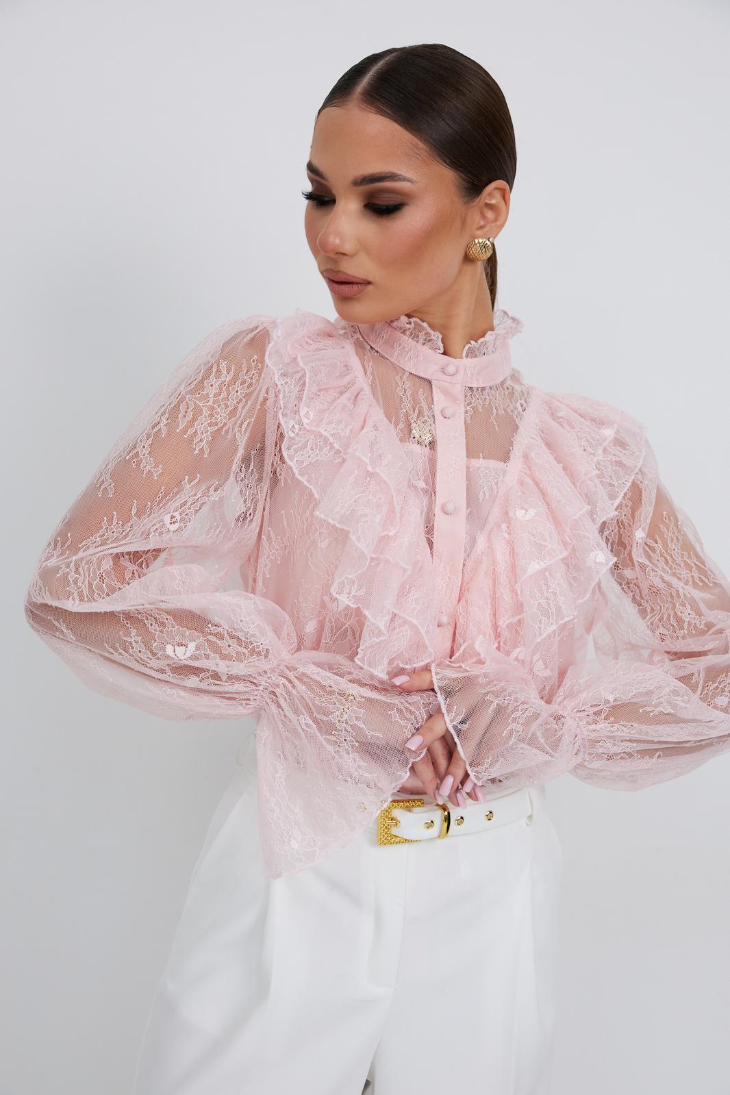 Блузка женская свободного силуэта, из легчайшего кружева. По переду подрез с воланами. Застежка на планку с декоративными пуговицами. Воротник - стойка с небольшой рюшей. Рукав длинный объемный со сборкой в верхней части, в нижней части рукав собран на эластичную тесьму и образует волан. В комплект с блузкой предлагается топ на регулируемых бретелях.