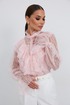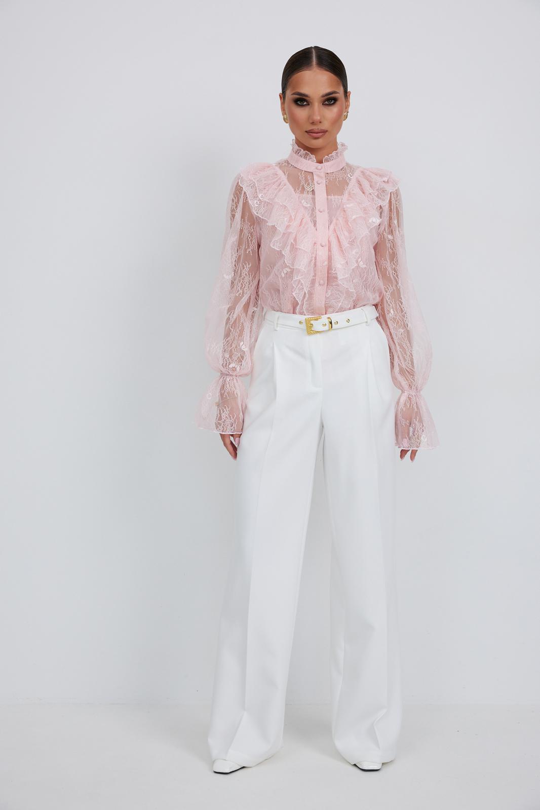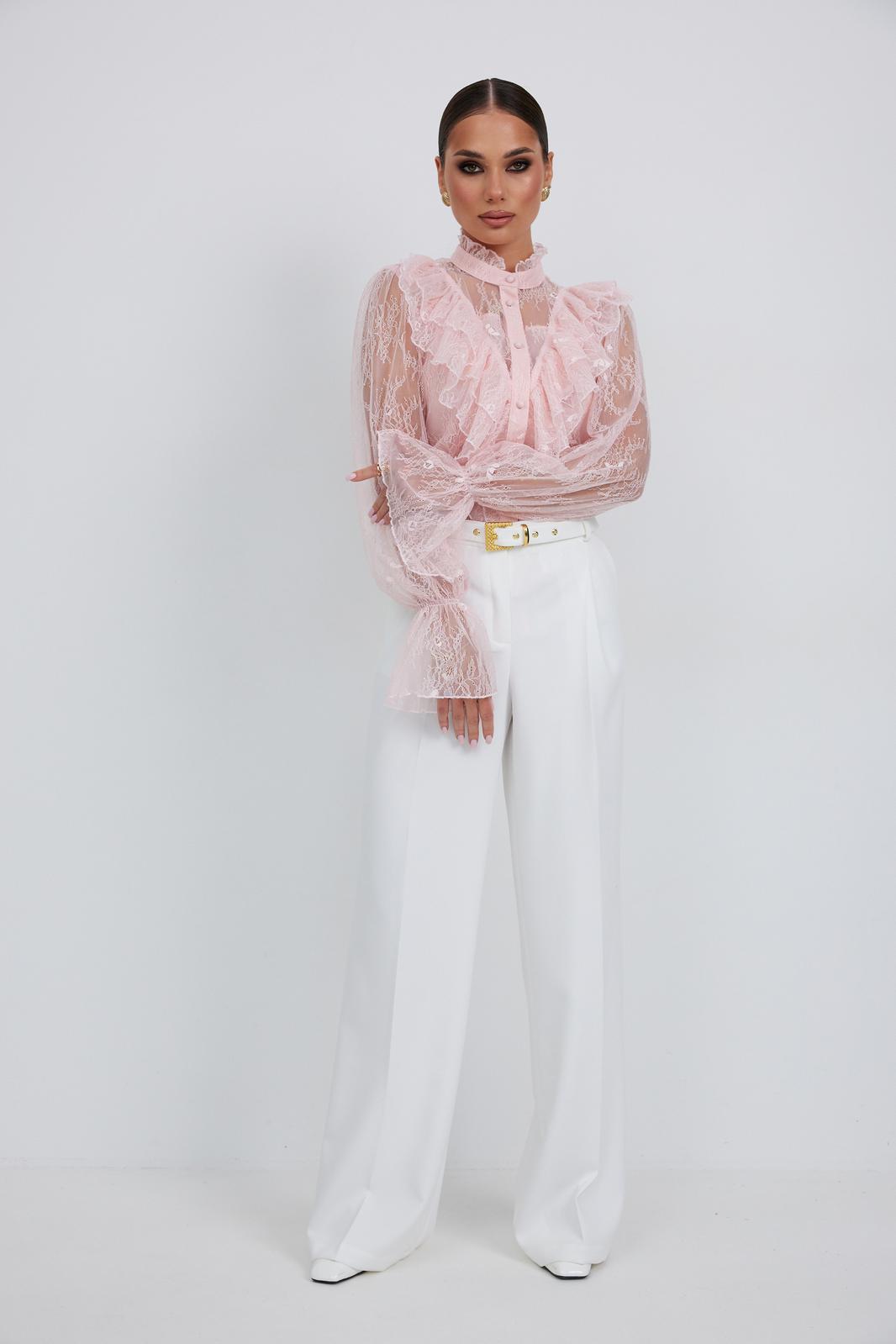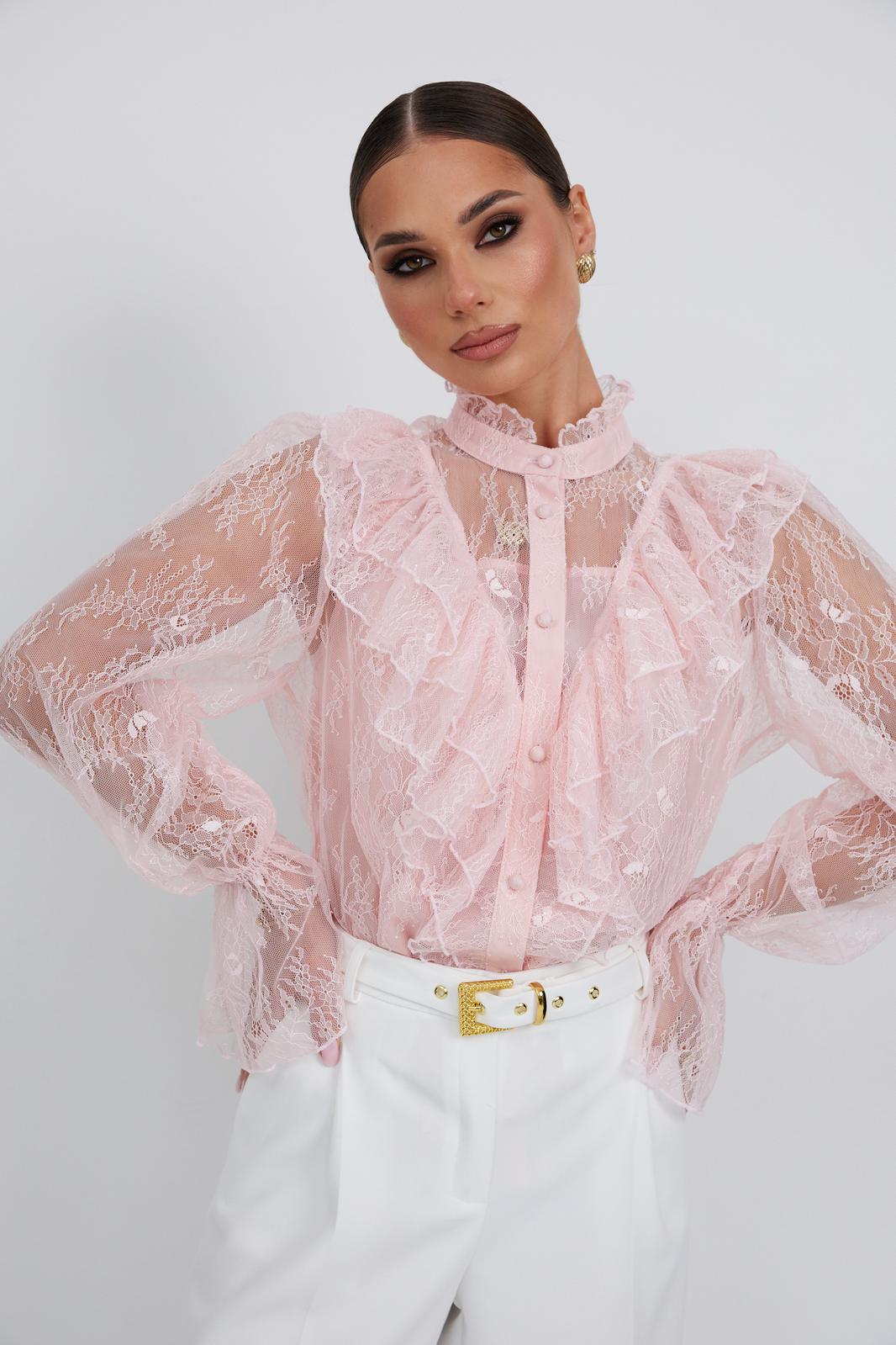 Блузка женская свободного силуэта, из легчайшего кружева. По переду подрез с воланами. Застежка на планку с декоративными пуговицами. Воротник - стойка с небольшой рюшей. Рукав длинный объемный со сборкой в верхней части, в нижней части рукав собран на эластичную тесьму и образует волан. В комплект с блузкой предлагается топ на регулируемых бретелях.