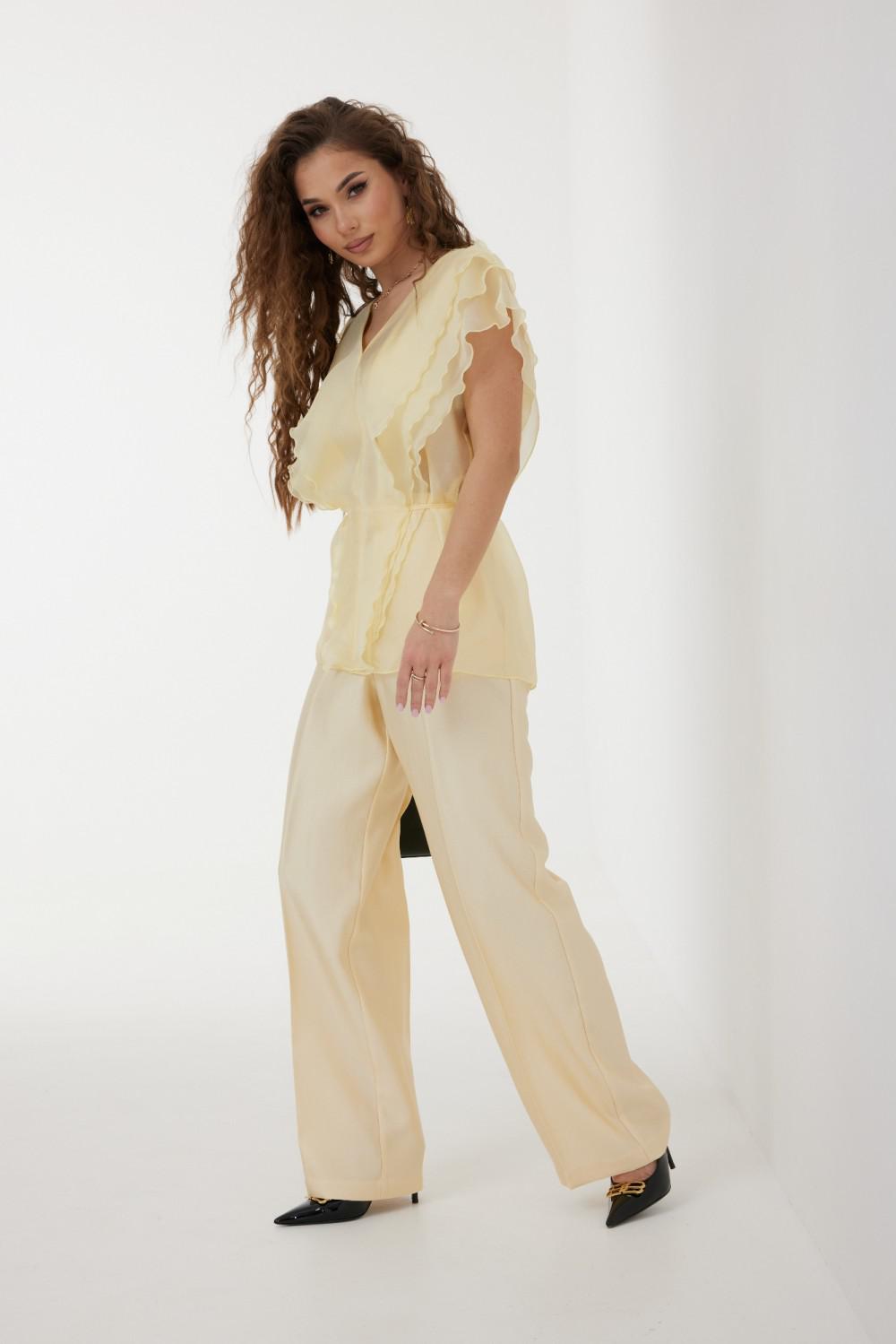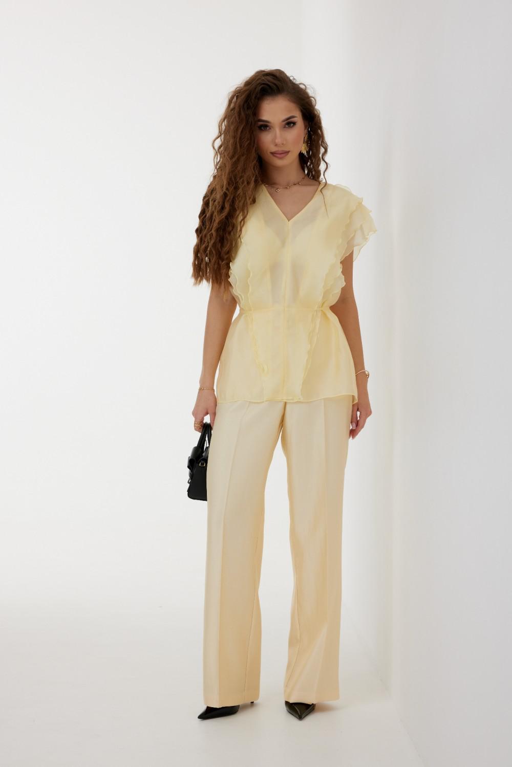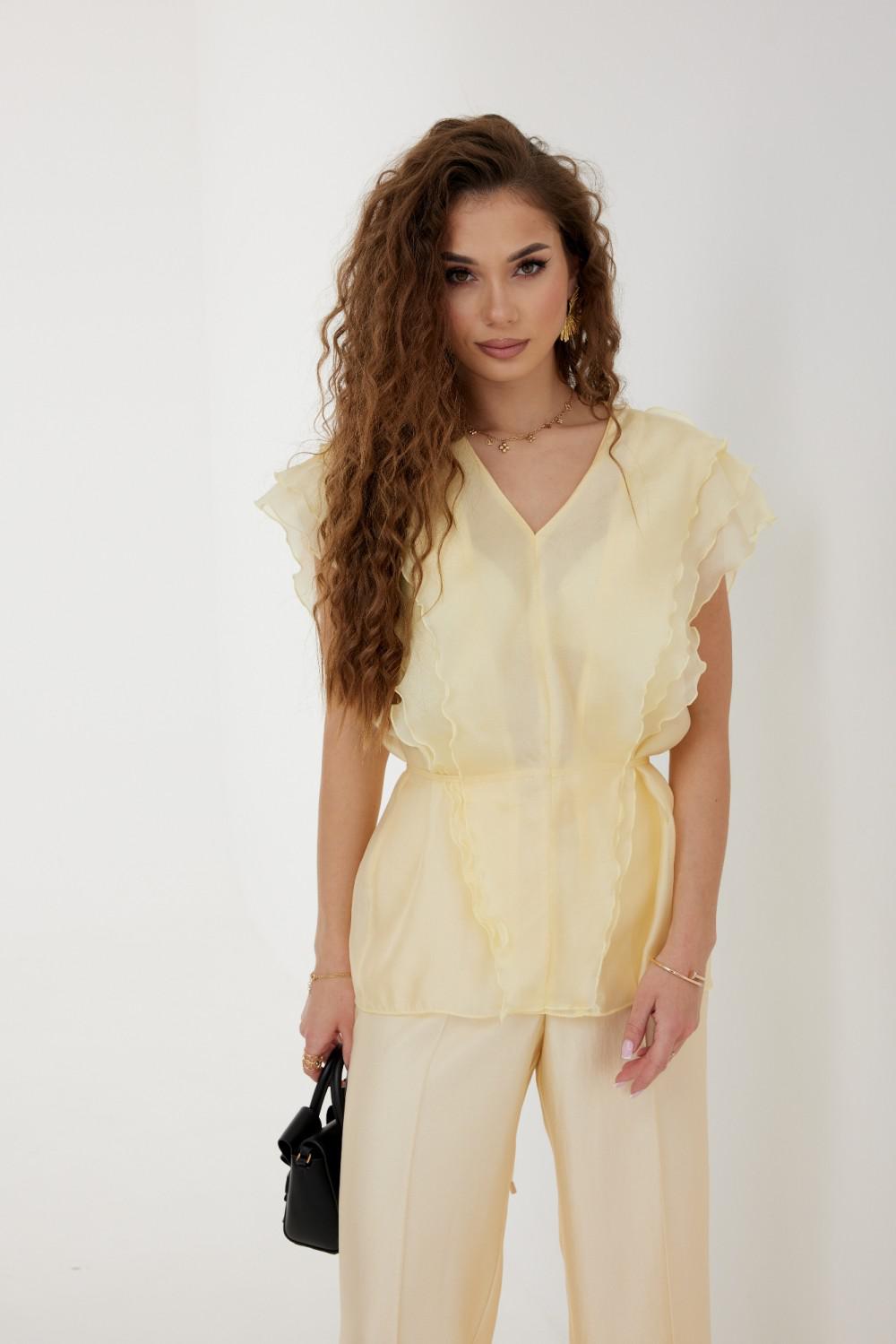 Блузка женская прямого силуэта, длиной до уровня бедер, с воланами, образующими рукава-«крылышки», по переду воланы до низа, по спинке входят в рельефы на уровне талии. Вырез горловины V-образной формы. Спереди под верхний волан вставлен пояс-шнурок, завязывающийся вокруг талии.