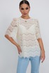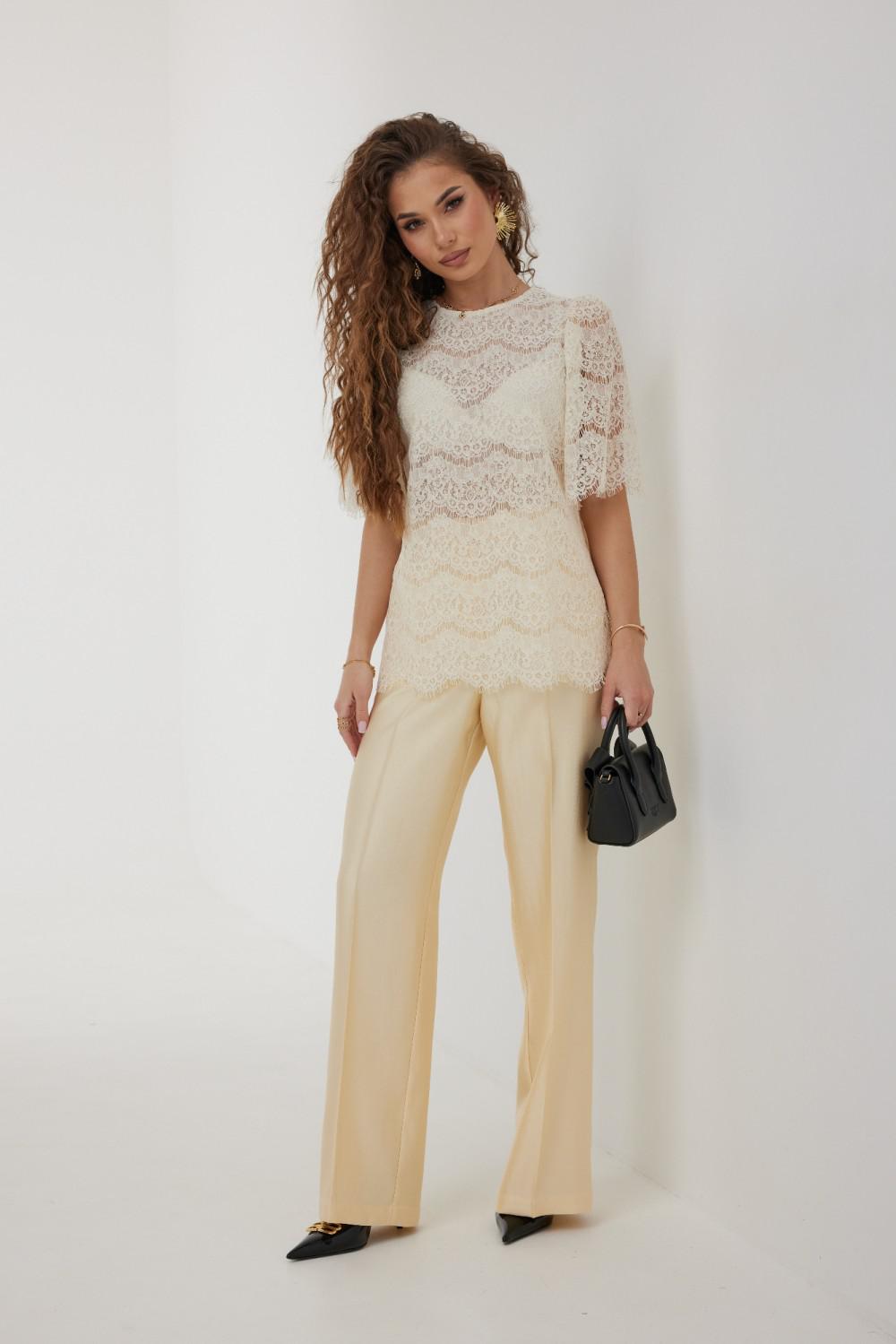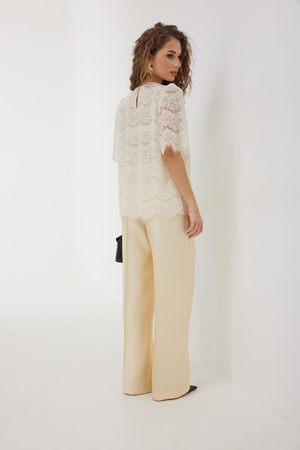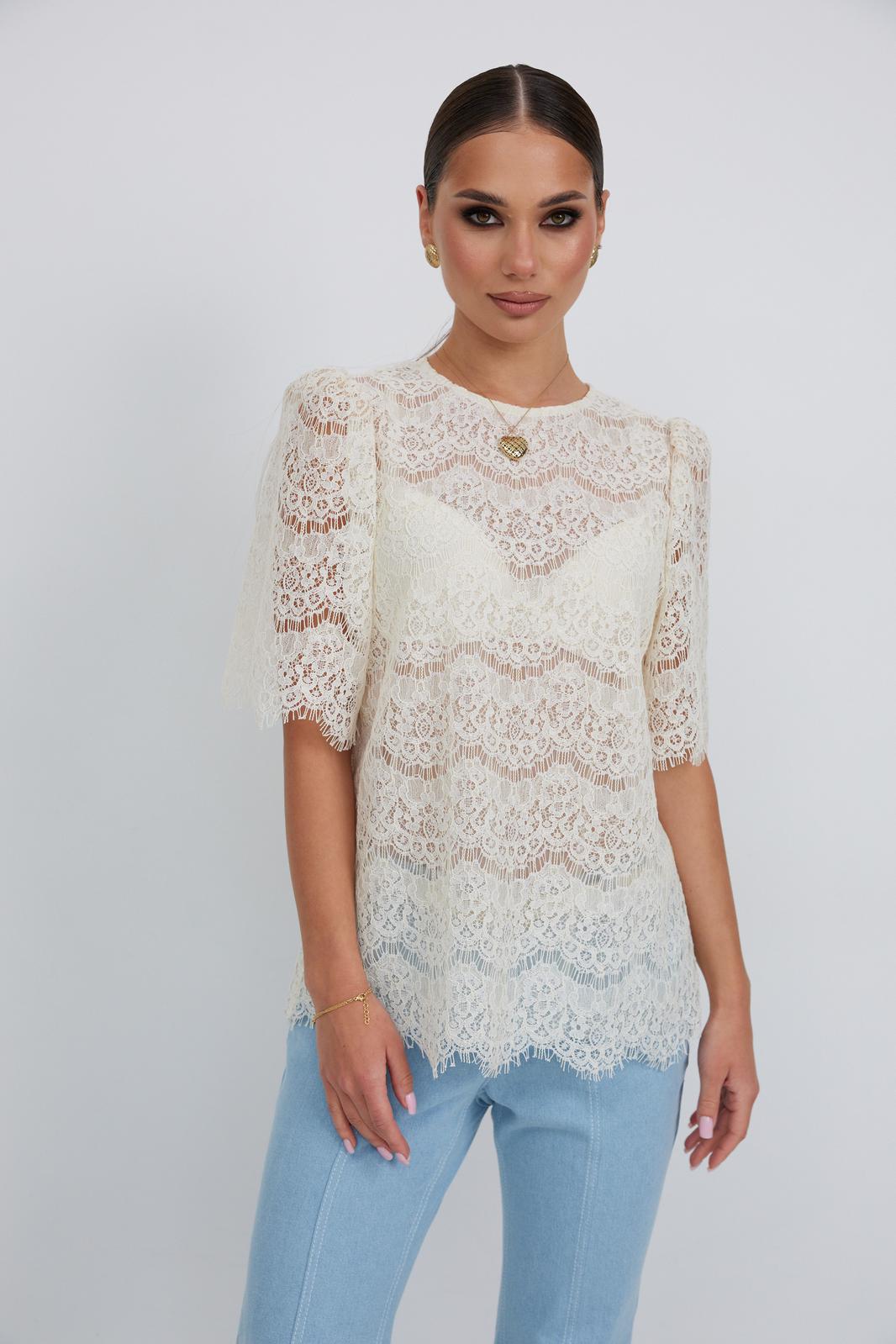 Блузка прямого силуэта с укороченным плечом из кружевной ткани. Горловина округлой формы, по спинке застежка на навесную петлю и пуговицу. Рукав свободный длиной до локтя, со сборкой в верхней части. Спинка и перед на подкладке сетка.