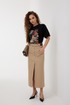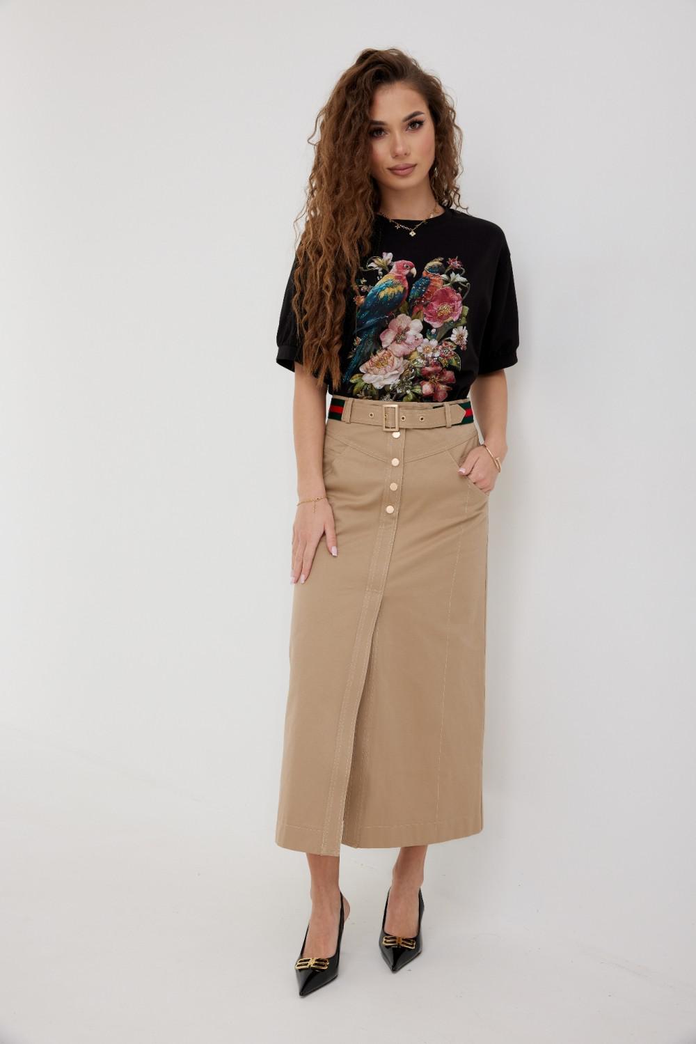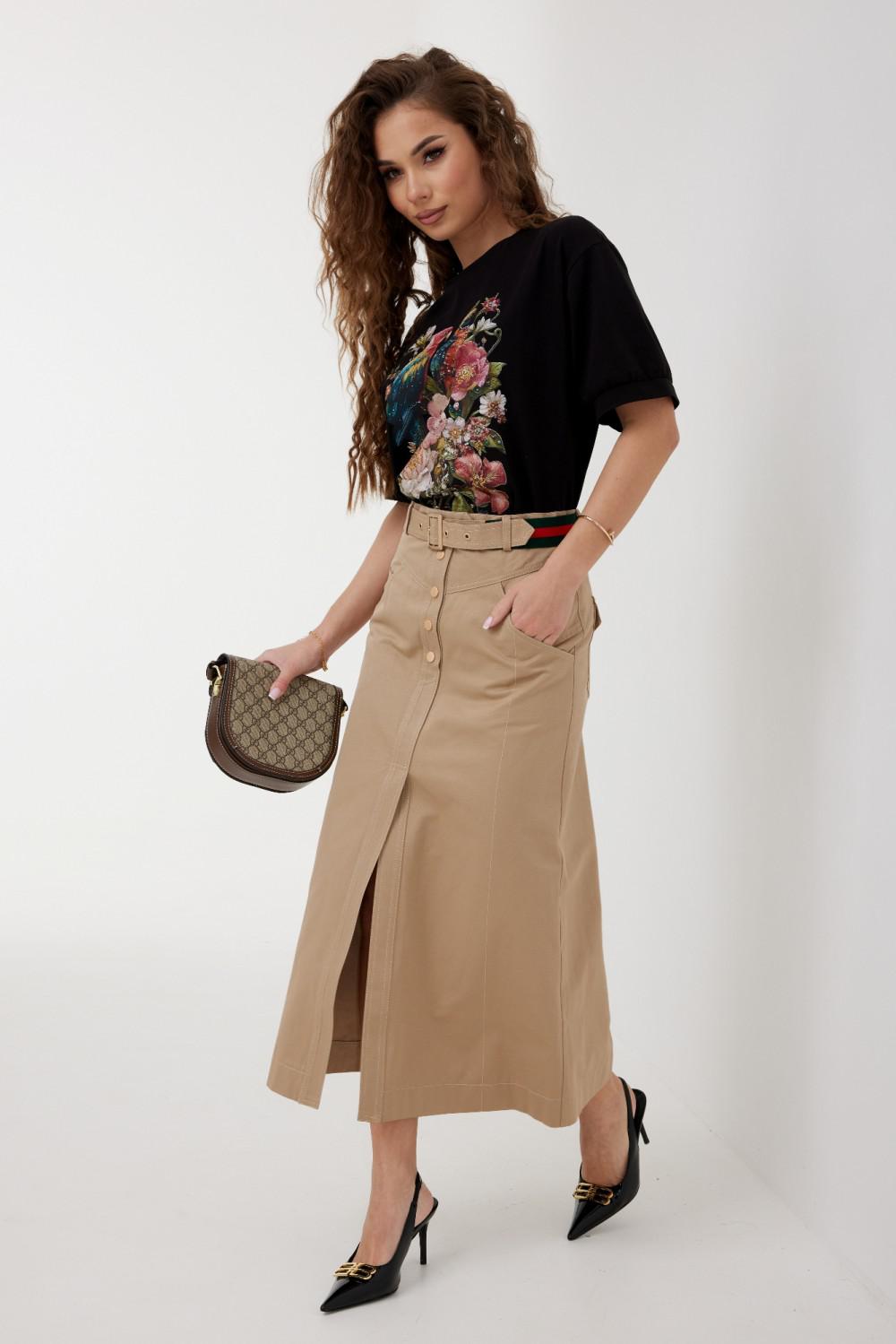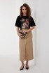 Блузка прямого силуэта из трикотажного полотна. Горловина круглой формы с бейкой. Расширенная линия плеча. Рукав короткий по низу с манжетой. Перед декорирован печатью.