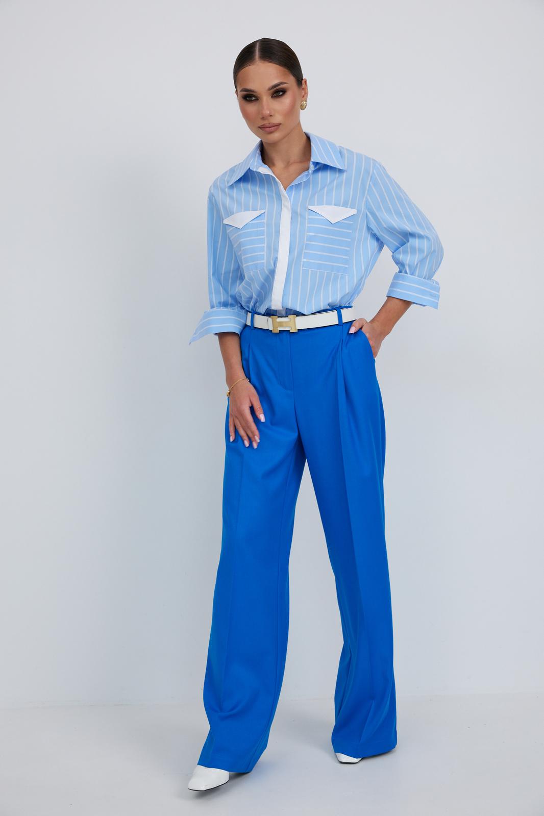 Блузка женская свободного силуэта, из рубашечной ткани в полоску. Спинка с кокеткой и складкой. Скрытая застежка на петли и пуговицы, по переду накладные карманы с элементом из отделочной ткани, рукав свободный, по низу манжета с пуговицами. Воротник рубашечный со стойкой.