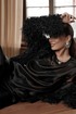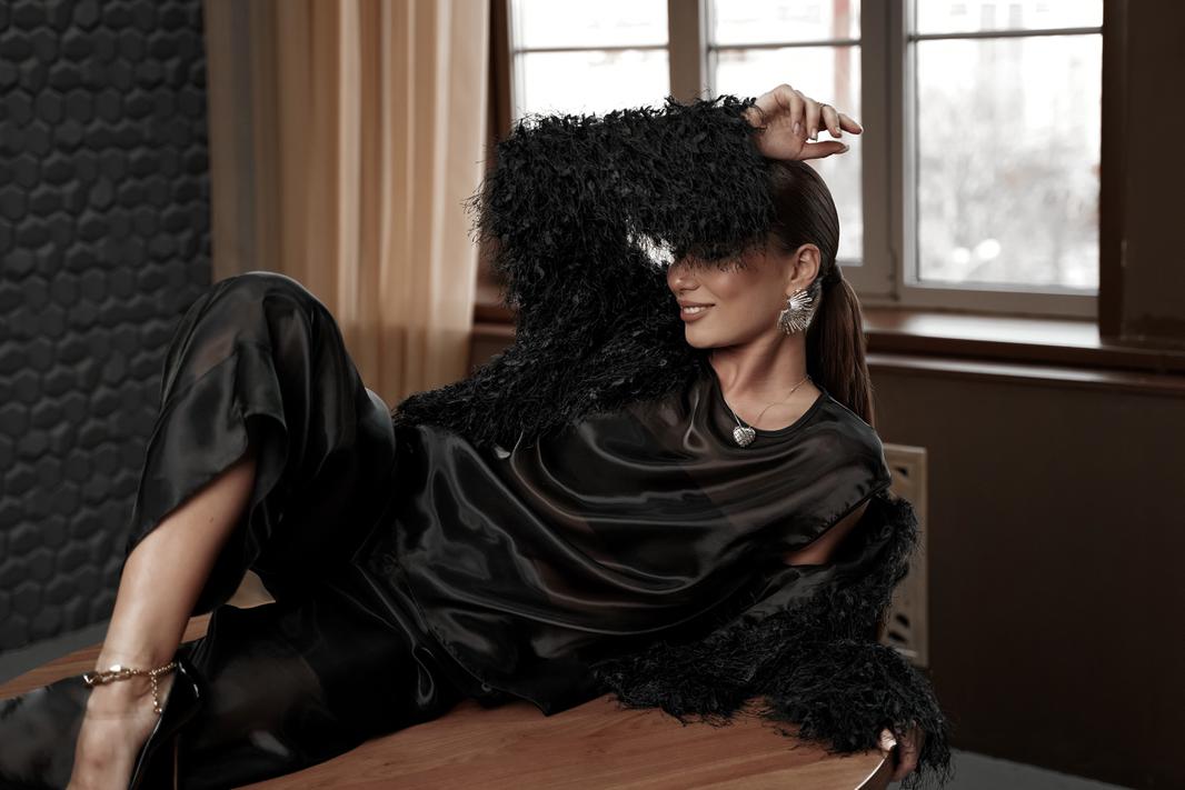 Брюки из нарядной полупрозрачной ткани «органза», прямые, широкие. Средняя посадка, пояс притачной, застежка спереди на молнию и декоративную пуговицу. Брюки с глубокими складками по переду. Брюки на подкладке в виде шорт.