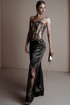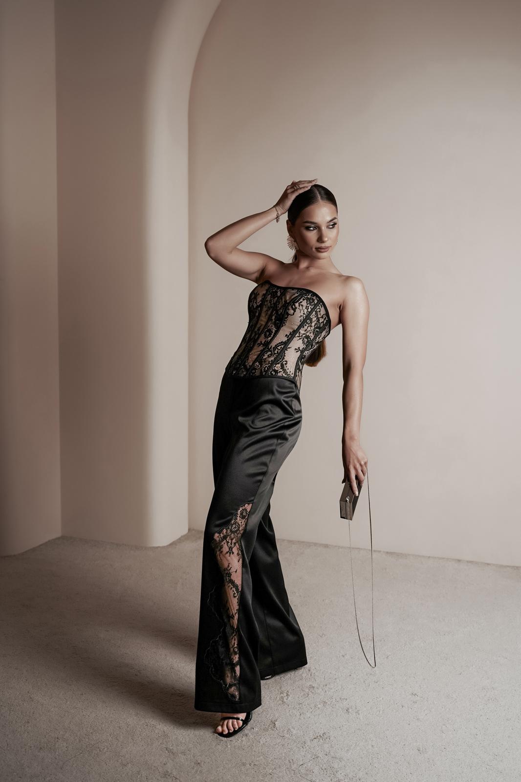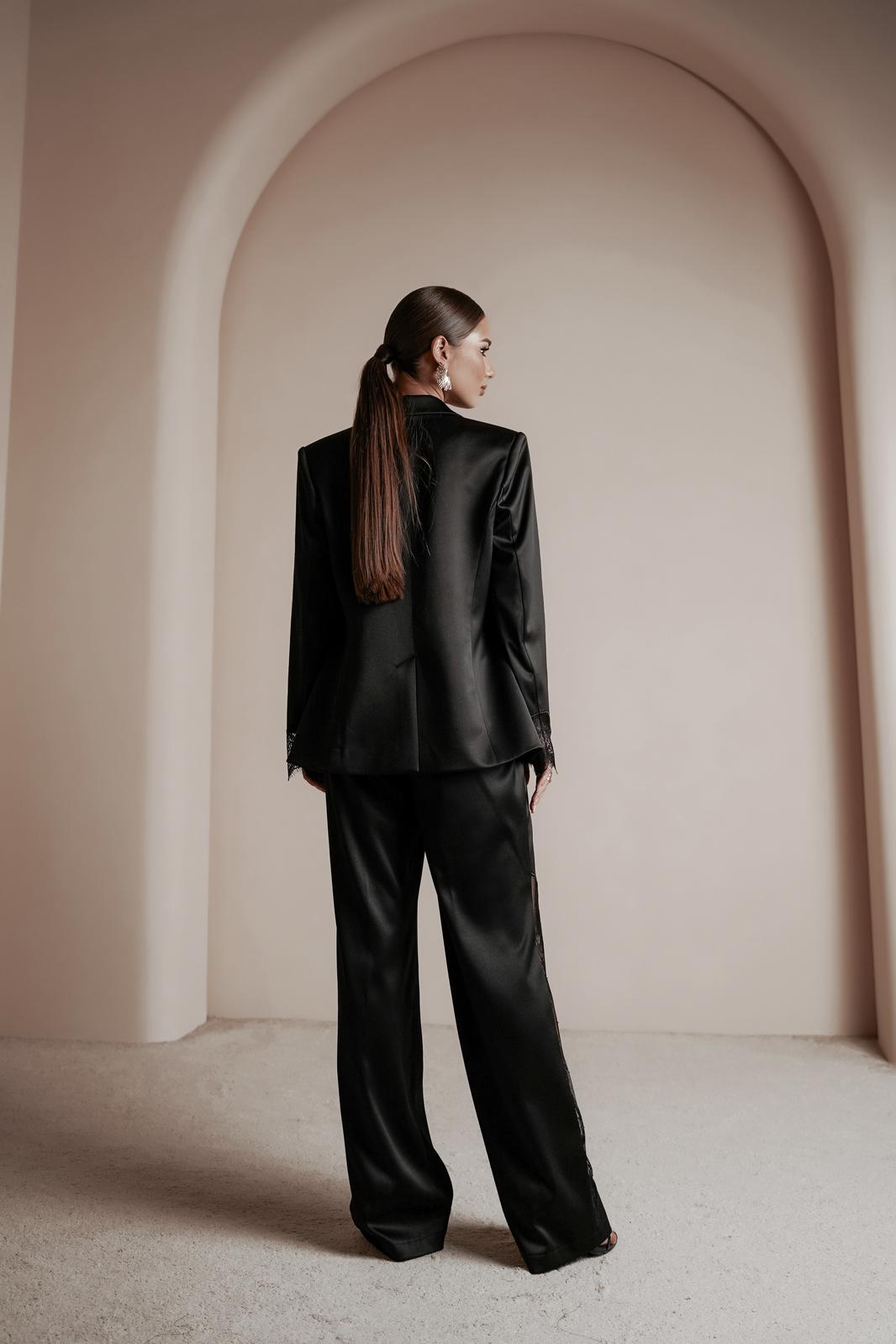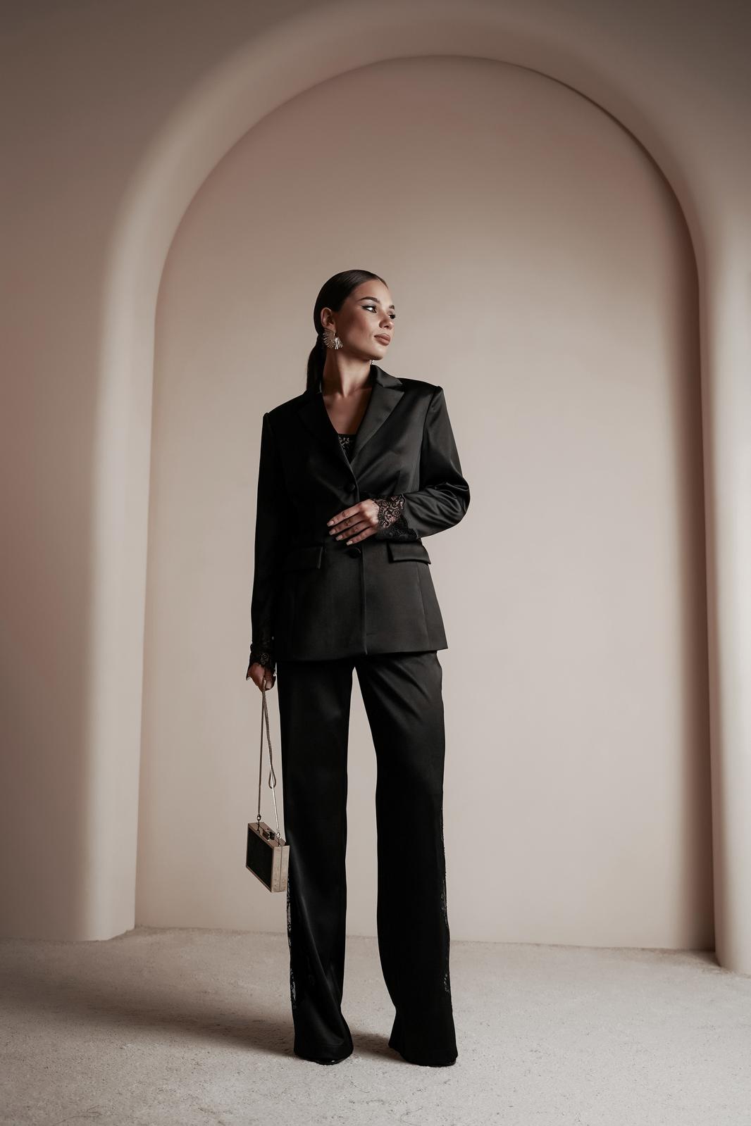 Брюки прямые из атласной ткани. По передним половинкам ближе к боковому шву – вышивка с кружевом.
