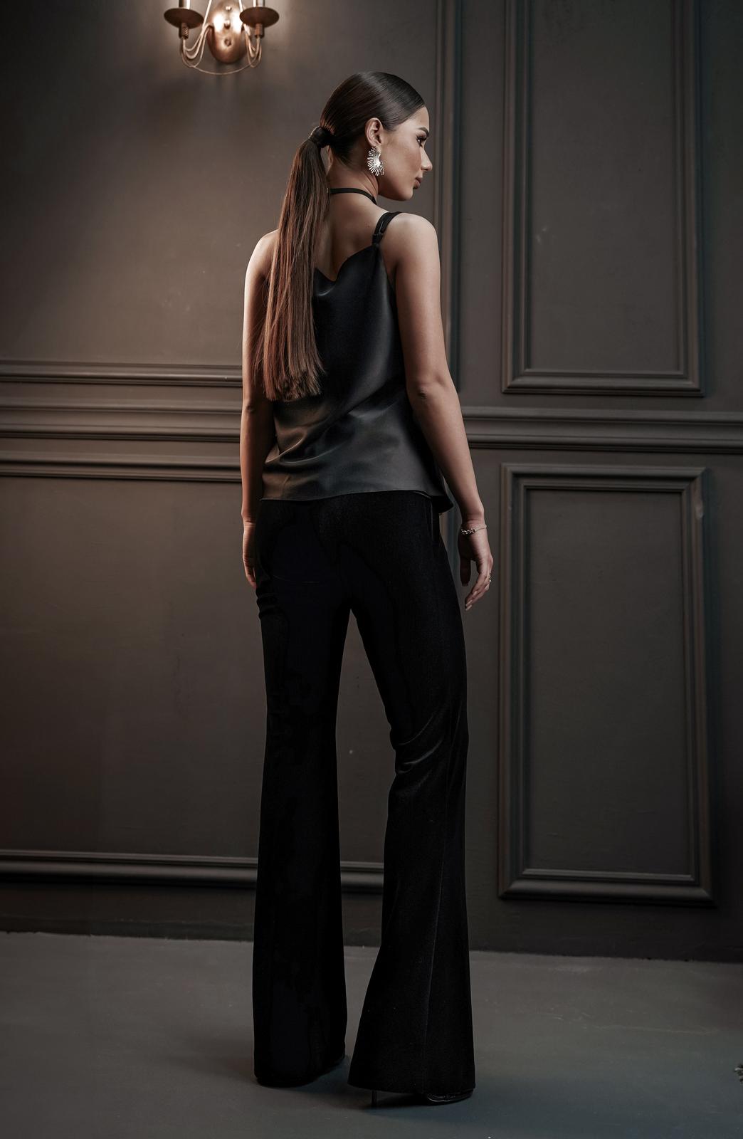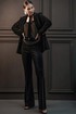 Брюки женские из трикотажного полотна «бархат», прилегающего силуэта, удлинённые, расклешенные книзу, с высокой посадкой, пояс притачной с резинкой сзади, застежка в боковом шве на потайную молнию. Пояс брюк спереди декорирован съемной цепочкой.