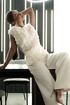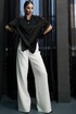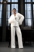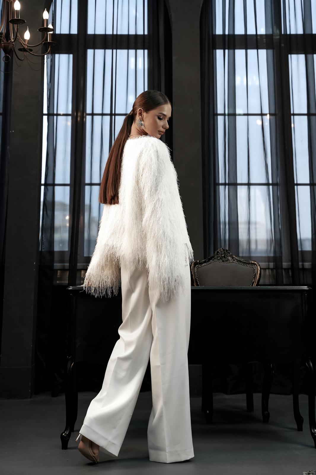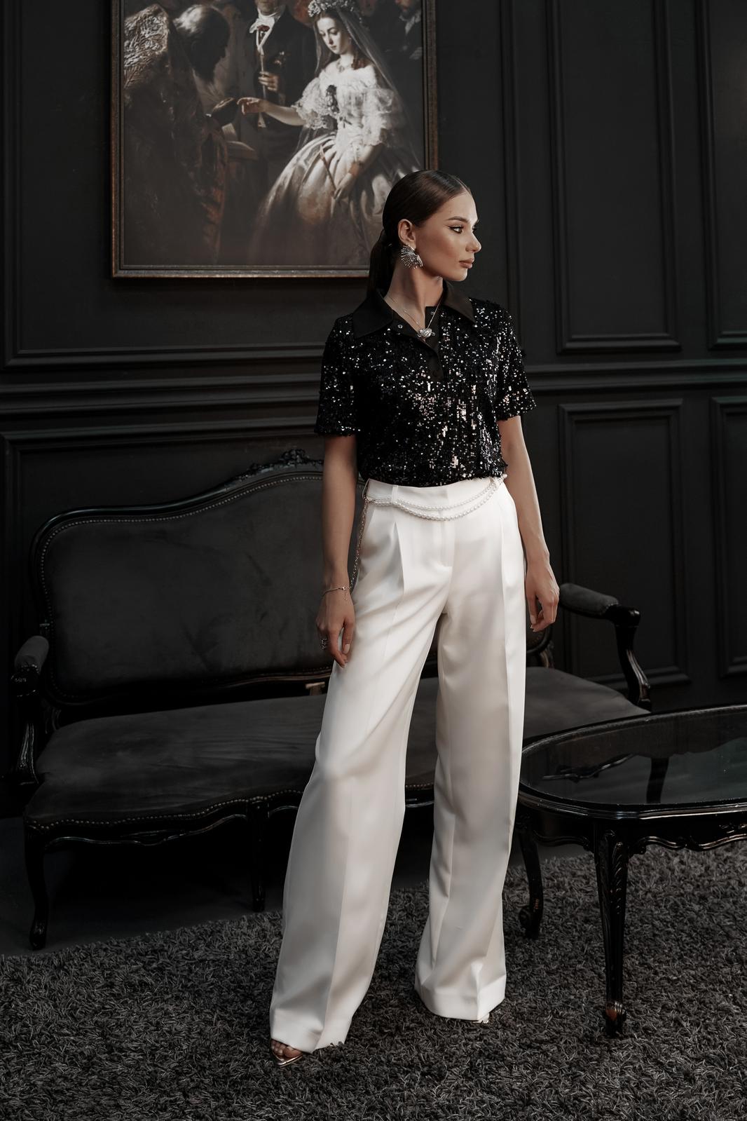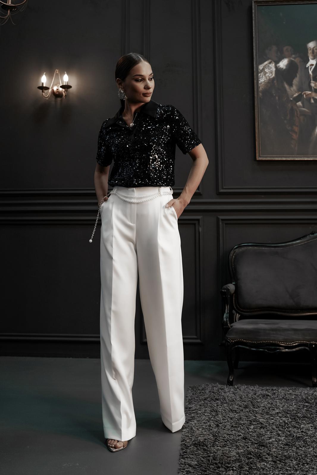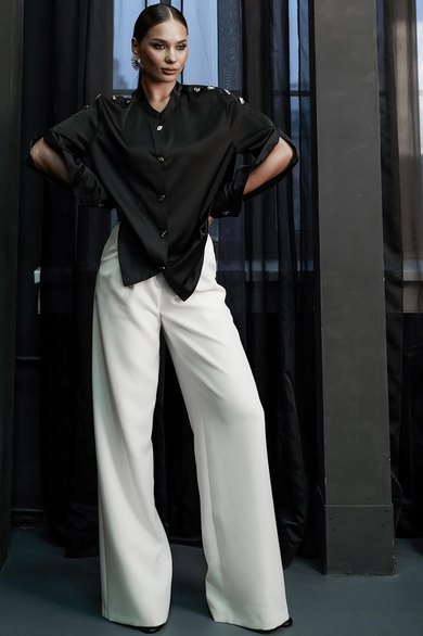 Брюки прямые из костюмной ткани. Верх на поясе со шлевками. Ширинка на молнии и удлиненный пояс со скрытой застежкой на пуговицу и крючок. На передних половинках брюк по две односторонние складки , диагональные боковые карманы.