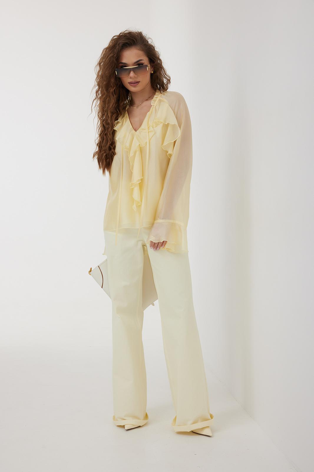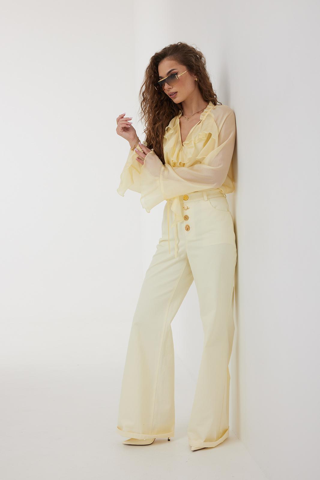 Джинсы с высокой посадкой прямого силуэта. Застежка на петли и декоративные пуговицы. По переду карманы, сзади накладные карманы. По швам контрастная отделочная строчка.