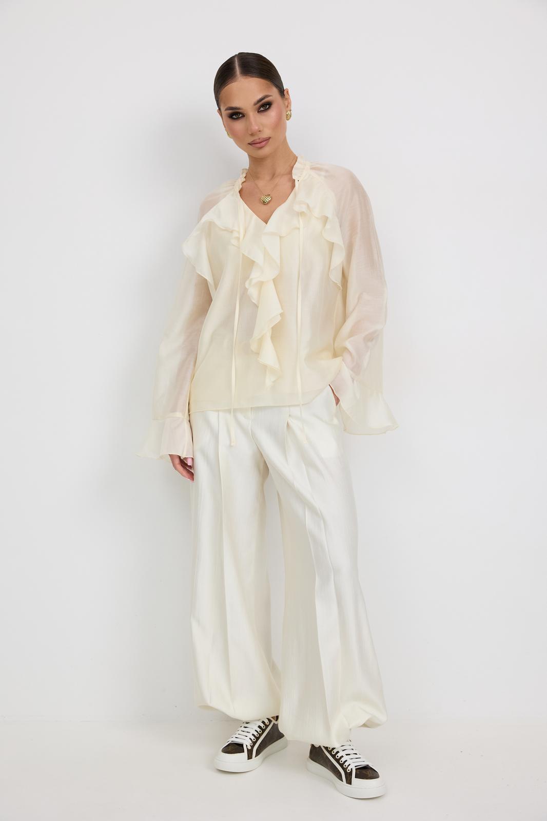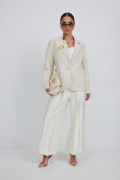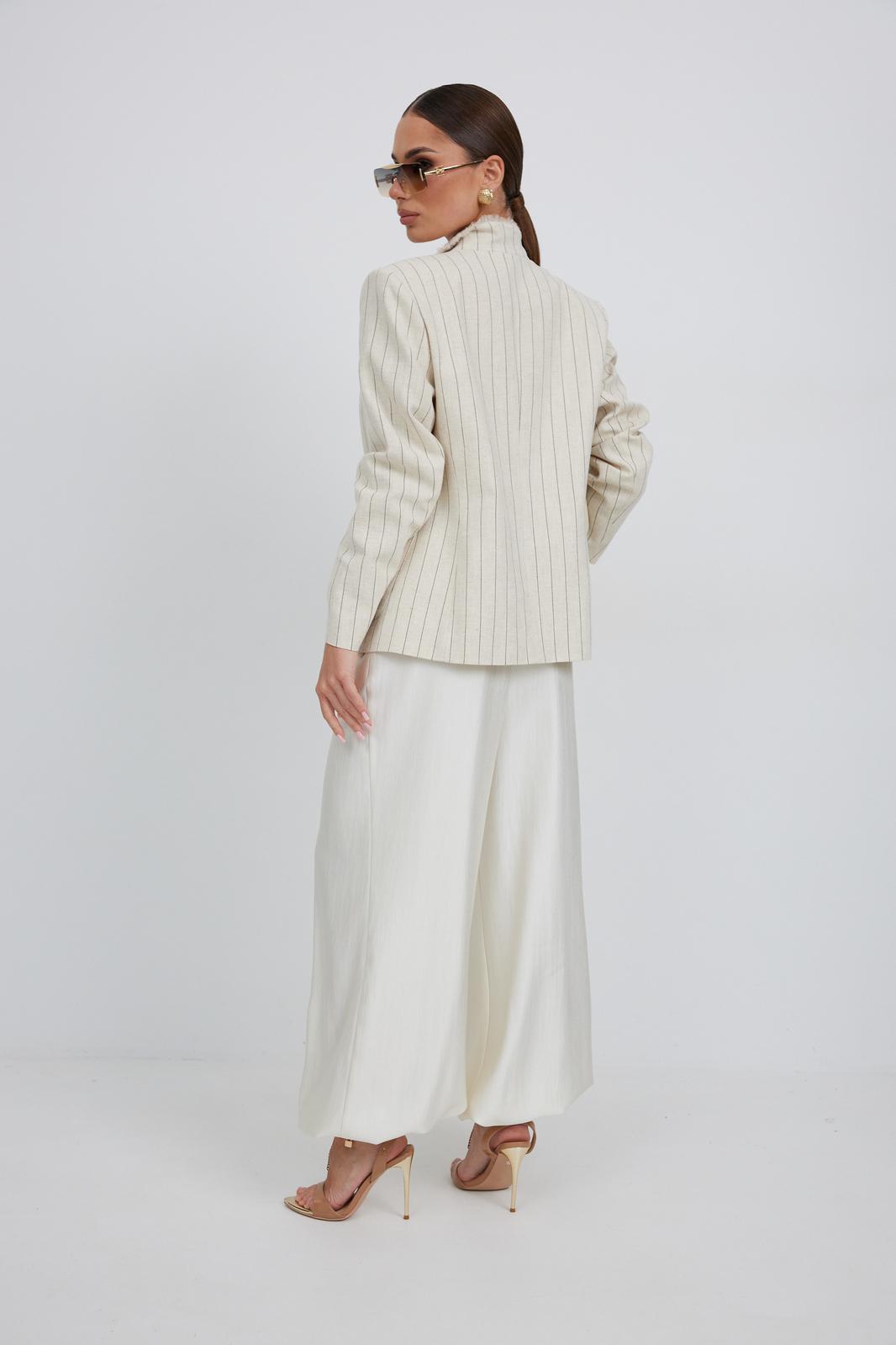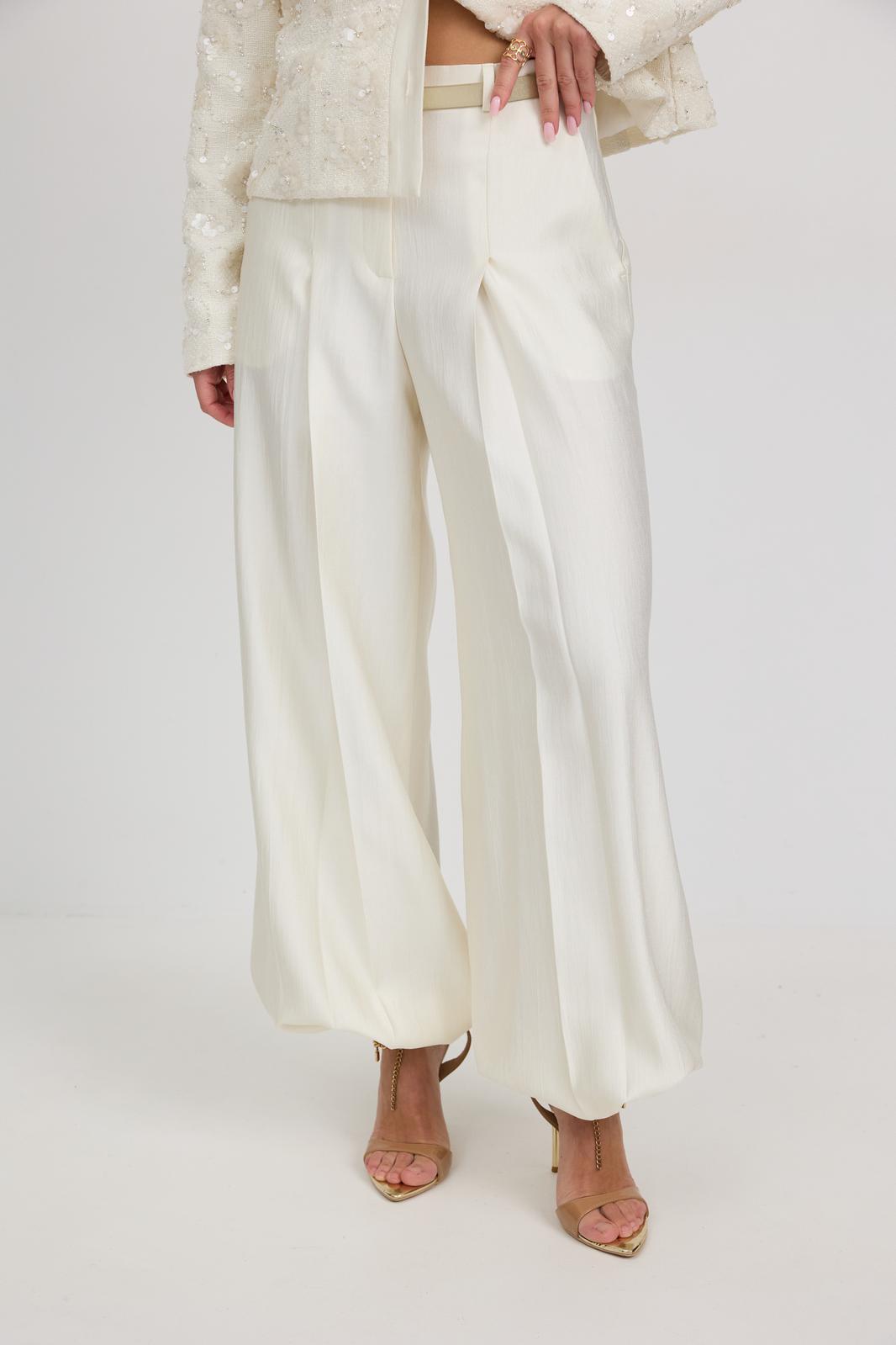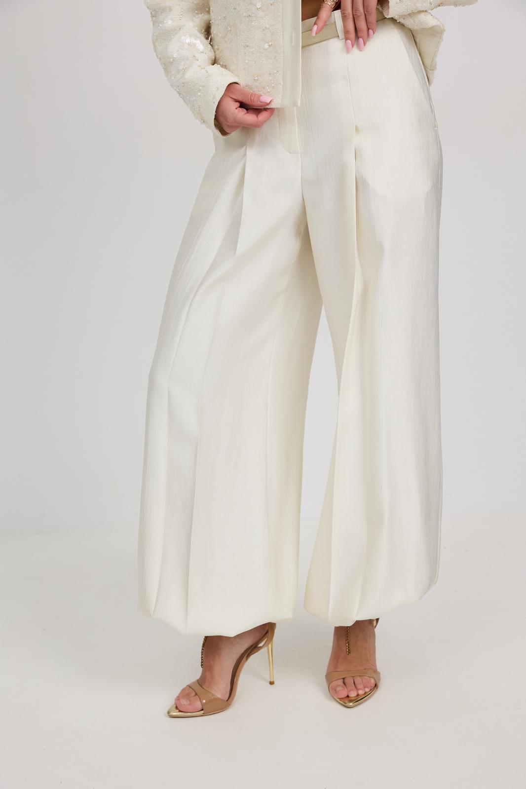 Брюки женские из костюмной ткани с деликатным мерцанием, имеют актуальный крой - «брюки-алладины», собранные на резинку по низу, высокая посадка, пояс притачной со шлевками под ремень, застежка спереди на молнию и пуговицу, боковые карманы в швах, по переду глубокие заутюженные складки, дающие дополнительный объём внизу.