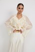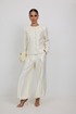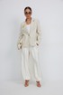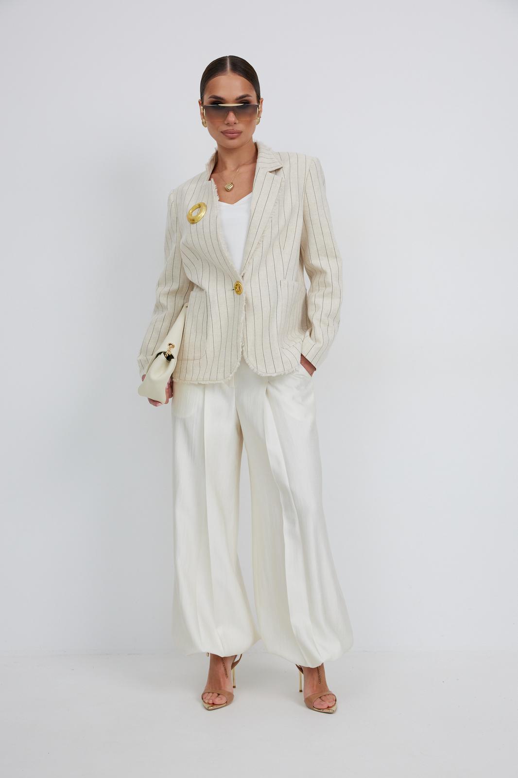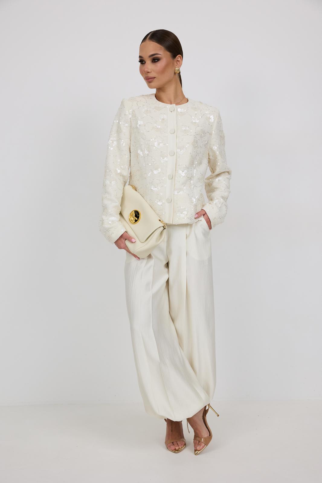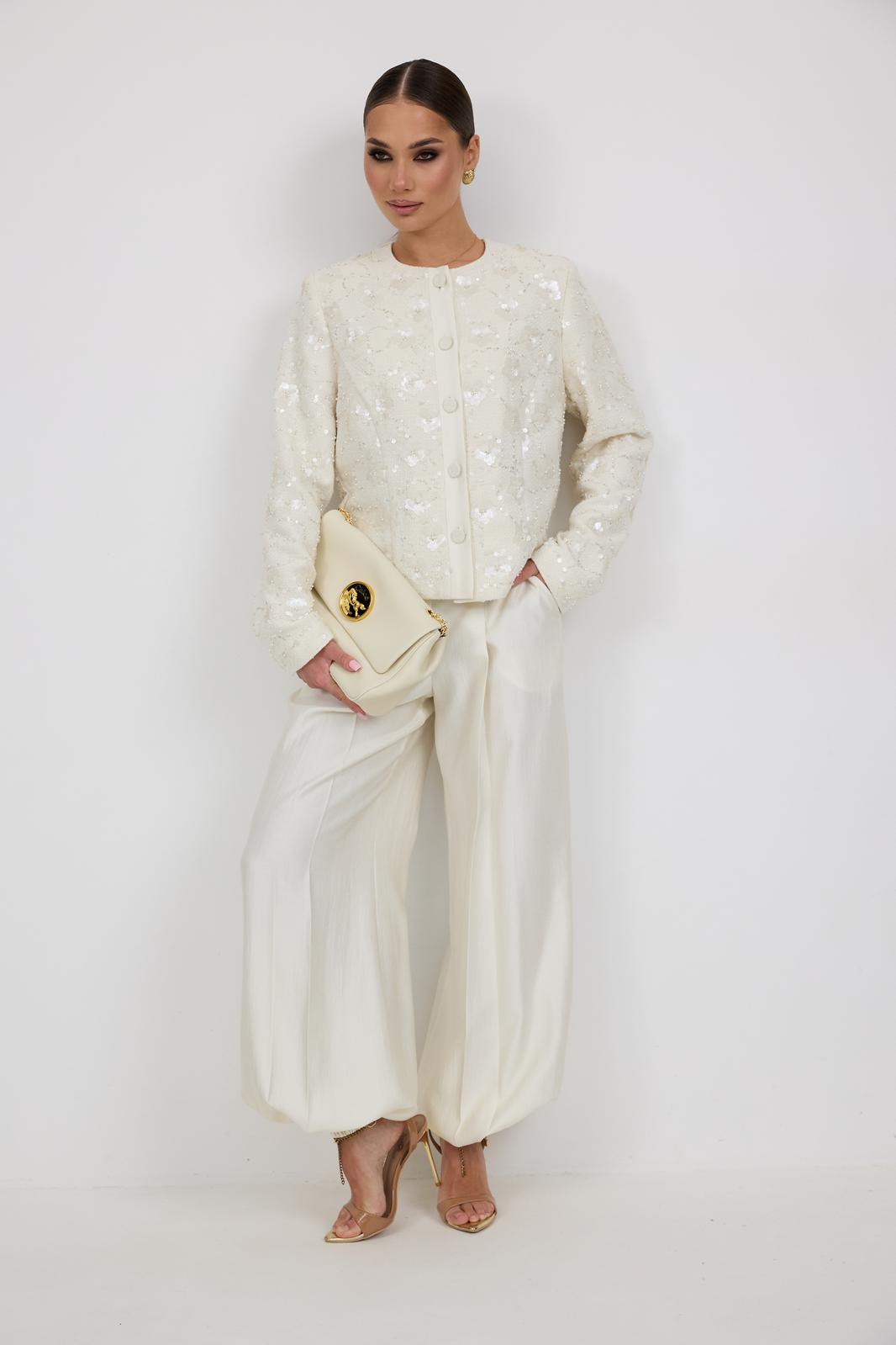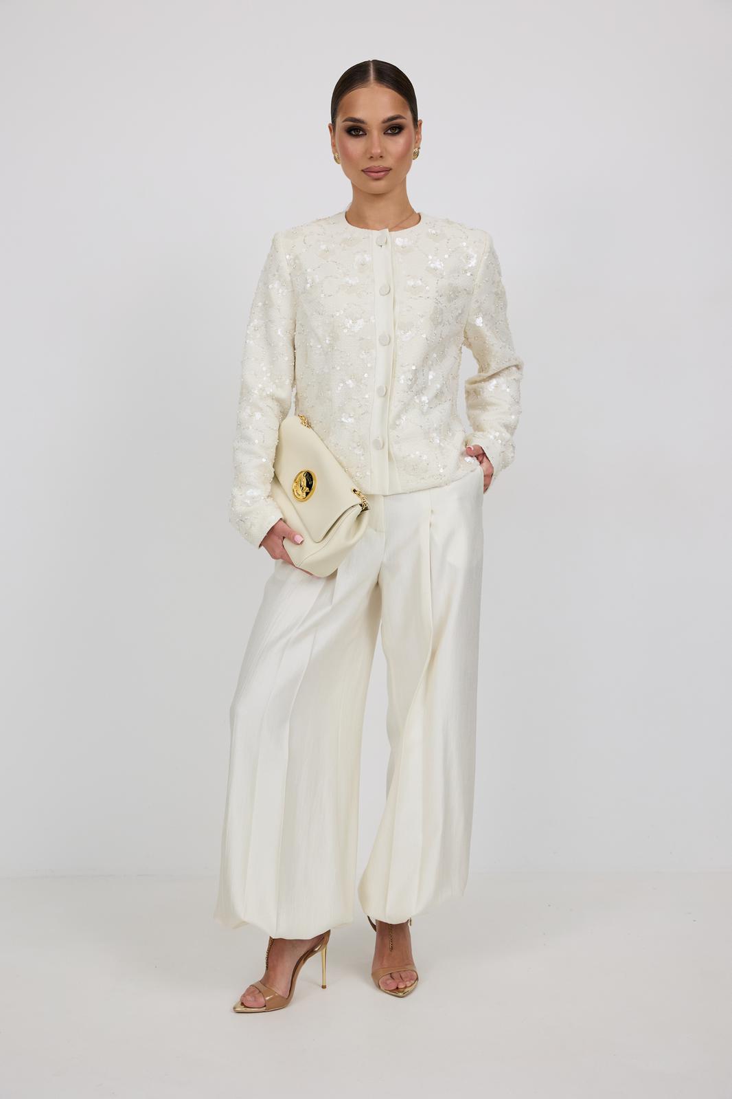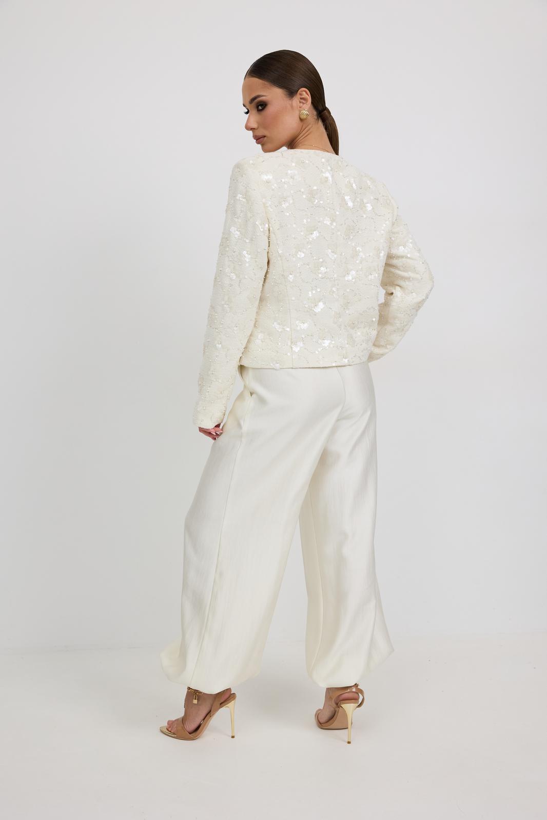 Брюки женские из костюмной ткани с деликатным мерцанием, имеют актуальный крой - «брюки-алладины», собранные на резинку по низу, высокая посадка, пояс притачной со шлевками под ремень, застежка спереди на молнию и пуговицу, боковые карманы в швах, по переду глубокие заутюженные складки, дающие дополнительный объём внизу.