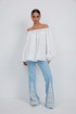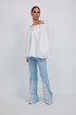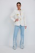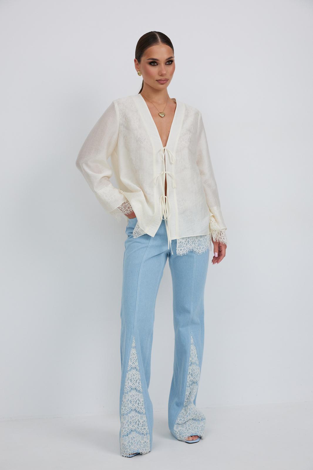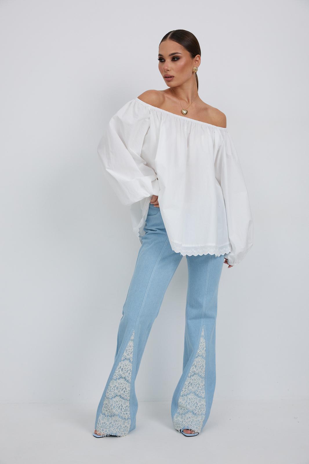Брюки из джинса, прилегающего силуэта, слегка расклешенные к низу. Средняя посадка, пояс притачной, застежка спереди на молнию и пуговицу. По переду боковые карманы, вертикальные швы заканчиваются вставкой из кружева, сзади под кокеткой накладные карманы с кружевной отделкой.