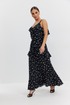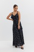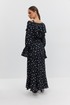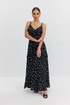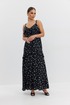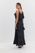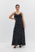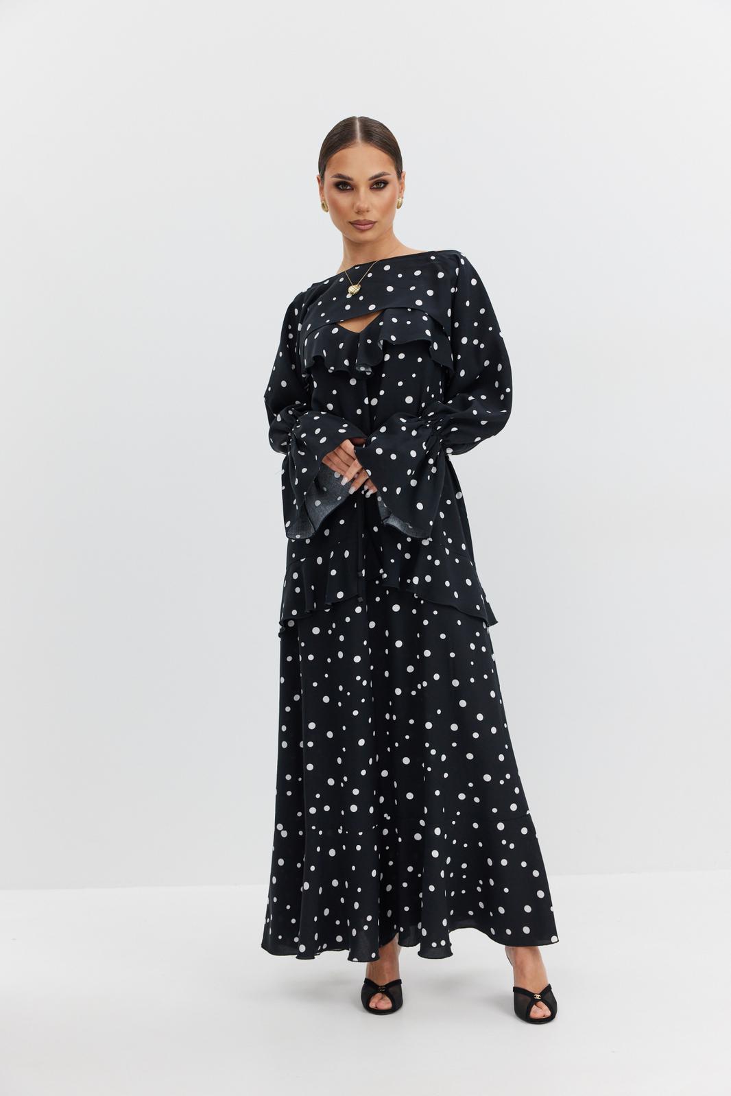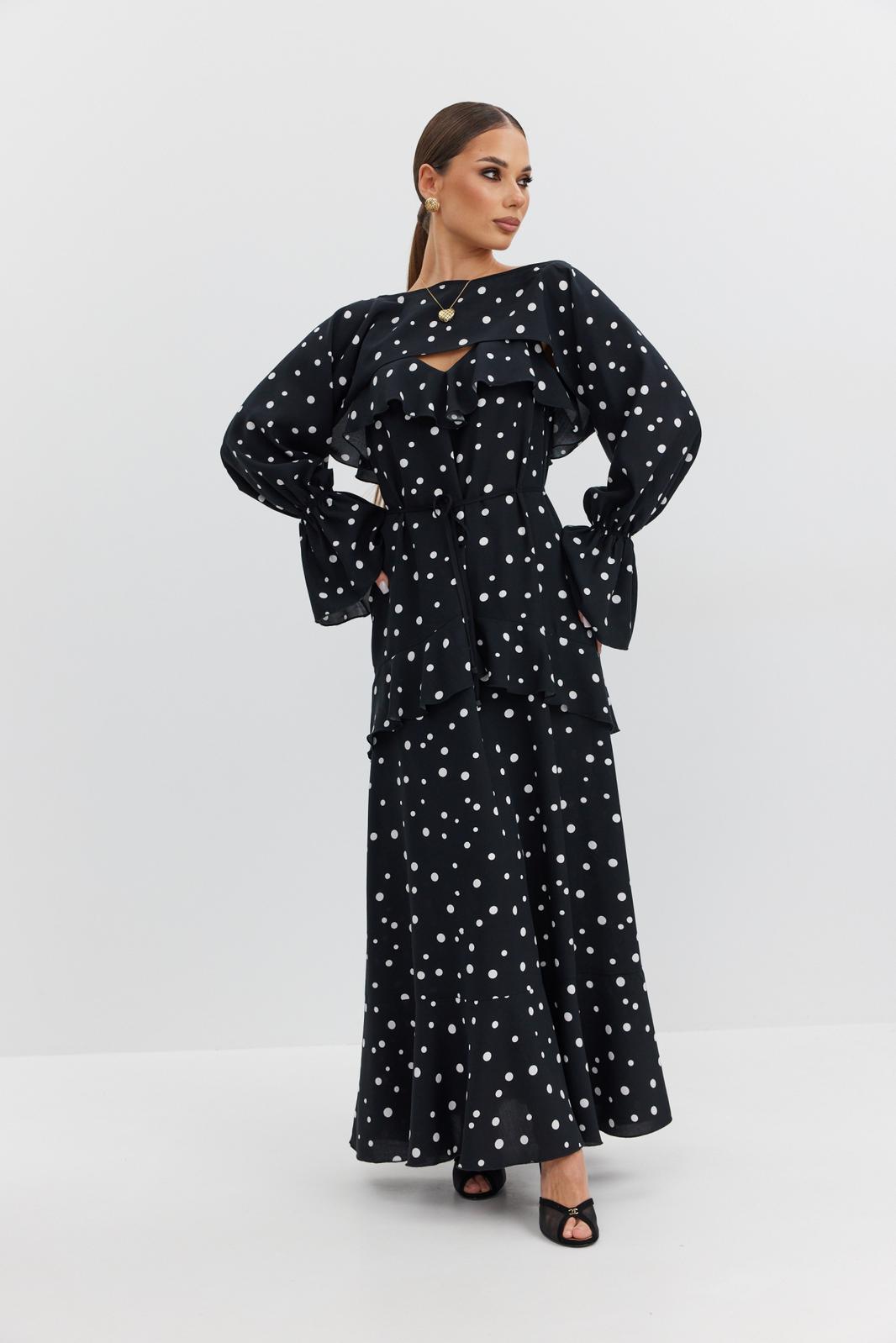 Платье из плательно-блузочной ткани полуприлегающего силуэта на регулируемых бретелях длины «макси» расширенное к низу. Перед и спинка с декоративными воланами. В комплекте накидка с длинным рукавом, закрывающая верхнюю часть лифа. Низ рукава собран в виде волана.